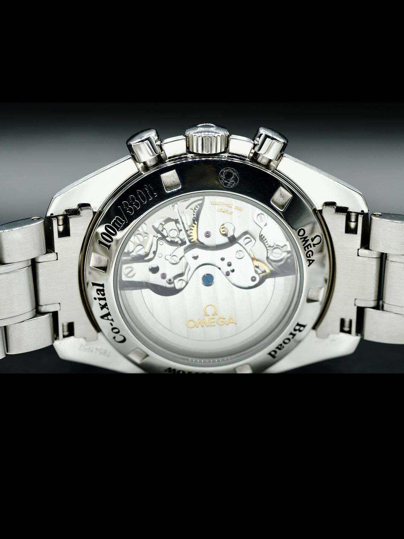 This Omega Speedmaster Broad Arrow features a 42mm stainless steel case with a transparent case back on a stainless steel bracelet. This watch also sports a silver dial with luminous hands and index dial markers covered by scratch resistant sapphire crystal.