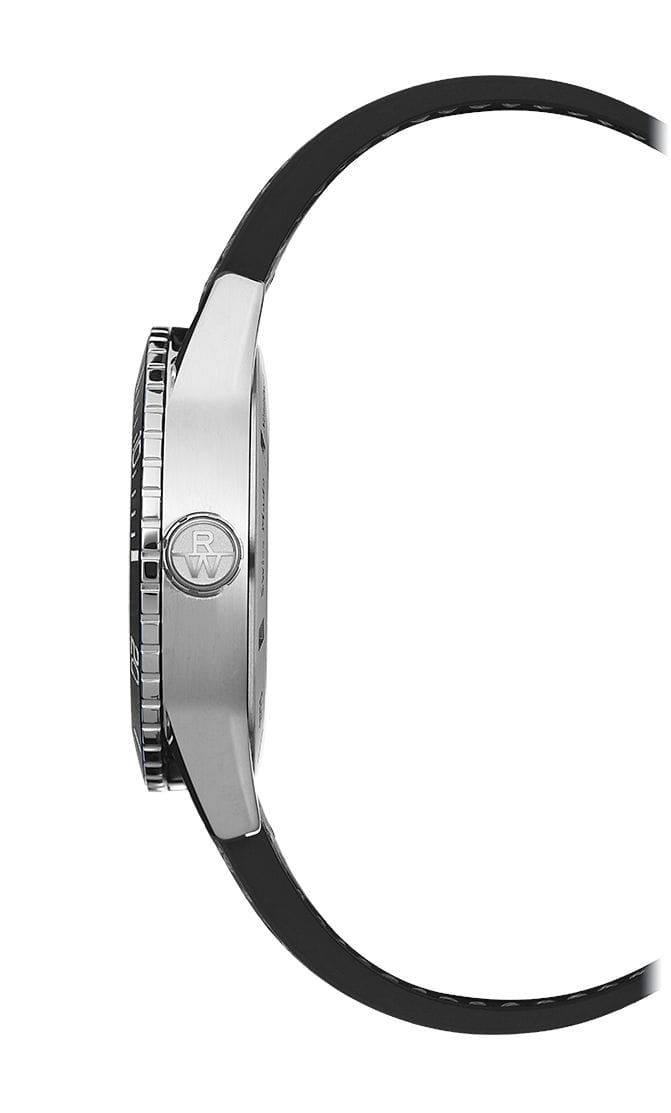 The 42.5mm stainless steel case features a scratch-resistant unidirectional rotating bezel in black ceramic with white graduation and a luminescent indicator. Embossed with the Brand’s signature RW monogram, the screwed-down crown gives the timepiece a water resistance of 300m.