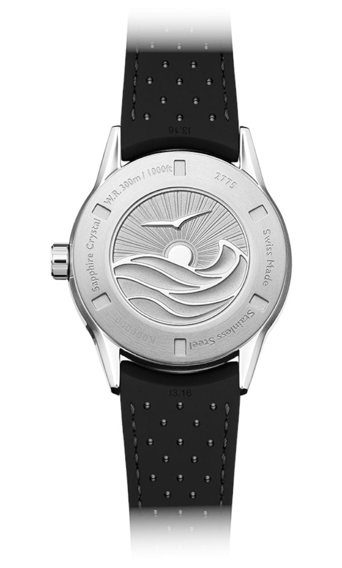 Equipped with a screwed-down case-back, the rear of the watch is engraved with a water landscape, representing the freedom felt on the water and the independent spirit and signature of RAYMOND WEIL.