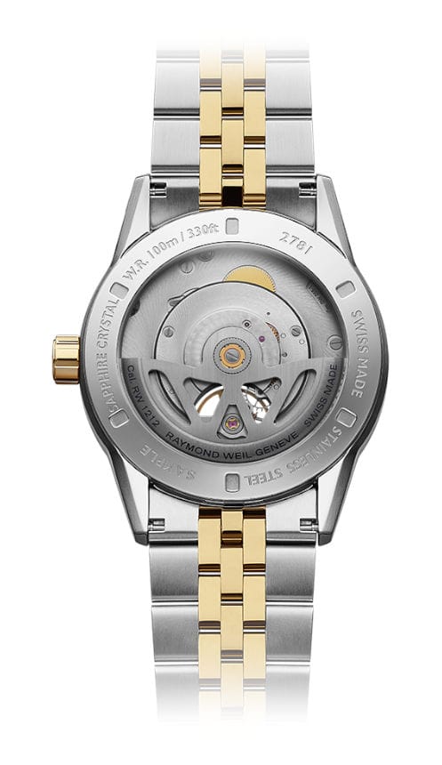 Its oscillating weight is adorned with a “Côtes de Genève” motif and engraved with the RAYMOND WEIL logo. The movement is built in such a way as to showcase its beautiful mechanism on the dial side. The strategic organs positioned above the mainplate and the symmetry of the bridge accentuates the architectural nature of this elegant and beautifully balanced model.