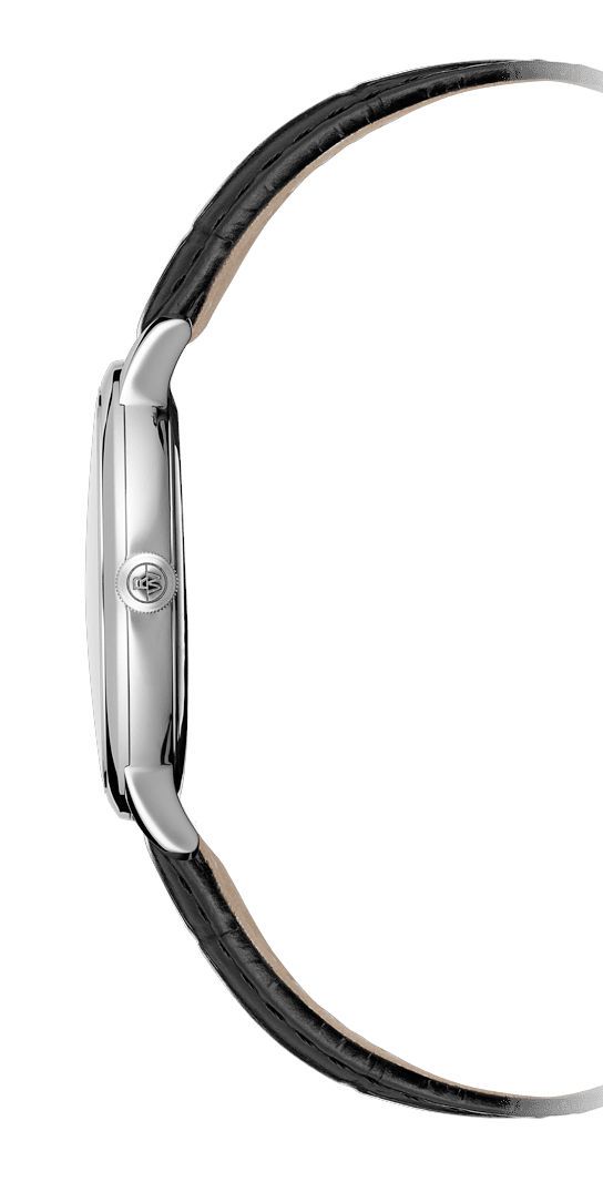 Equipped with a quartz movement, this toccata men’s watch features a sleek stainless steel 39 mm case with a date window at 3 o’clock. The silver lacquered and sunray satin-finished dial is set with applied Roman numeral indexes and has a railway-track chapter ring that aids readability. To complement this modern classic, alligator motifs have been added on the strap.