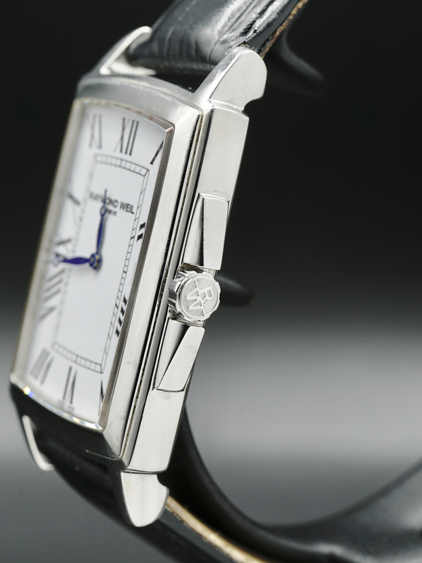 This Raymond Weil features a 40mm x 32mm stainless steel case. This watch also showcases a white dial covered by scratch resistant sapphire crystal.