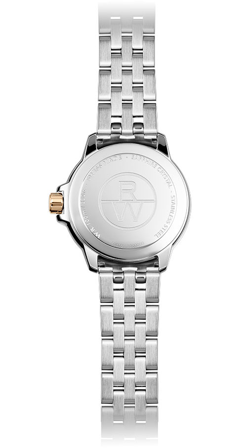 The hours are denoted with slim batons and a central seconds hand has been added for precision. The screwed-down crown, enabling water resistance up to 100m, features the RW monogram.