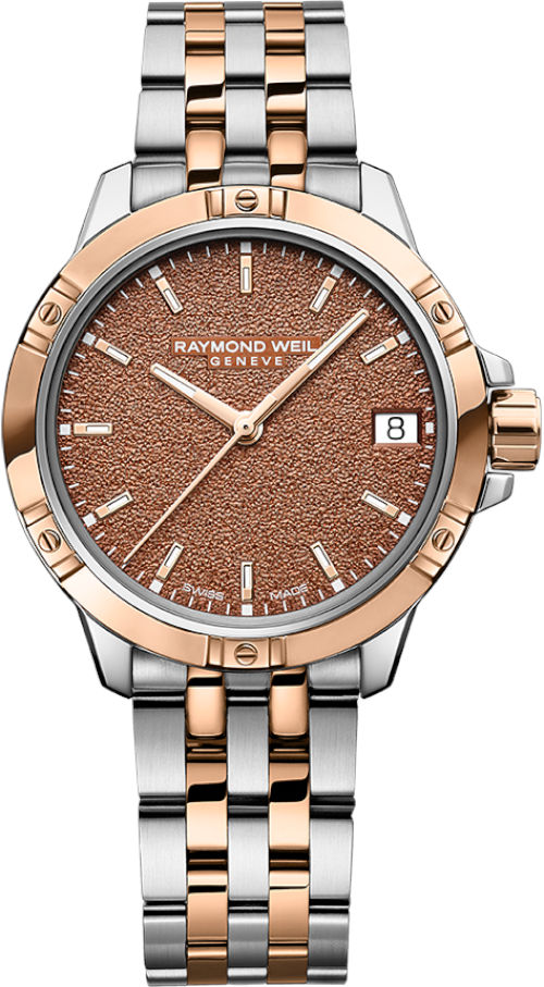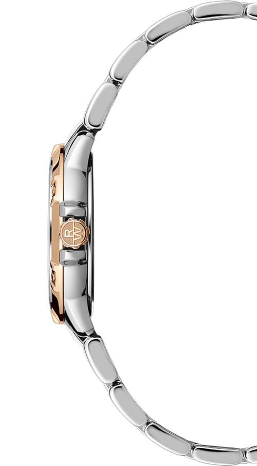 Housed in a 30 mm stainless steel with rose gold PVD plating case, the tango ladies’ timepiece features an ergonomic 5-row bracelet. The bezel is enlivened with six screws, each beautifully framed. Crown protectors are positioned on the right flank of the case.
