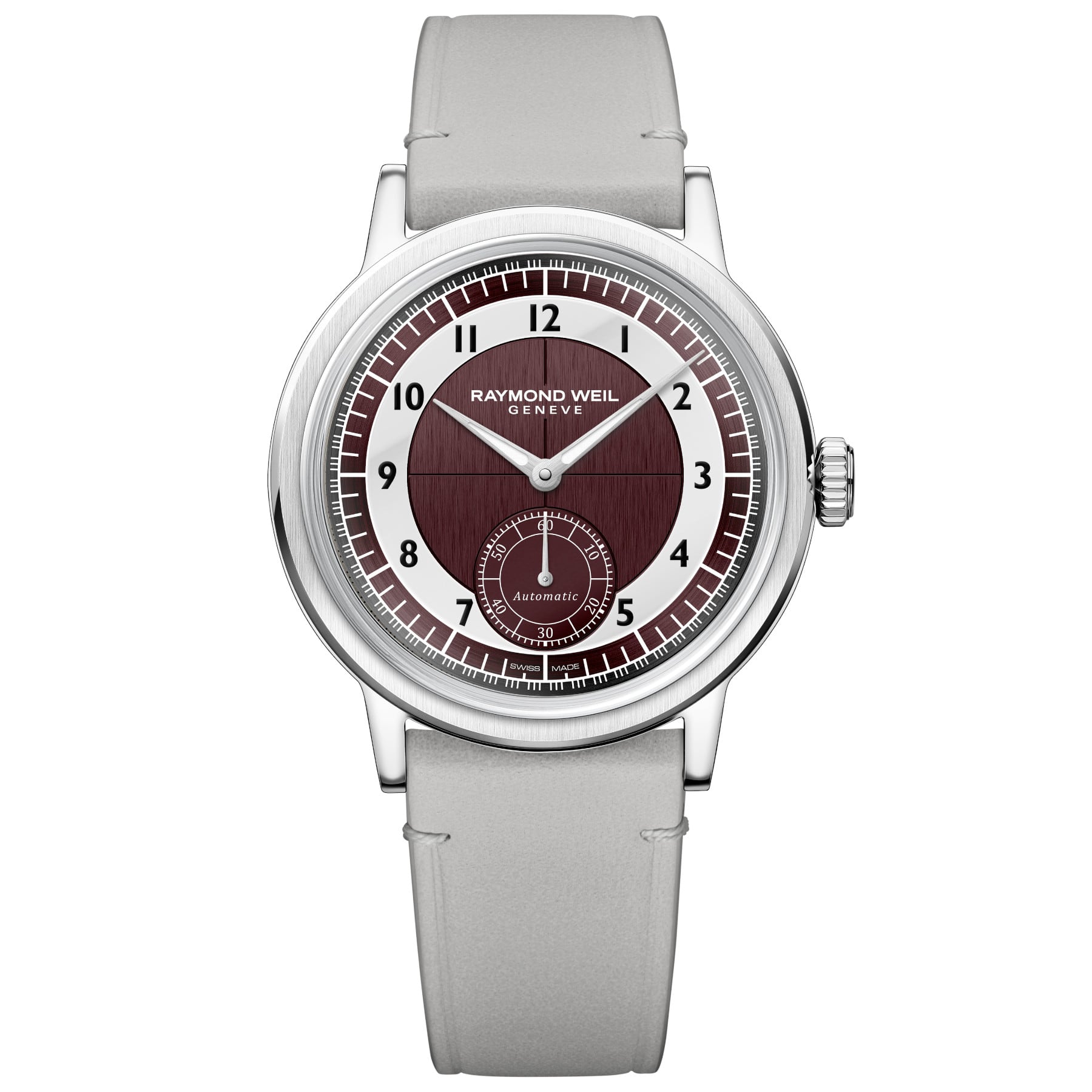With the millesime small seconds, RAYMOND WEIL revisits the Tuxedo dial, a design style experiencing a notable revival, defined by bold, two-tone contrasts and formal elegance.