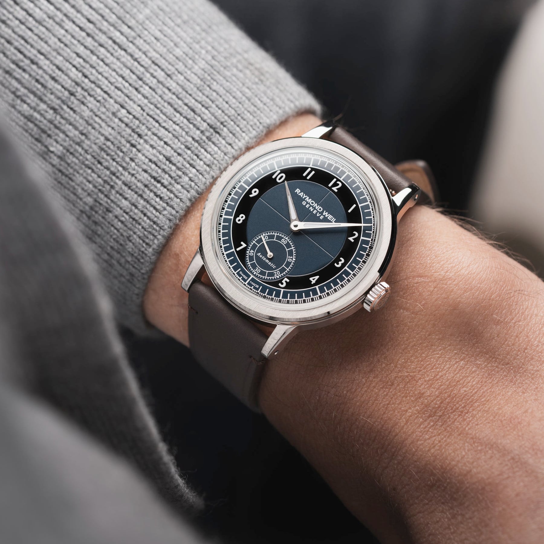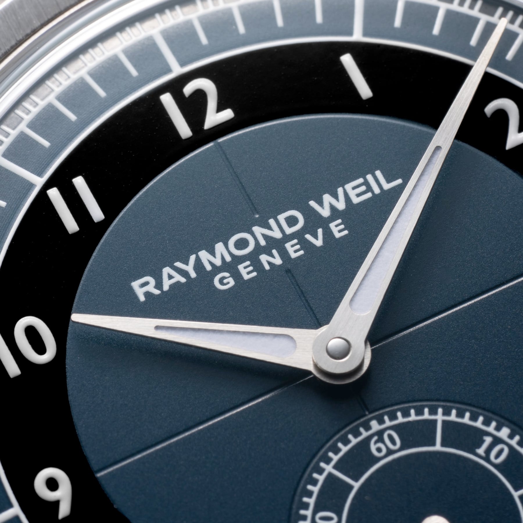 With the millesime small seconds, RAYMOND WEIL revisits the Tuxedo dial, a design style experiencing a notable revival, defined by bold, two-tone contrasts and formal elegance.