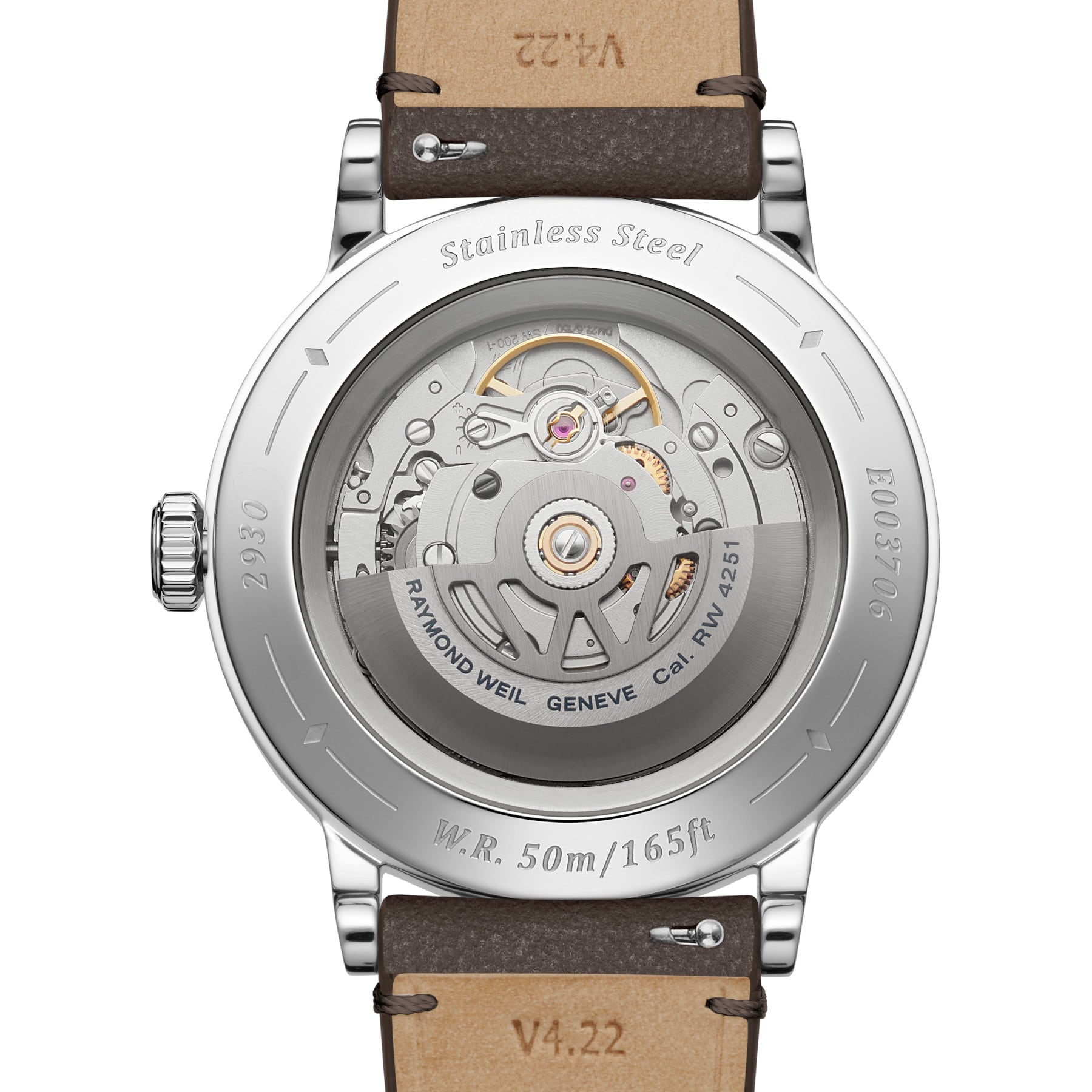 This timepiece is housed in a slender 39 mm stainless steel case with elegant, balanced proportions. The bezel features a vertical satin-brushed finish set against a delicately polished chamfer, highlighting the Maison’s attention to detail through the interplay of textures. A transparent case back reveals the automatic movement and the W-shaped oscillating weight, a signature element of RAYMOND WEIL watchmaking, delivering a 41-hour power reserve. The genuine calfskin strap is finished with a discreet W-shaped stitch, reinforcing the brand’s identity.