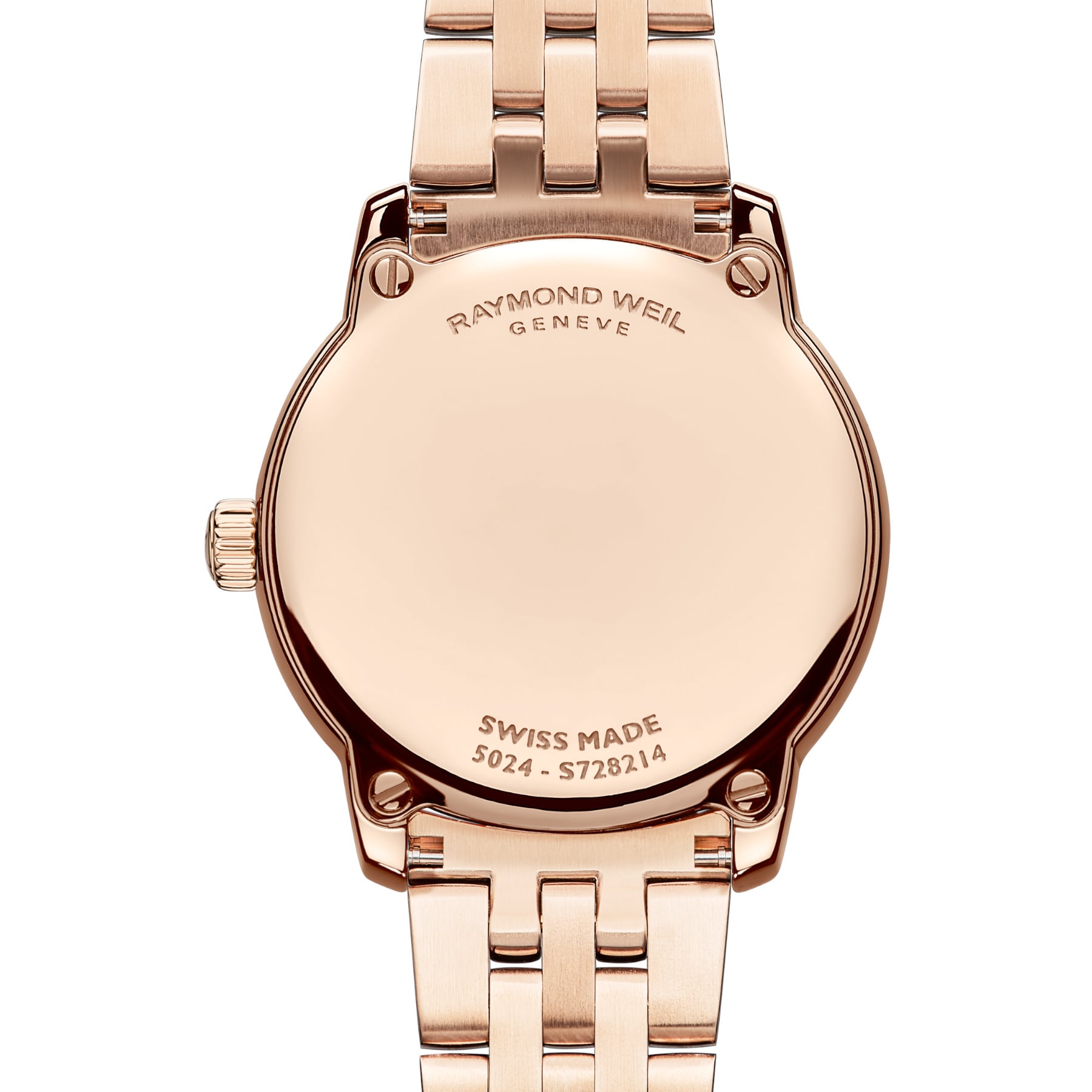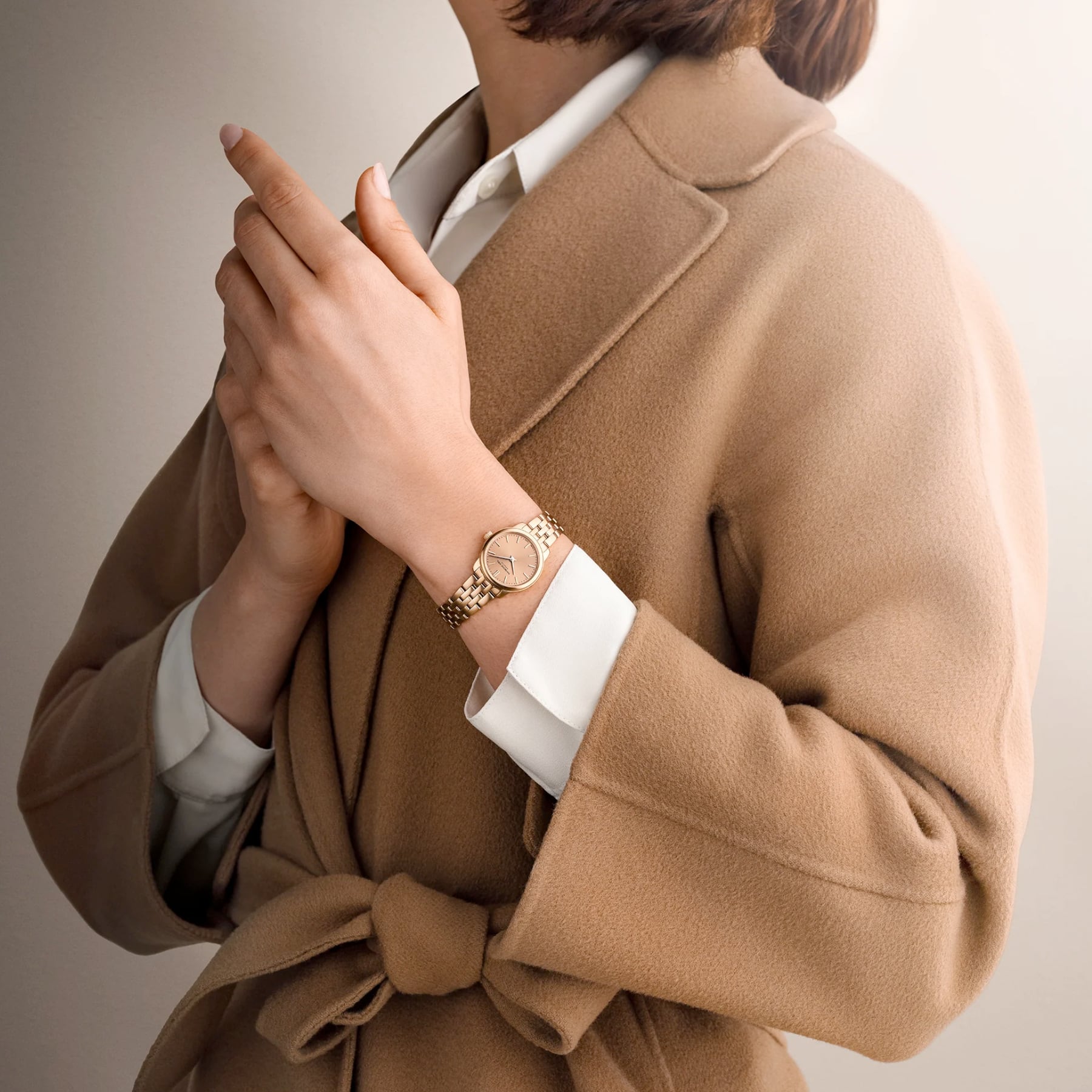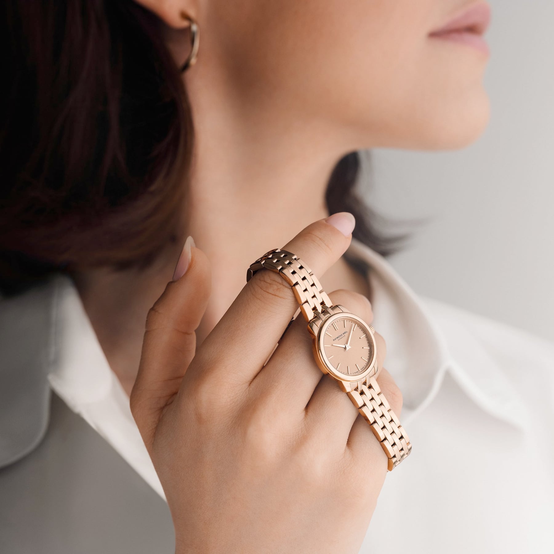 Featuring a rose gold PVD 24 mm diameter round case set and a refined sunrayed dial, this elegant toccata embraces delicate proportions with subtle sophistication. Inspired by its larger counterparts, it features a redesigned bracelet and a pure, non-date display, enhancing its harmonious aesthetic. This classic ladies’ toccata demonstrates that true beauty endures over time.