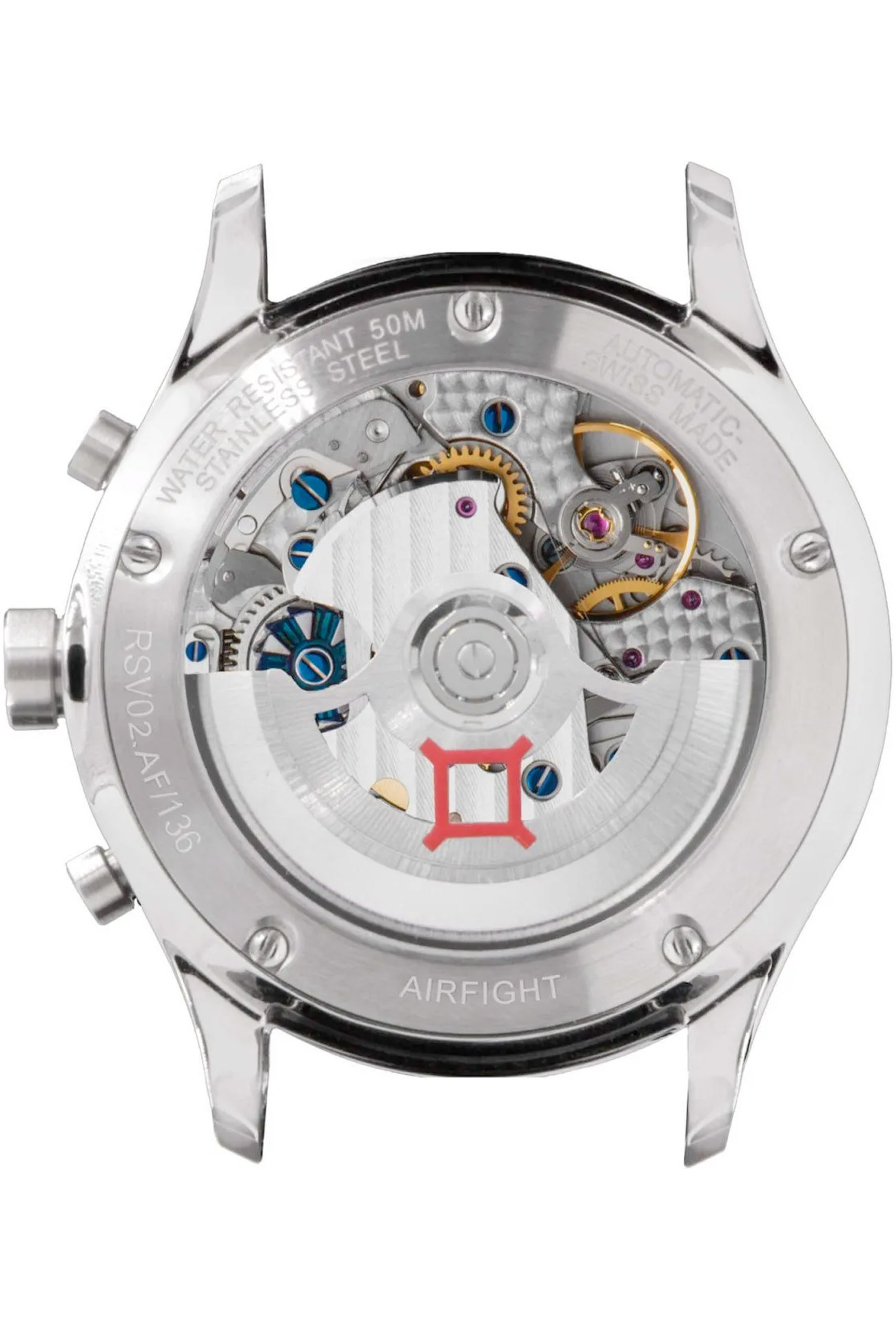 The watch is powered by the watchmaking caliber RSV-Bi120: a manufacture bi-retrograde chronograph movement, automatic mechanical winding, and column wheel (base LJP-L1C0).