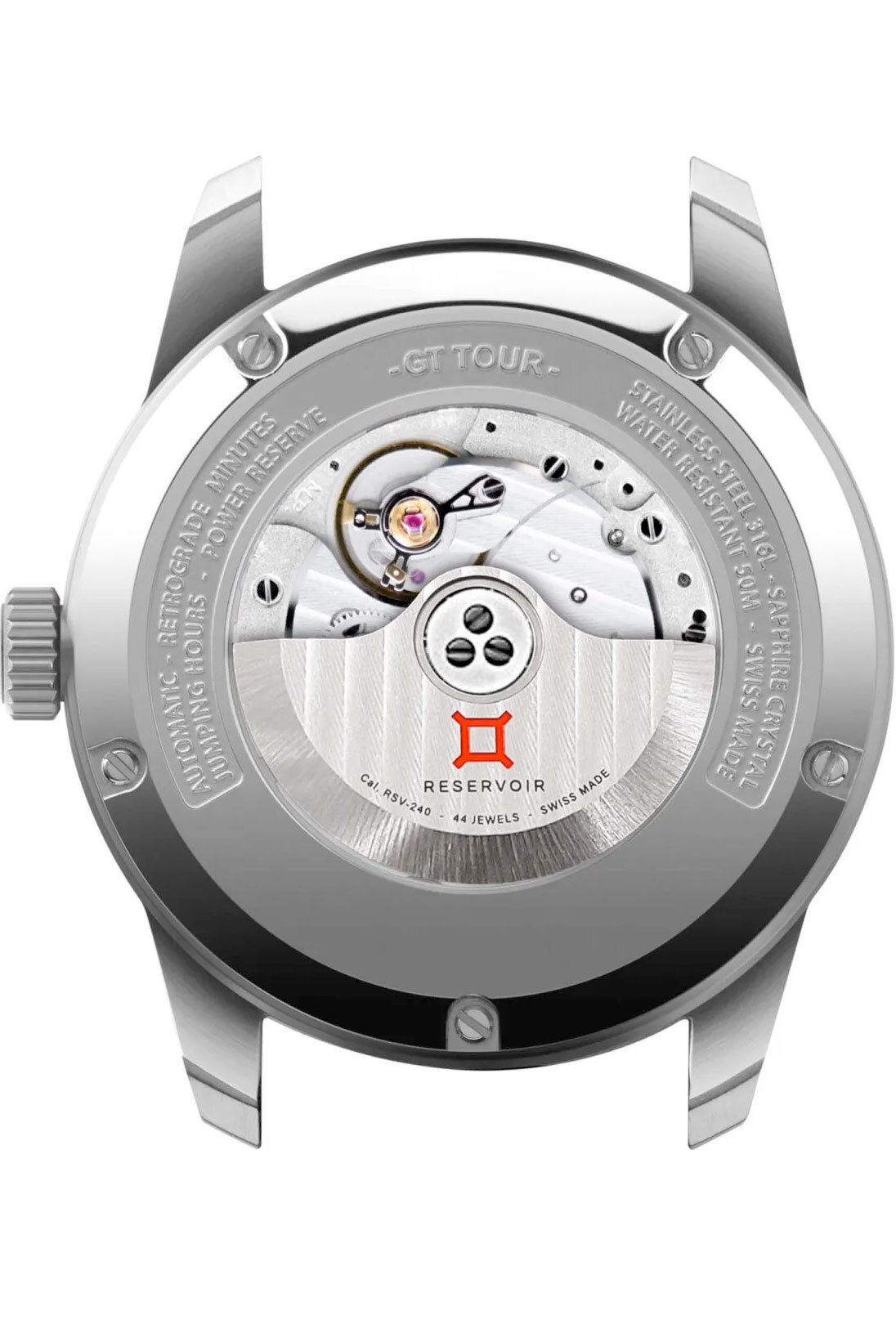 Powered by the new caliber RSV-240, a proprietary patented three-complication module coupled to a manufacture movement (LJP-G100 base), combining retrograde minute, jumping hour and a 56-Hour power reserve.
