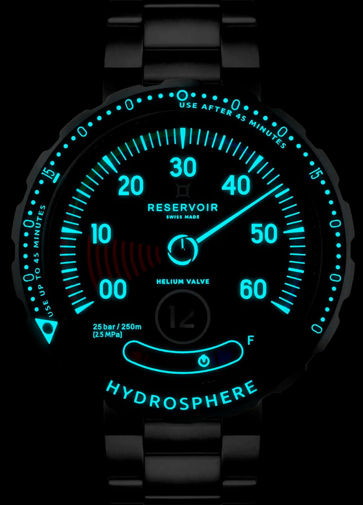 An unidirectional ceramic rotating bezel with double graduation, helium valve, a 316L stainless steel case watertight up to 250m, a black dial, a power indicator, mounted on stainless steel bracelet with an extension system, the HYDROSPHERE watch asserts its uniqueness with a single hand on the dial for a radical reading of the time.