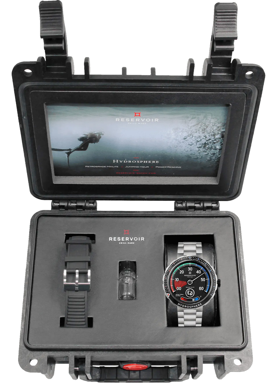 Sealed on the wrist, the HYDROSPHERE watch bearsthe effigy of scuba diving manometers, the first survival instruments for divers.