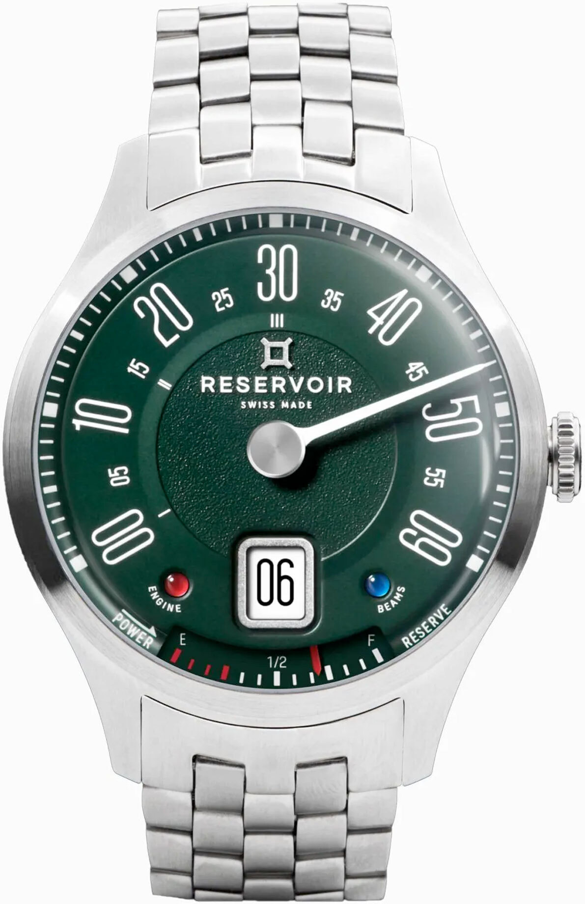 Two precious stones, tourmaline and sapphire, on the green dial, symbolize the light indicators and full headlights of vintage counters.