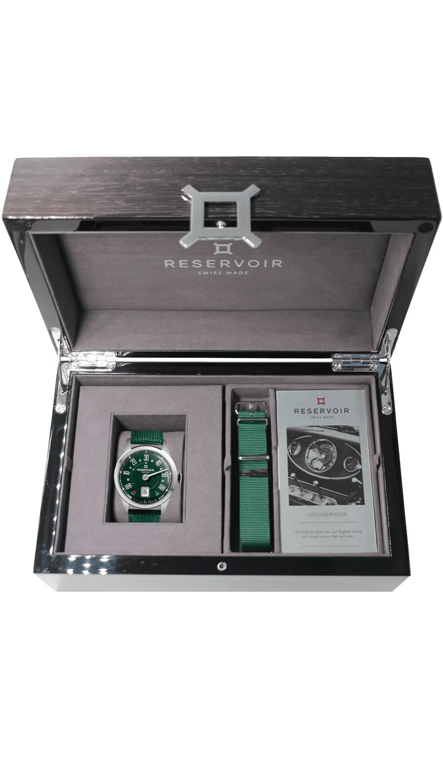 Two precious stones, tourmaline and sapphire, on the green dial, symbolize the light indicators and full headlights of vintage counters.Delivered in a prestigious wooden box with an additional NATO strap.