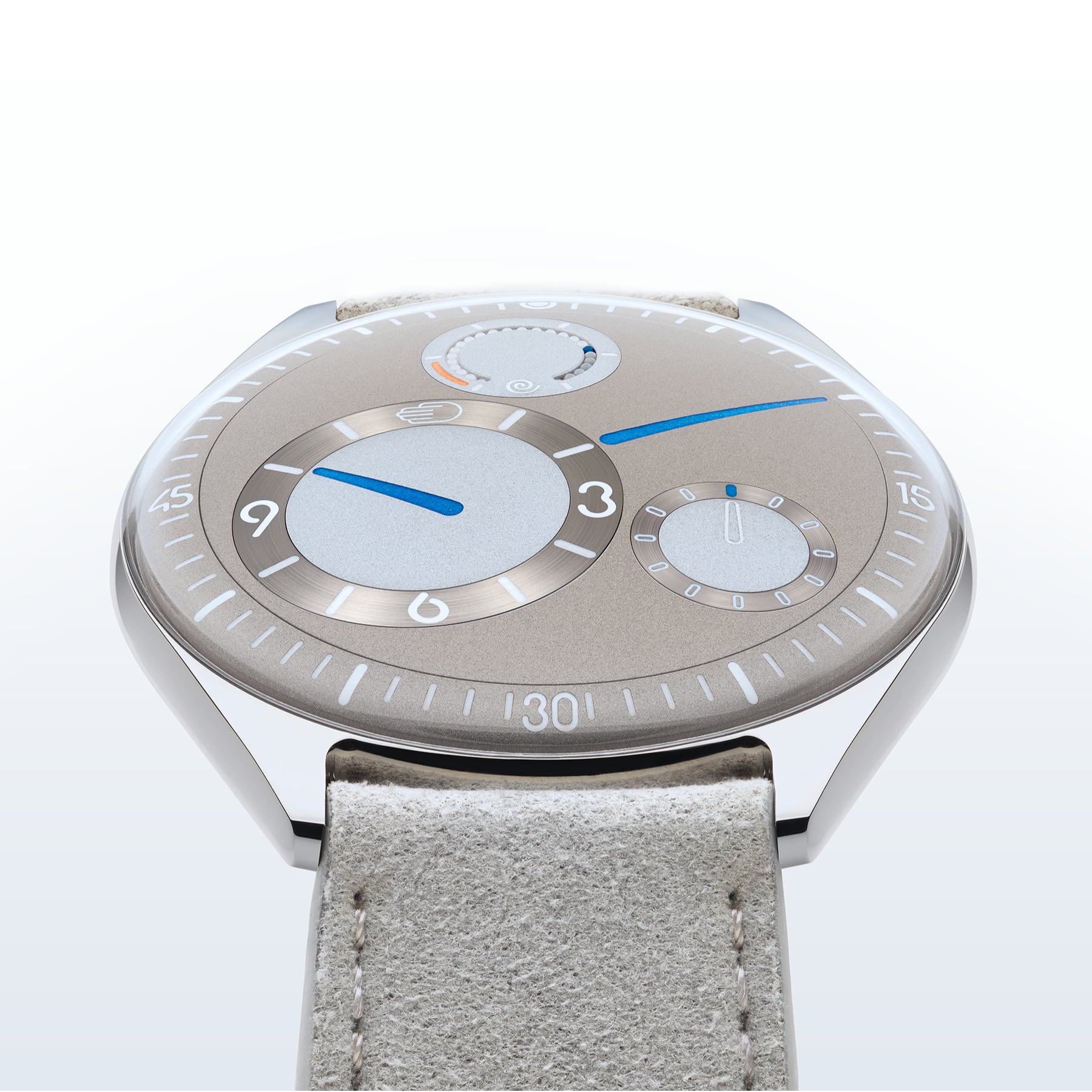 At its core is a brand milestone: the Ressence Werk RW-01, the first movement designed and developed by Ressence. Configured specifically to power the ROCS - the patented Ressence Orbital Convex System - it creates a true integration between powerhouse and display. Its distinctive triangular architecture is defined by three circles — two barrels and a central reference balance wheel — echoing the motif of a Ressence dial.