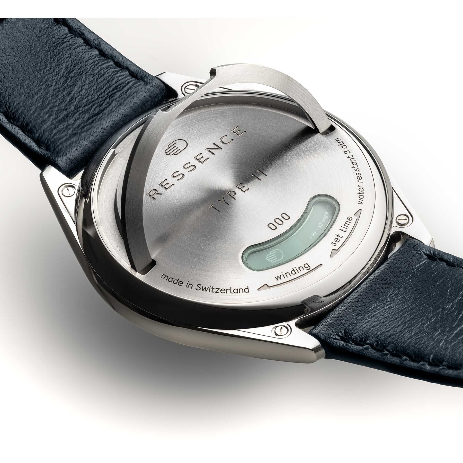The TYPE 11 is Ressence's most complete watch. It features a patented power-reserve indication, a patented time display, a caseback window to observe the movement, a caseback lever for manual winding and time-setting, and 3 ATM water resistance.
