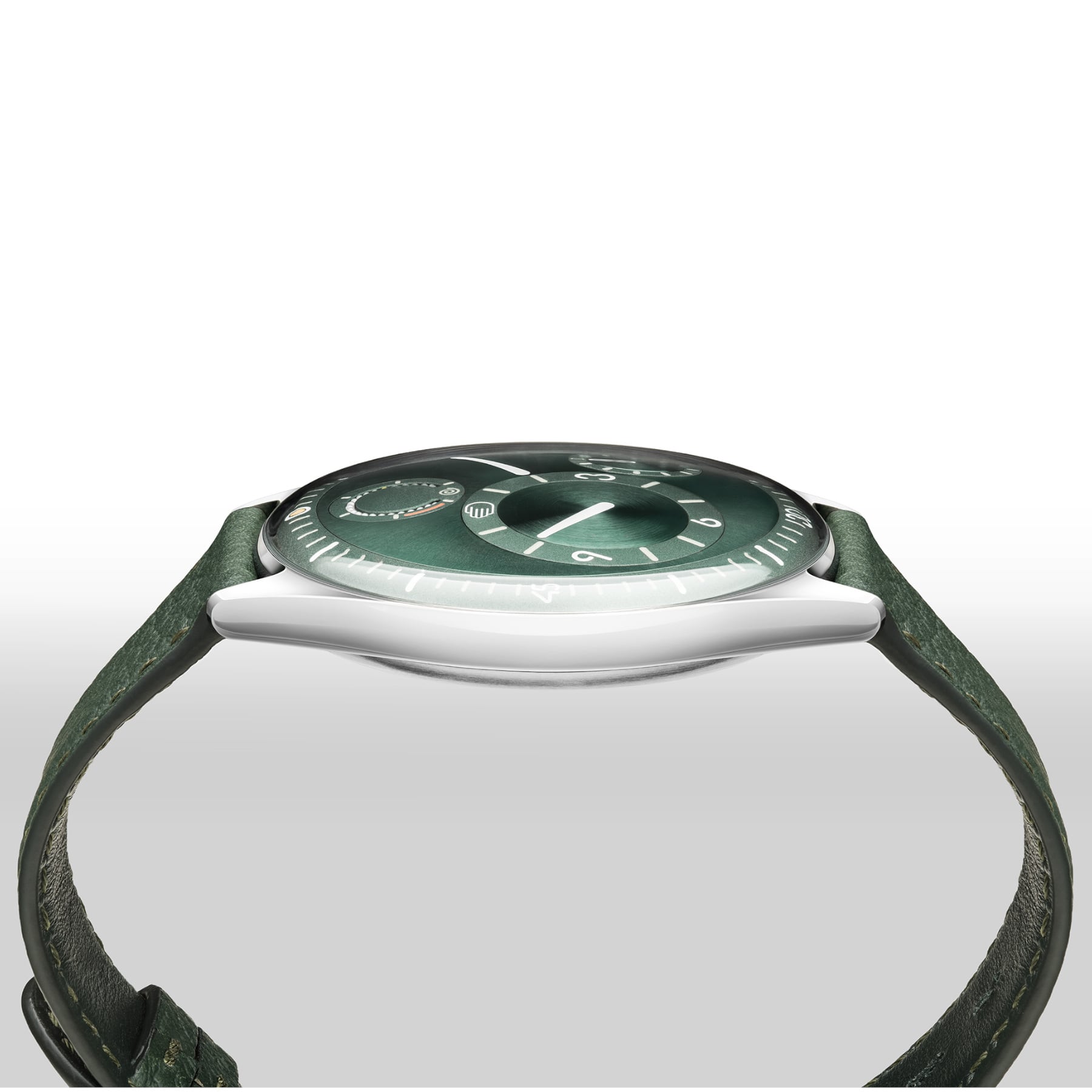 • This timepiece features a 41mm titanium case paired with a high quality leather strap. It showcases a distinctive green dial and is powered by a precise manual winding movement. The watch is designed with a water resistance of up to 30m.