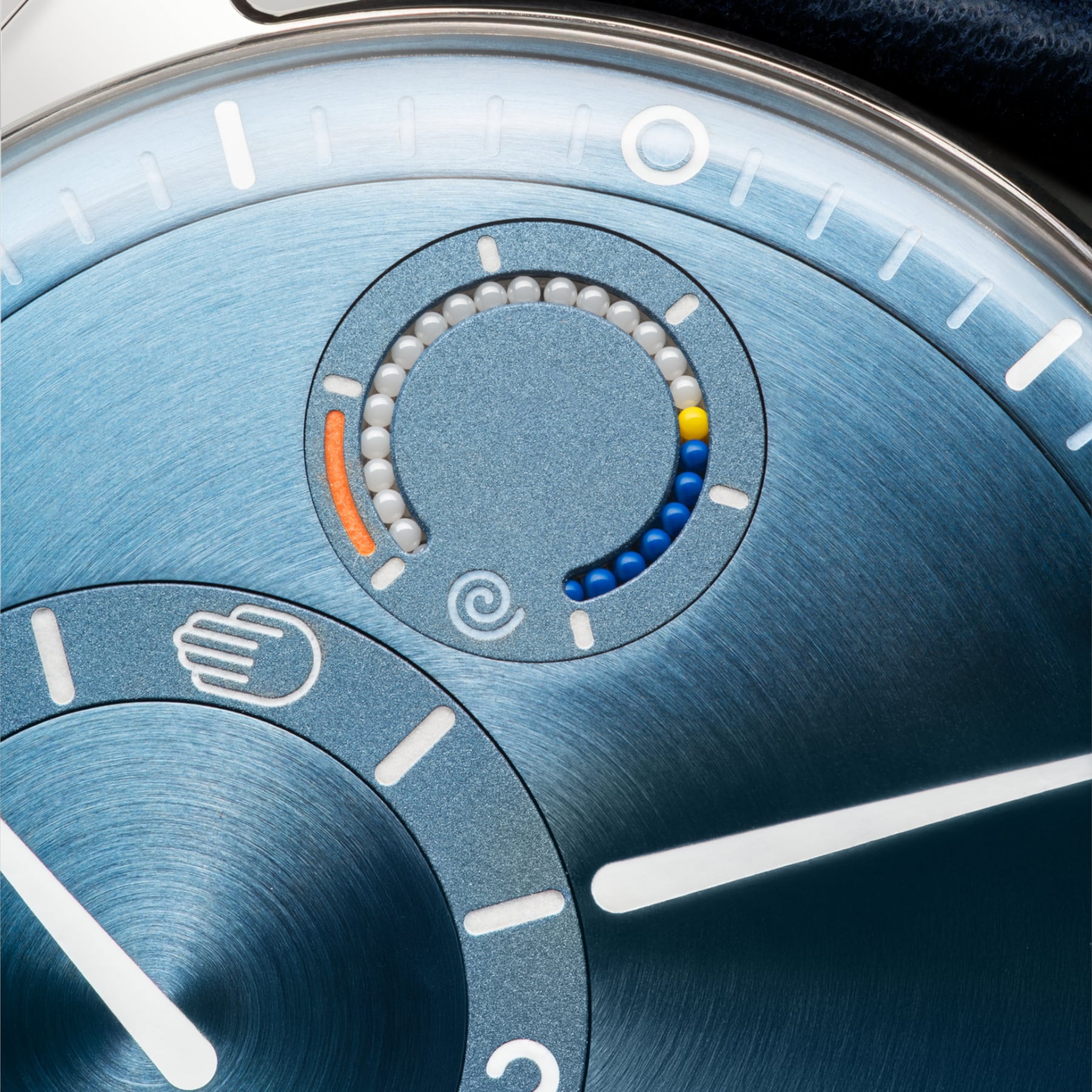 To keep track of power levels, Ressence developed a patented indication using ceramic micro-balls: a string of micro-balls in two contrasting tones that provide an intuitive visual gauge. As the movement winds, the lighter balls progressively emerge while the darker ones recede. When the watch is at rest and power depletes, the process reverses.