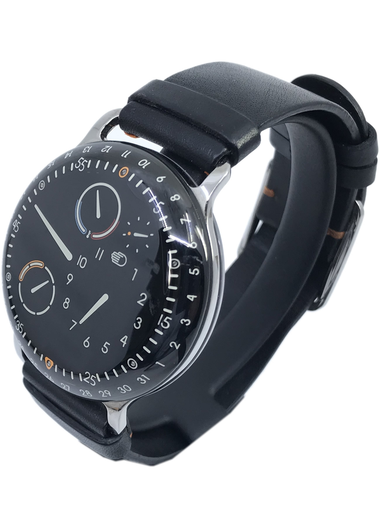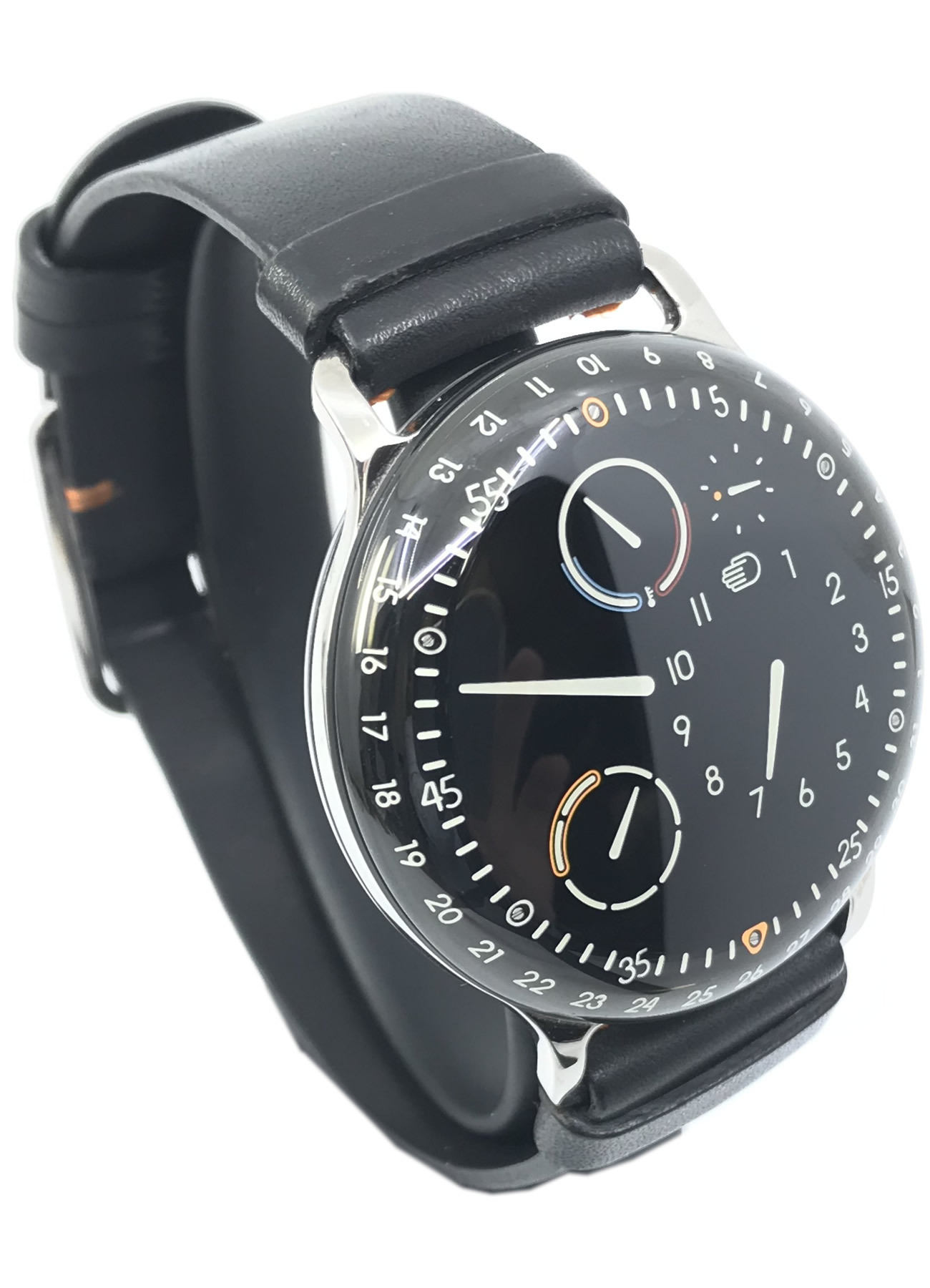 The Ressence Type 3 transports time from the dial to the crystal. The orbiting indications are bathed in a fluid that refracts light like air, so that the indications appear to be displayed directly onto the sapphire crystal closer to the eye of the beholder. The high-contrast white indicators against the black dial appear to be projected onto the top crystal as if onto a screen. Type 3 offers a tangible feeling of being able to touch time itself.