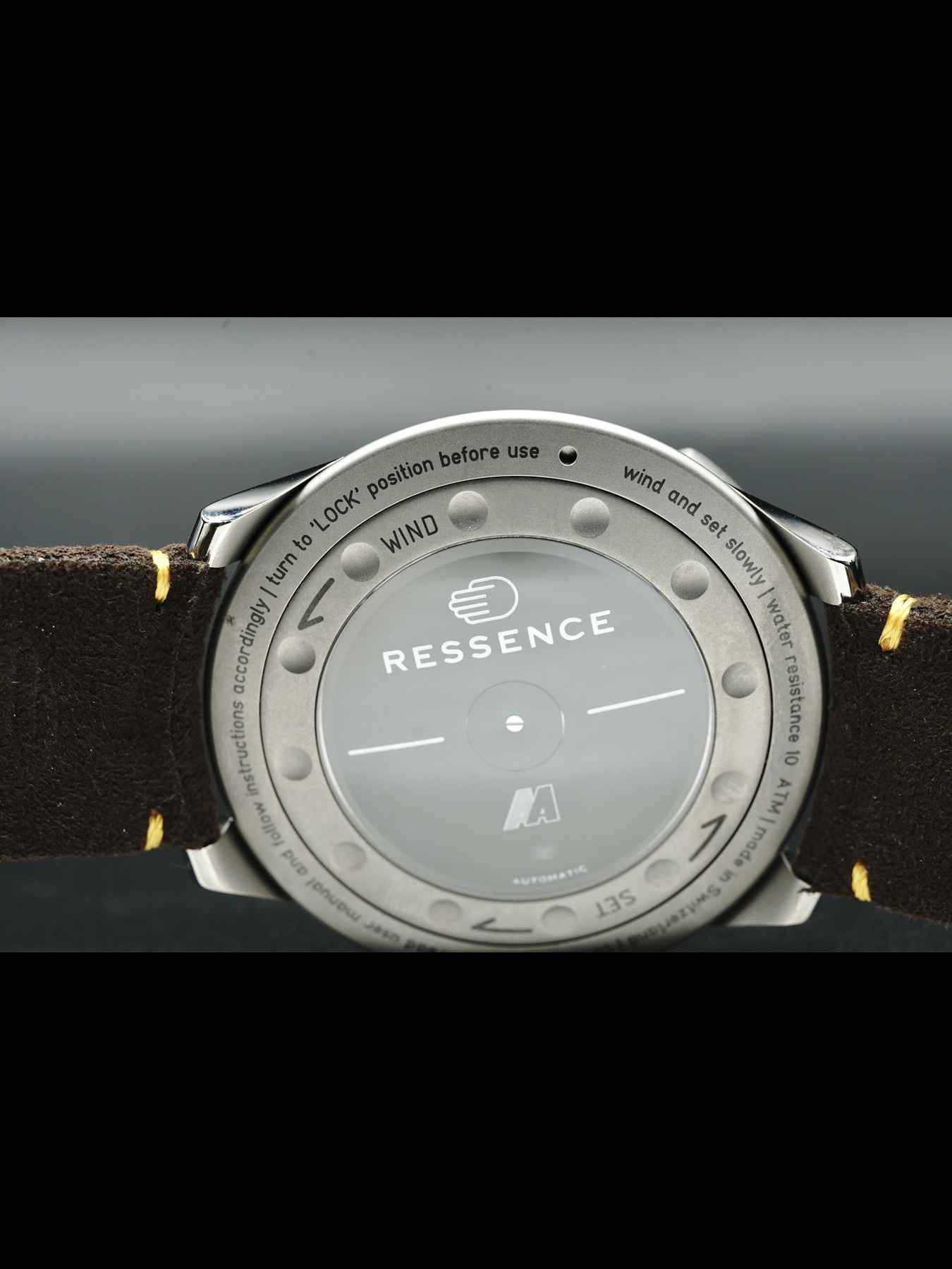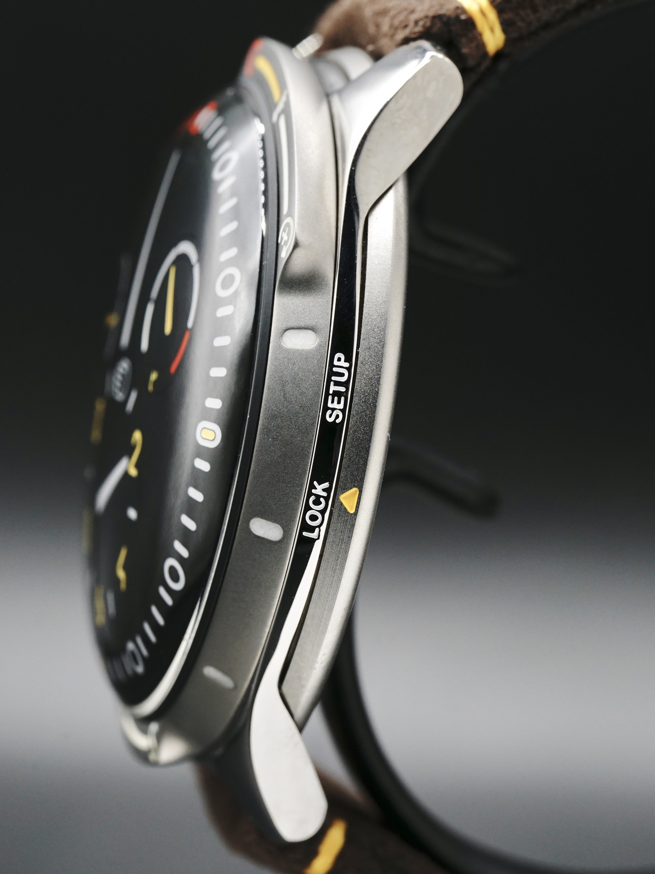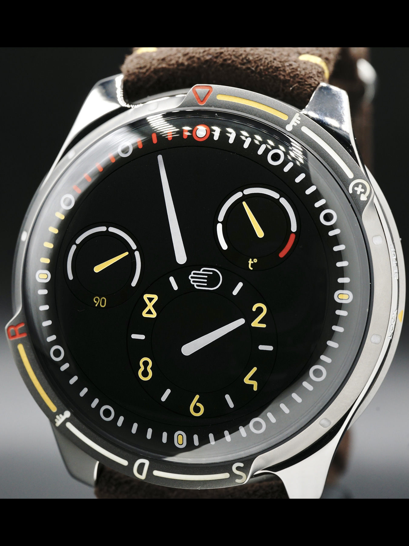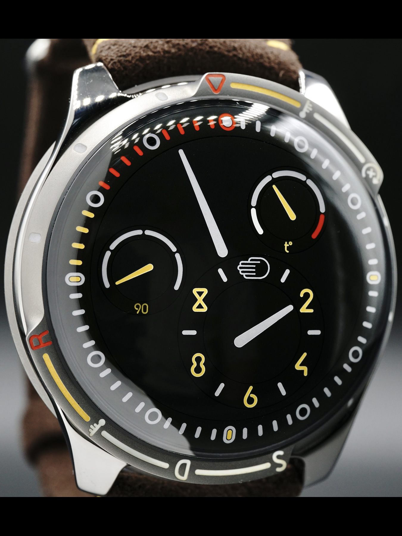 The bezel on the Type 5X is a prominent part of the design. The markings on the bezel are original and directly related to the collaboration with Automobili Amos and the functioning of the turbos. This adjustment was key when considering the focus of being more conscious of the passage of time. The bezel is divided into two distinct parts. The first one is dedicated to the warmup of the engine (15min) - the S stands for Start, D for Drive and R for Race - while the other one is dedicated to the cooling of the Turbos (10 min). Like all rituals in life, from coffee to journaling, this is a distinct process which provides a new framework for drivers to prepare and decompress from races - on the track and in life.