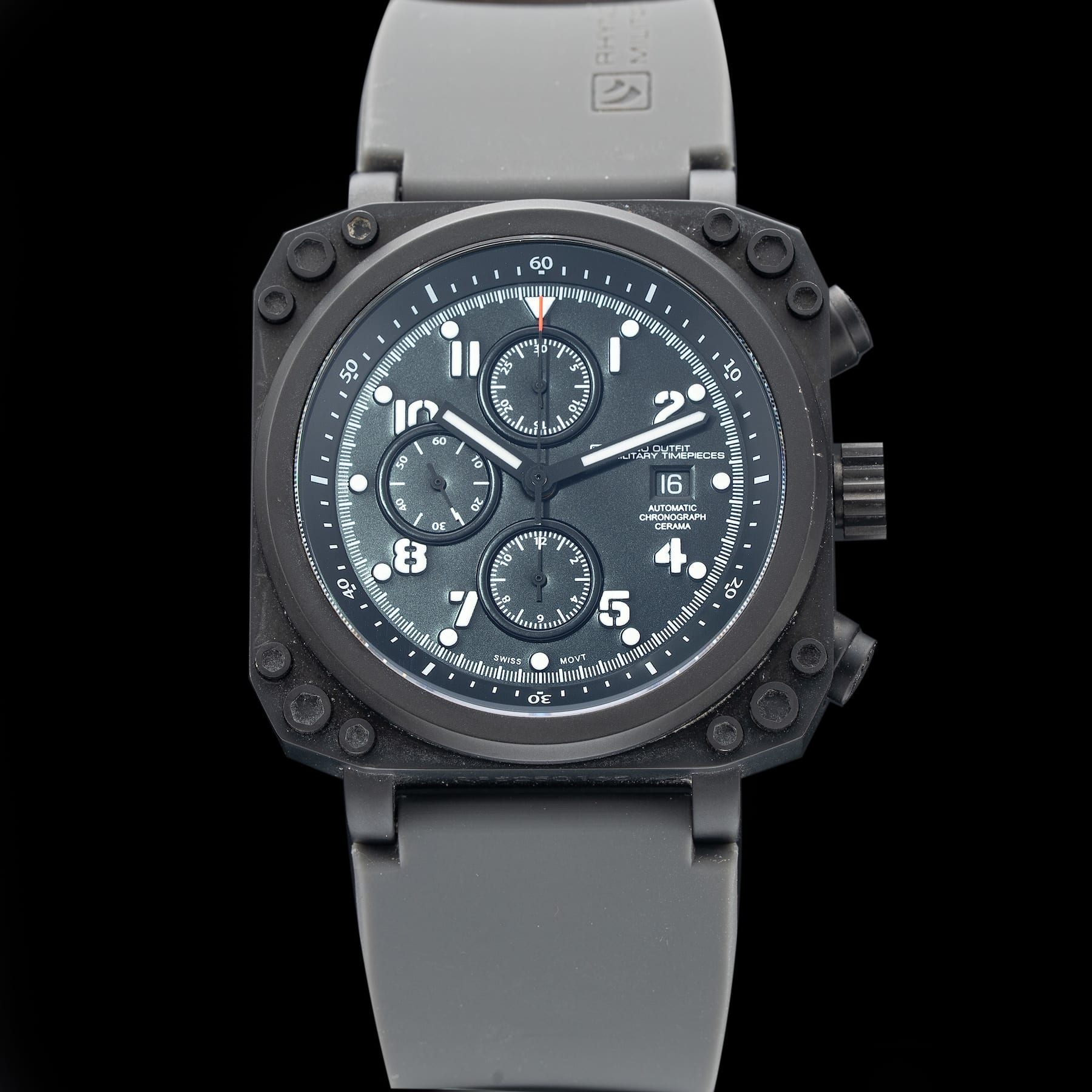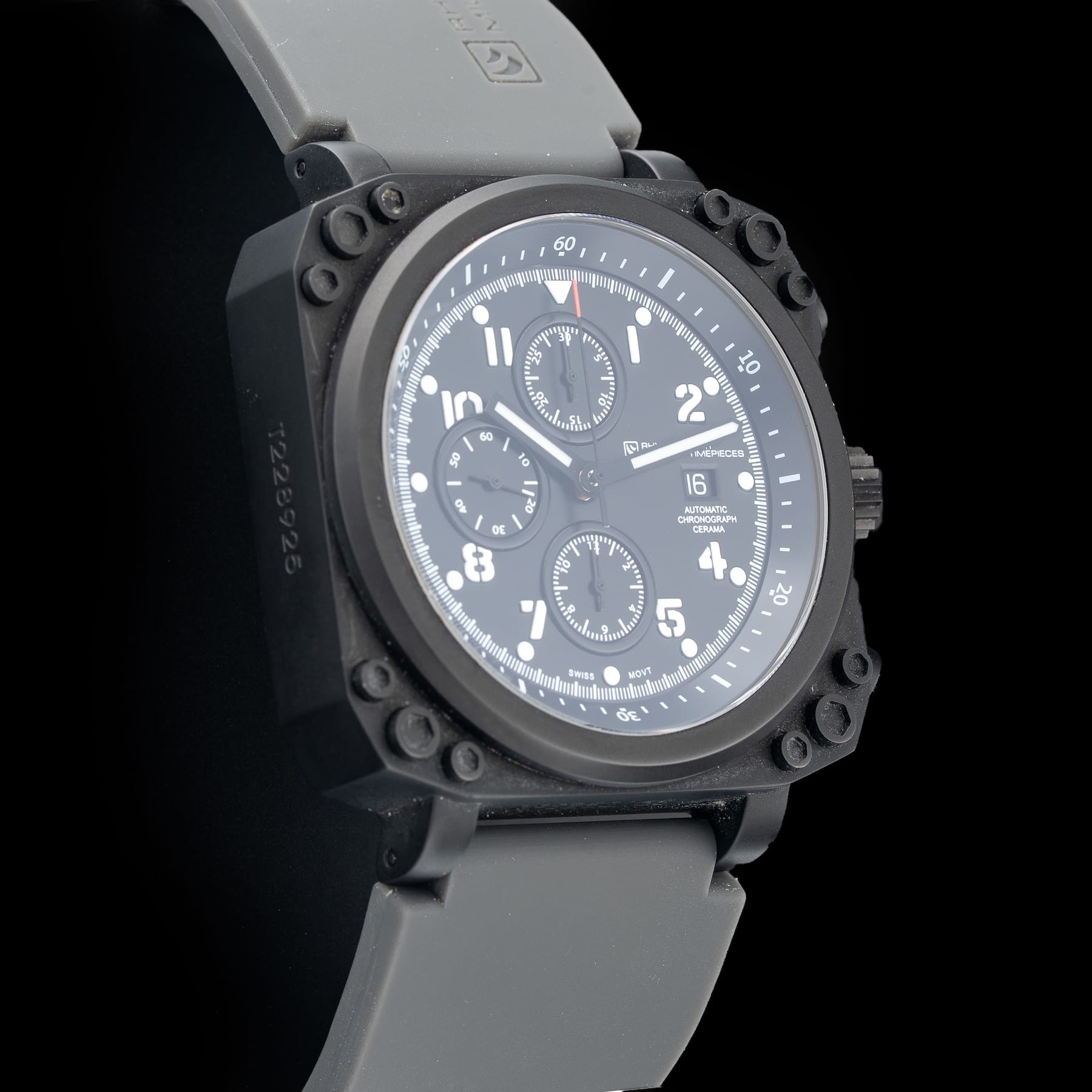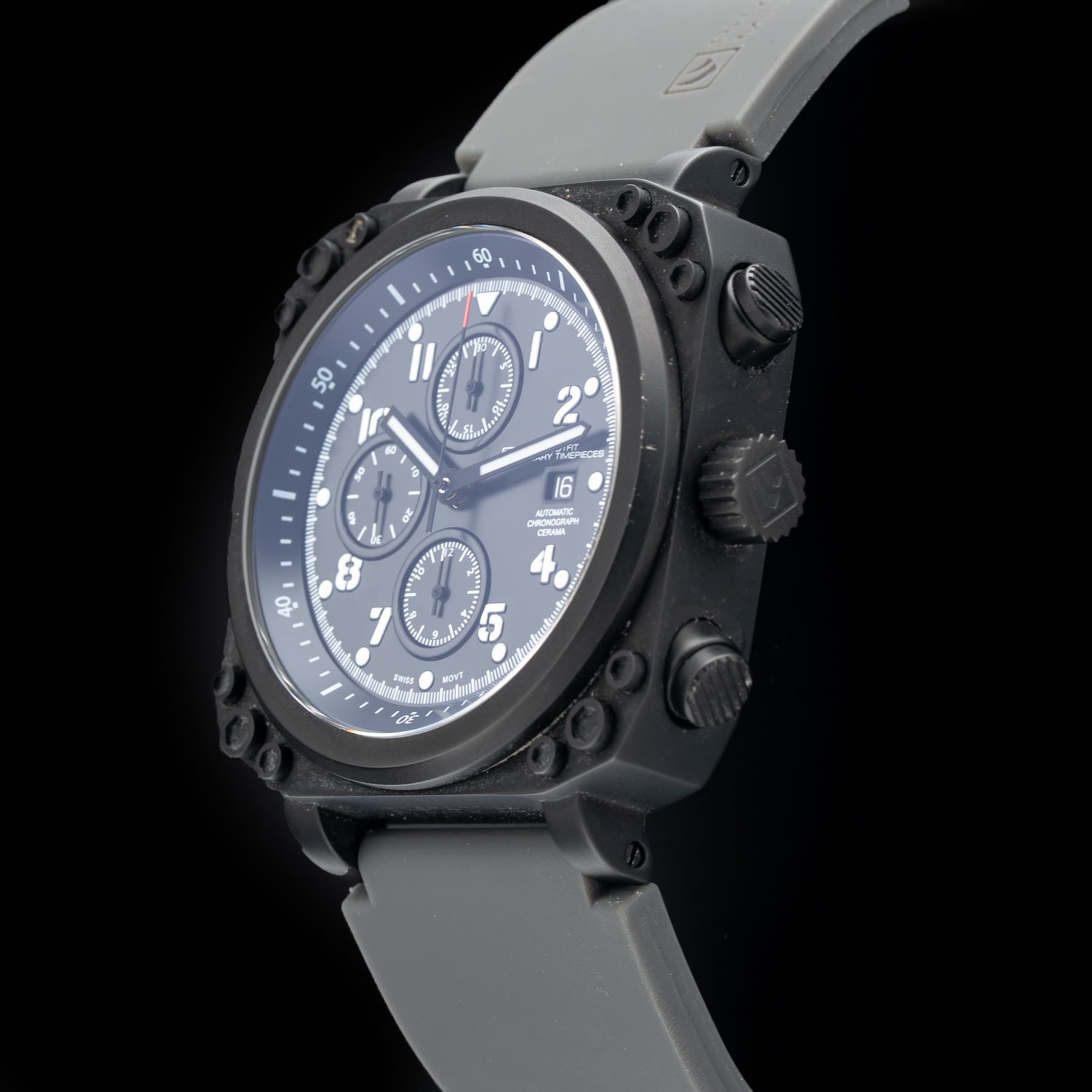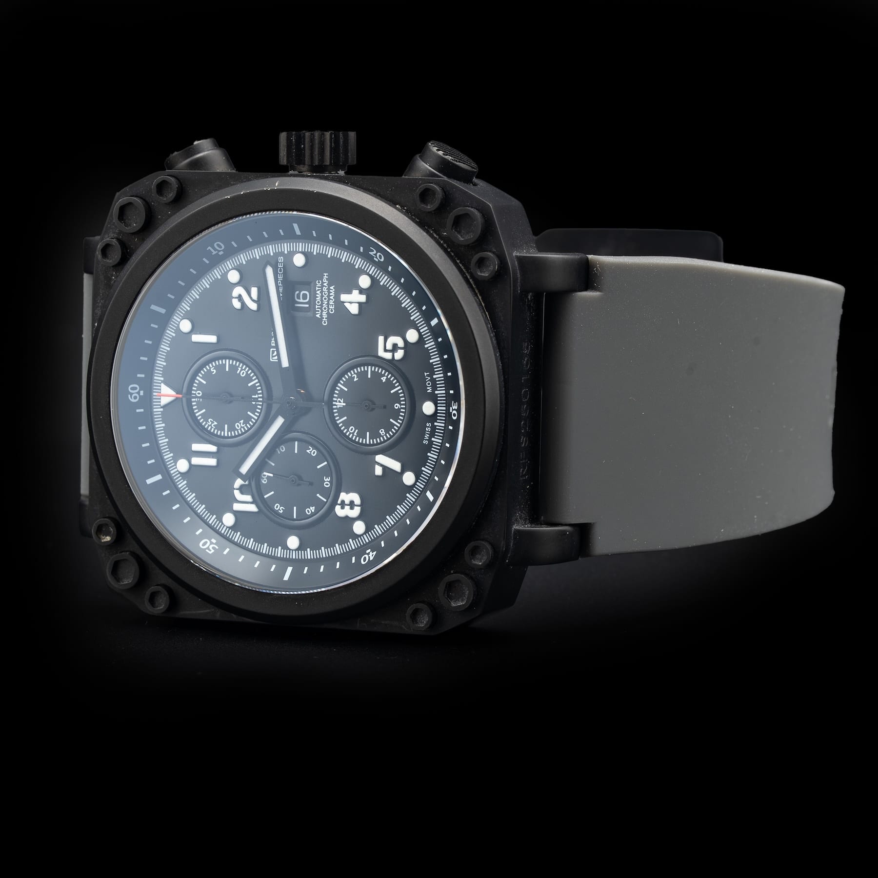 - This timepiece features a 47mm cerama case paired with a high quality rubber strap. It showcases a distinctive black dial and is powered by a precise automatic winding movement. The watch is designed with a water resistance of up to 150m.