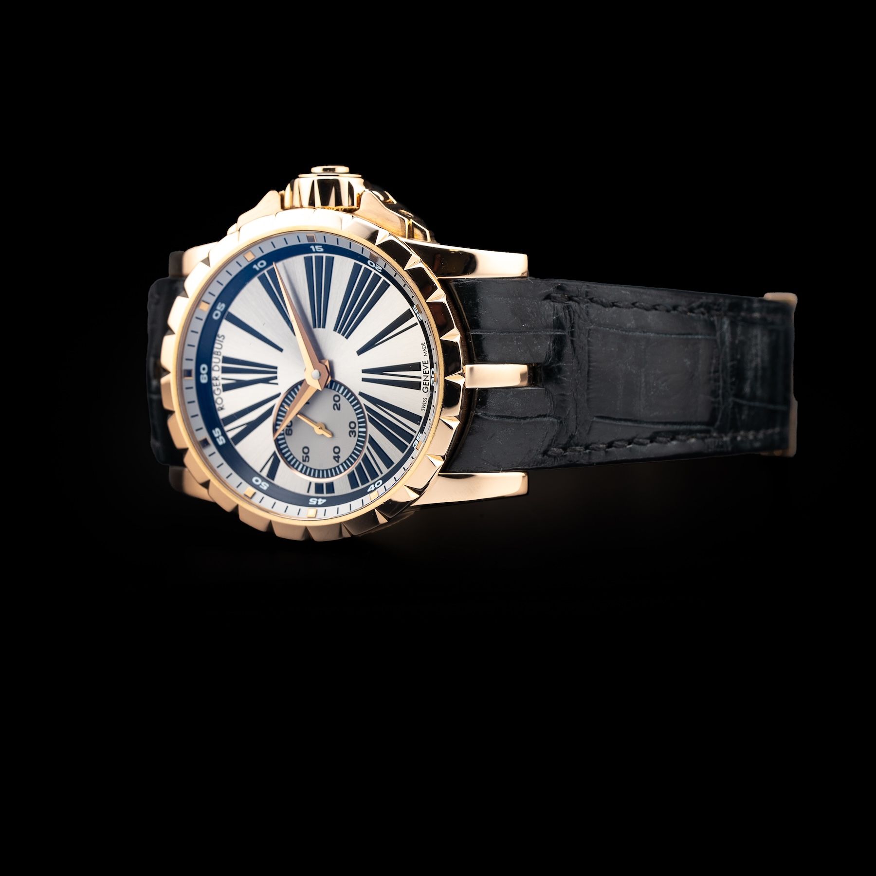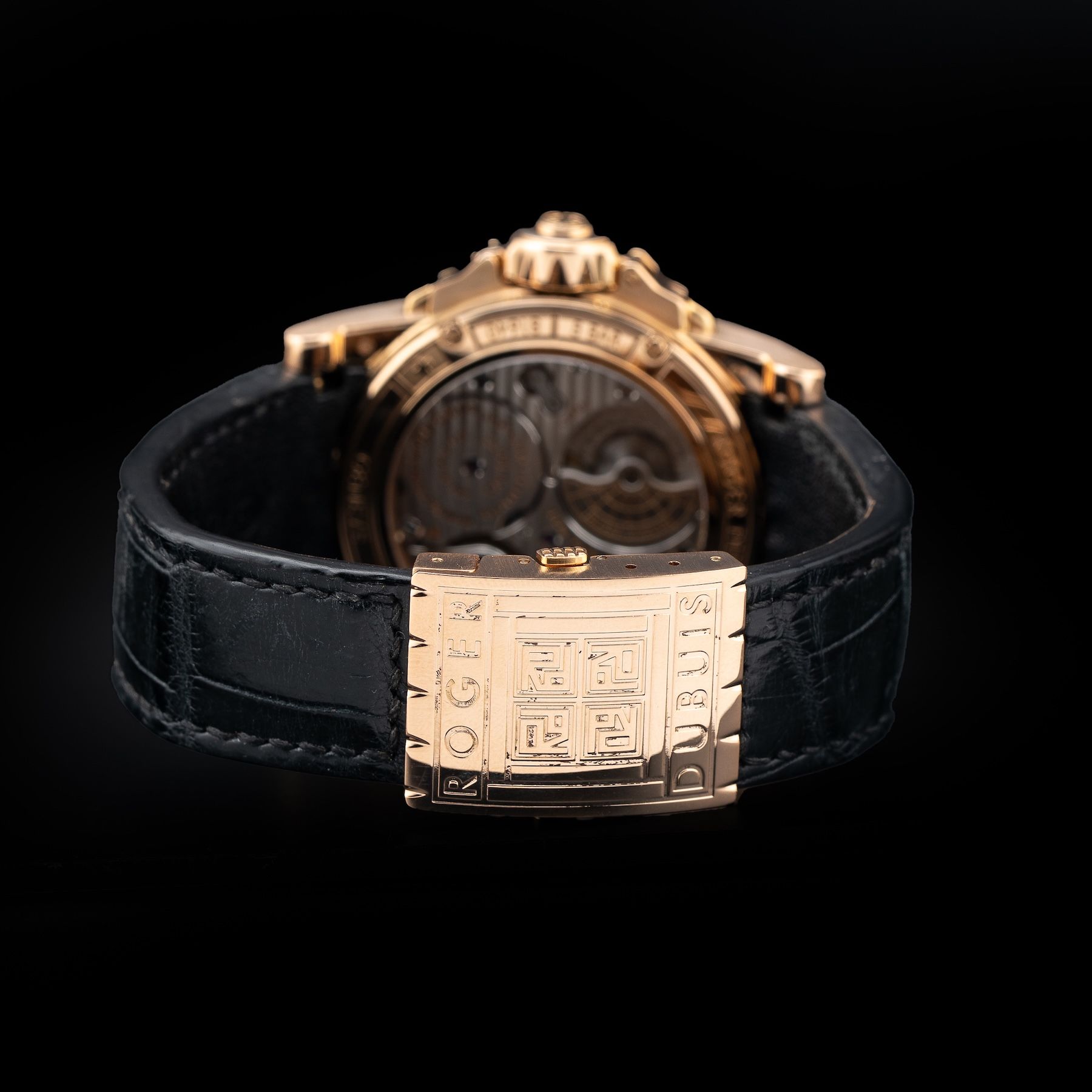 This watch features a 42mm 18kt rose gold case on leather strap. This watch also sports a silver dial. Powered by a self-winding Roger Dubuis in-house caliber RD620 movement. Water resistance up to 30 meters.