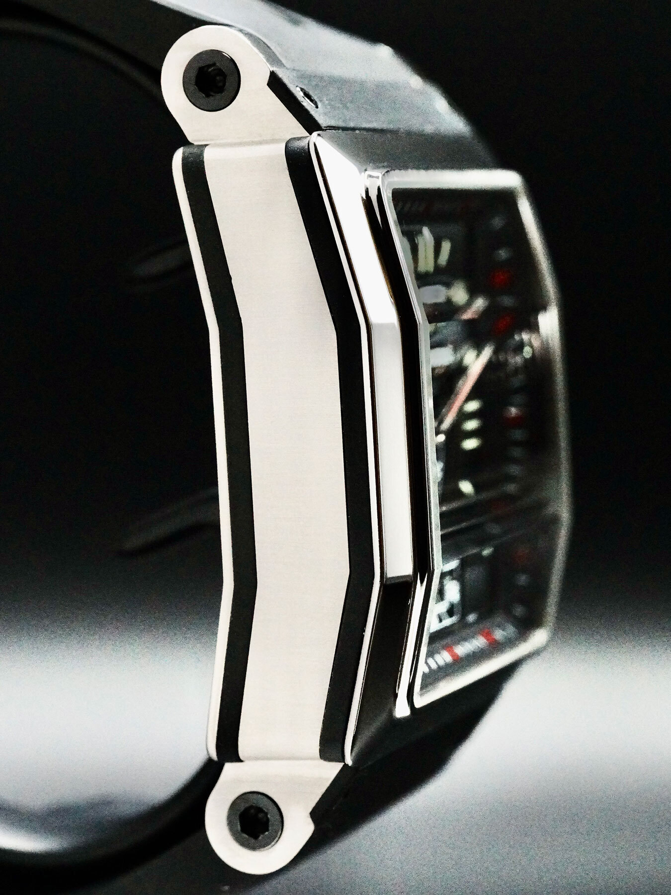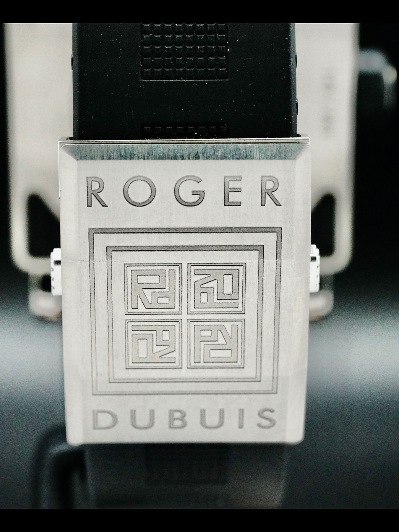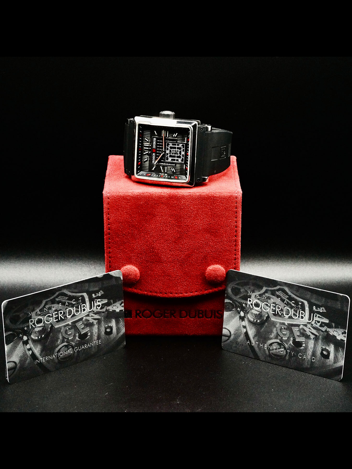 This Roger Dubuis King Square features a 40mm titanium case with an exhibition case back on a black rubber strap. This watch also sports a black dial with luminous hands and Roman numeral dial markers covered by scratch resistant sapphire crystal.