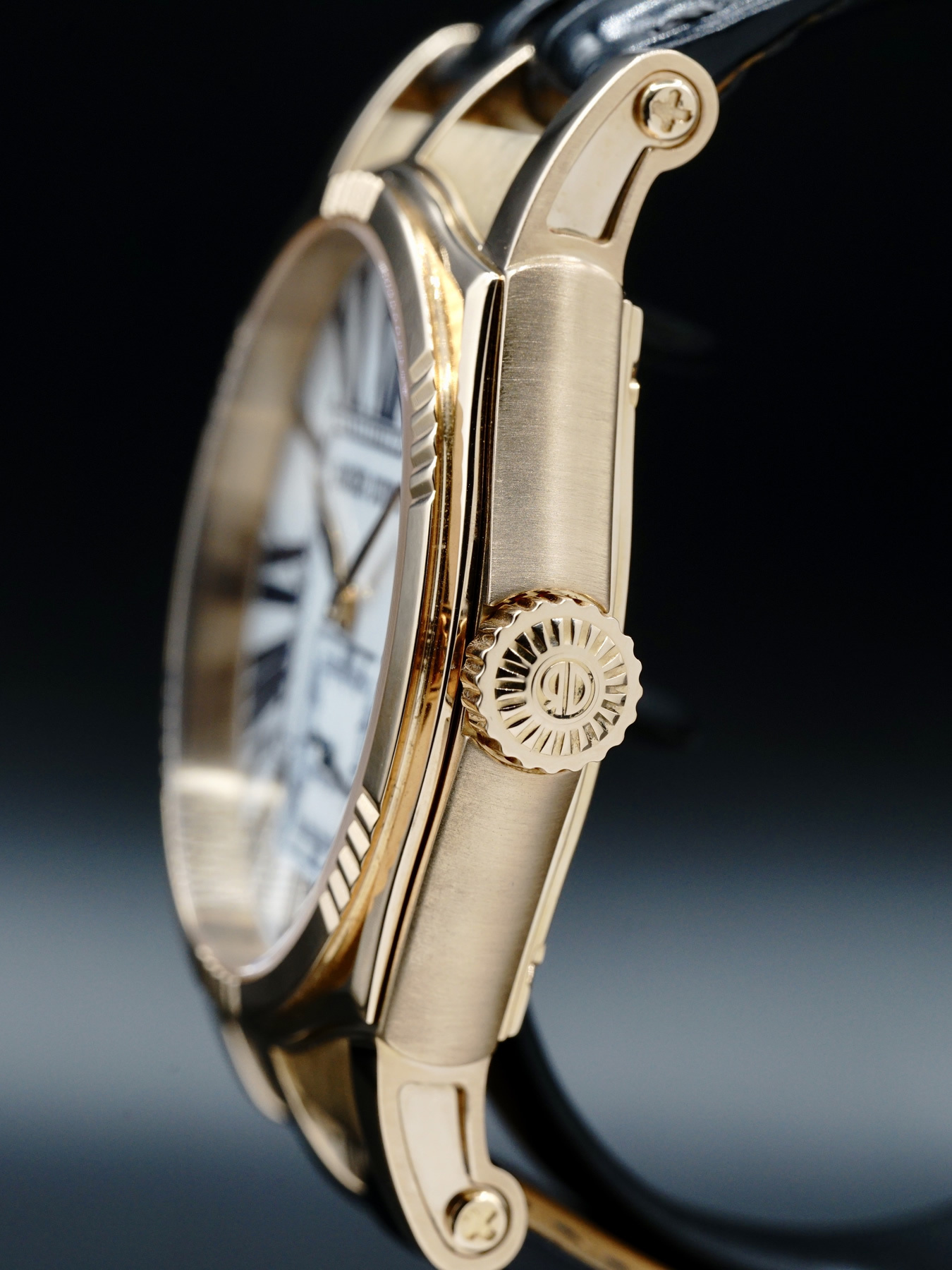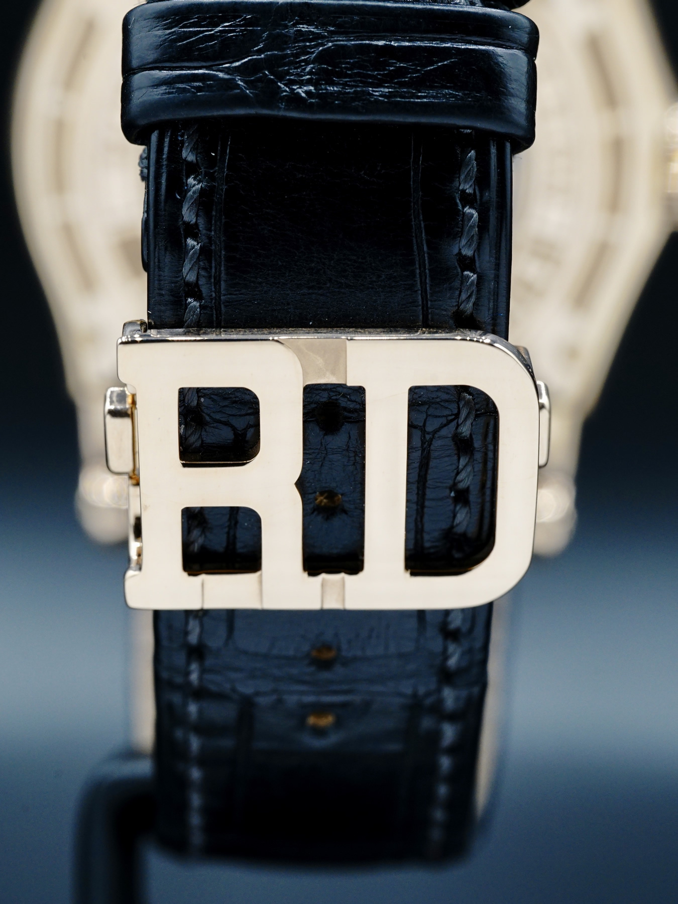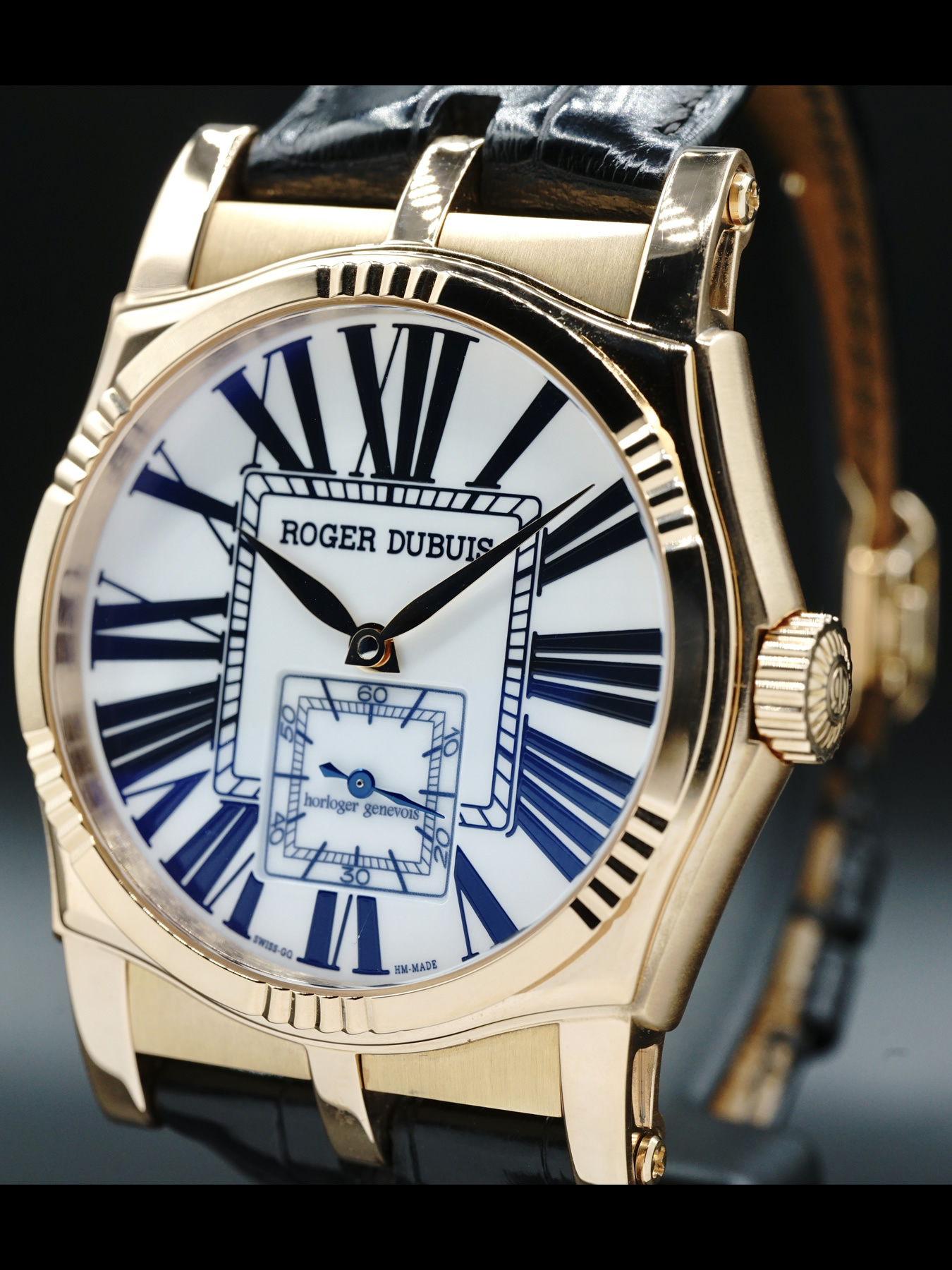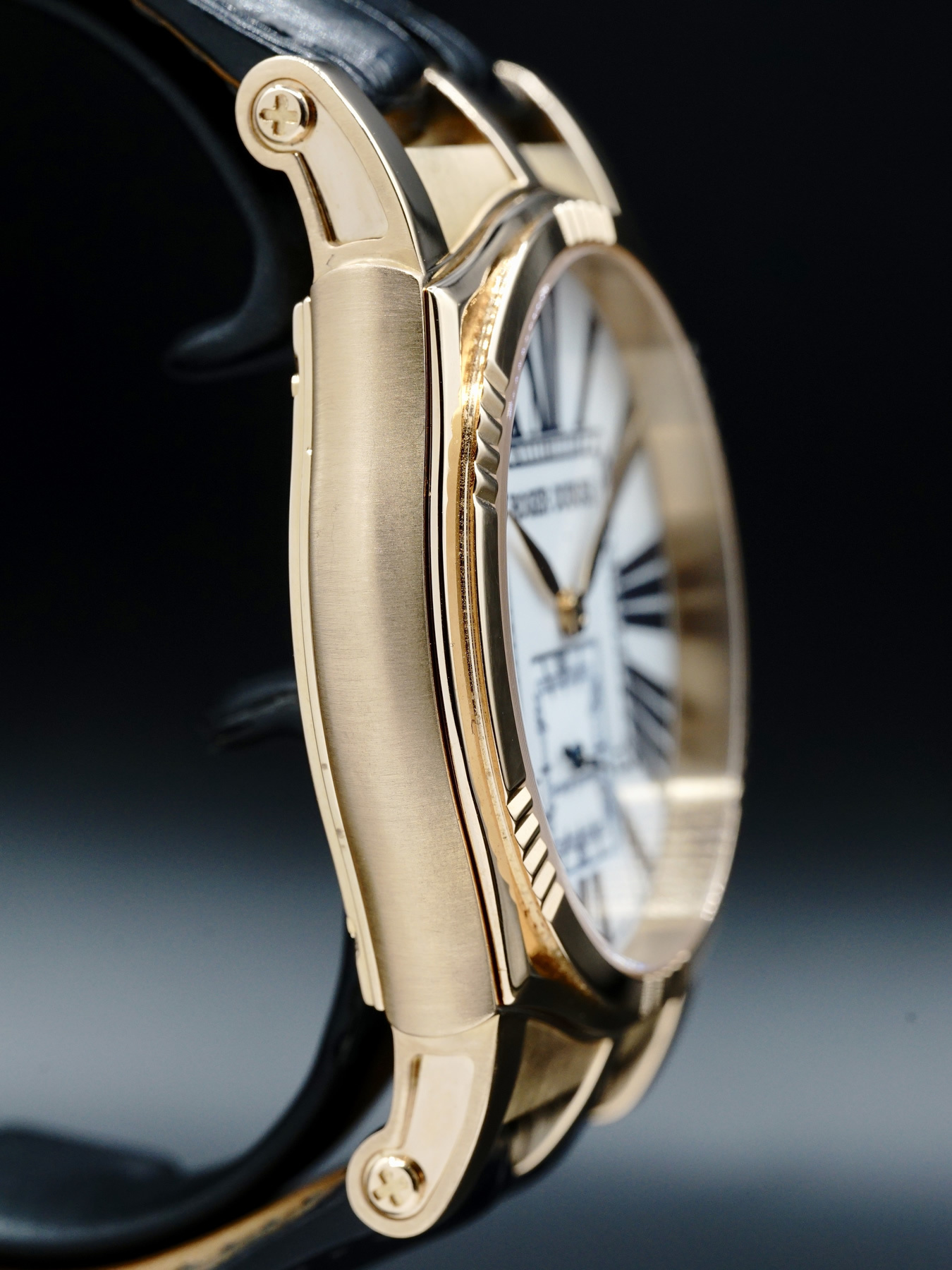 This Roger Dubuis Sympathie features a 43mm 18k rose gold case with a sapphire case back on a black leather strap. This watch also sports a white enamel dial with rose gold-tone hands and roman numeral dial markers covered by scratch resistant sapphire crystal.