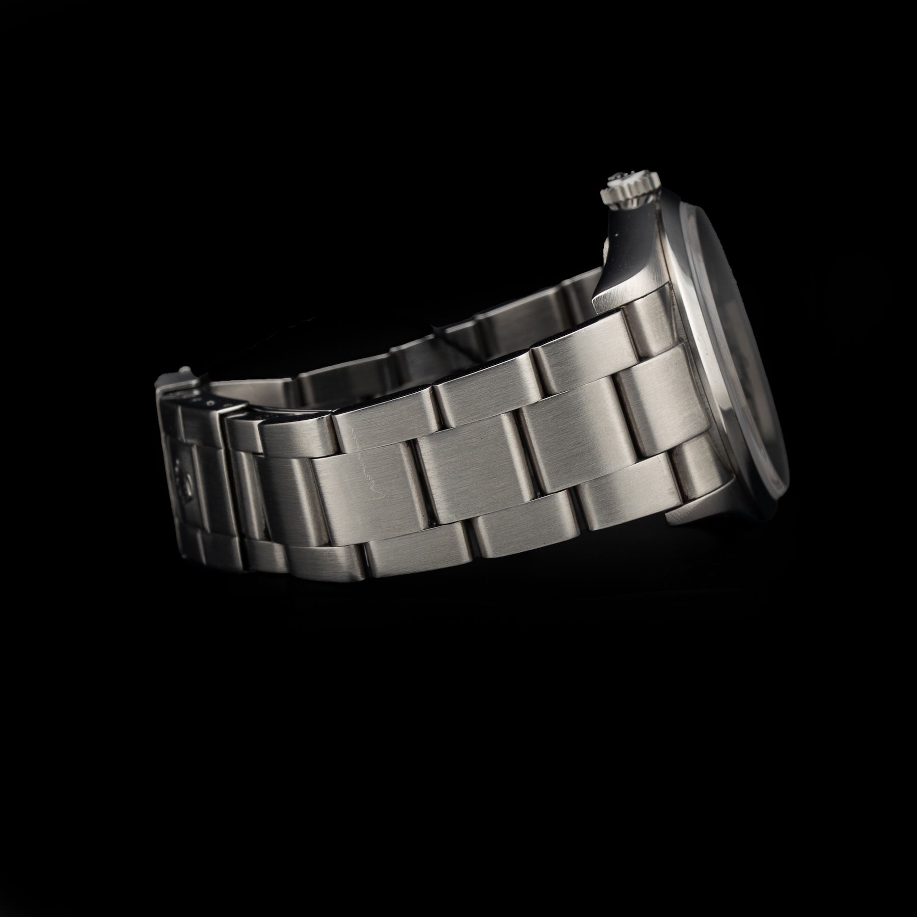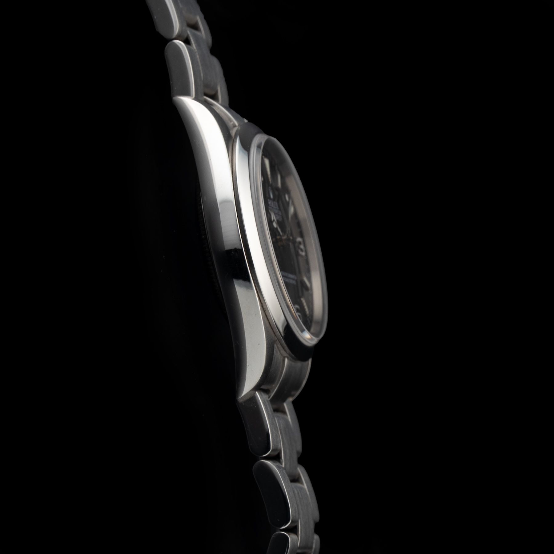 This watch features a 36mm stainless steel case on stainless steel bracelet. This watch also sports a black dial. Powered by a self-winding movement. Water resistance up to 100 meters.