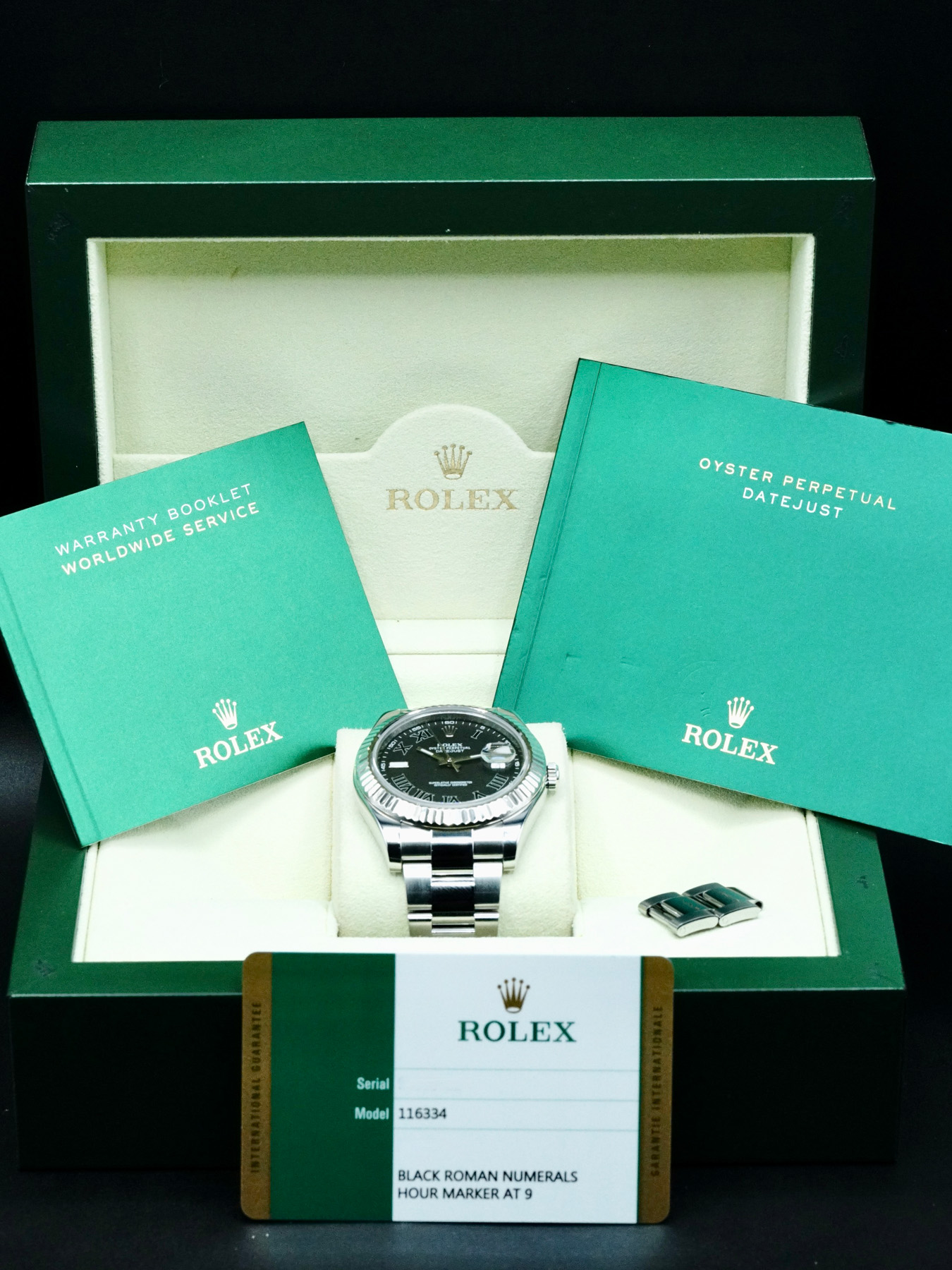 This Rolex 116334 Datejust II Stainless Steel Black Roman is in EXCELLENT condition. This watch includes its Original Box, Original Papers and Warranty Card Dated December 2017. Extra stainless steel bracelet links. This Rolex watch has been fully authenticated and certified by a 3rd party organization. You’ll receive the certificate of authenticity with your purchase.