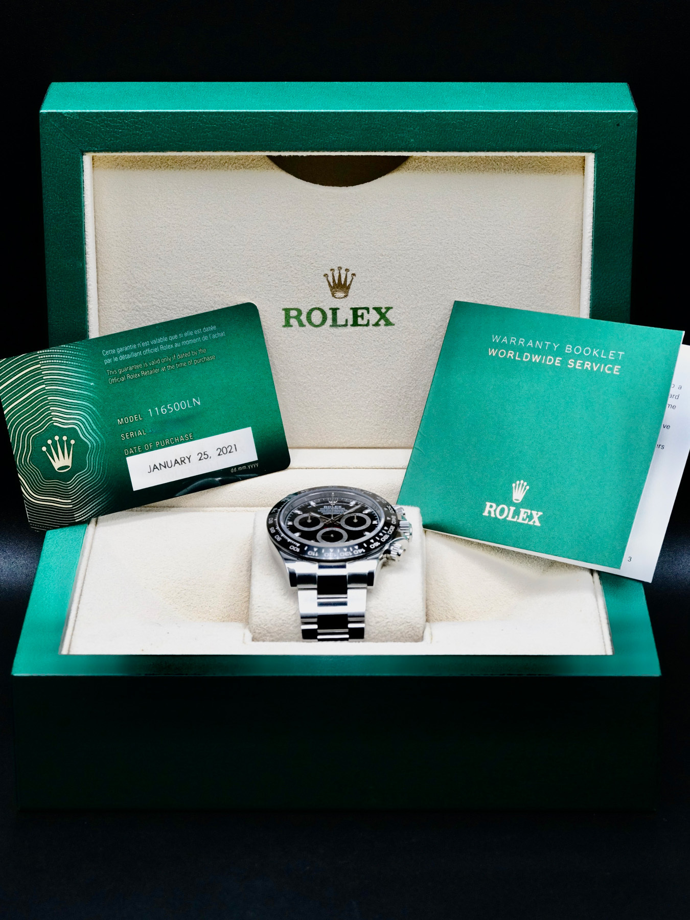 This Rolex Cosmograph Daytona 116500LN is in GREAT condition. This watch includes its original box, warranty booklet, and warranty card dated for January 2021. This watch has been fully authenticated and certified by Exquisite Timepieces.