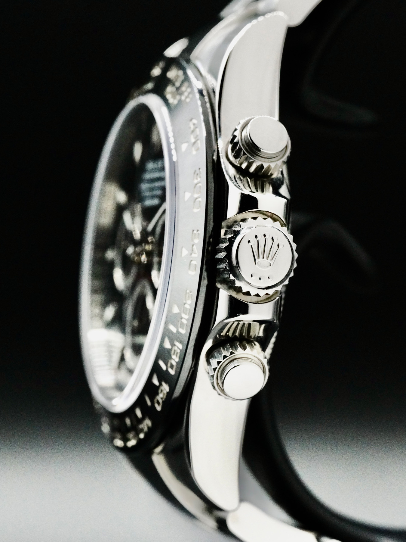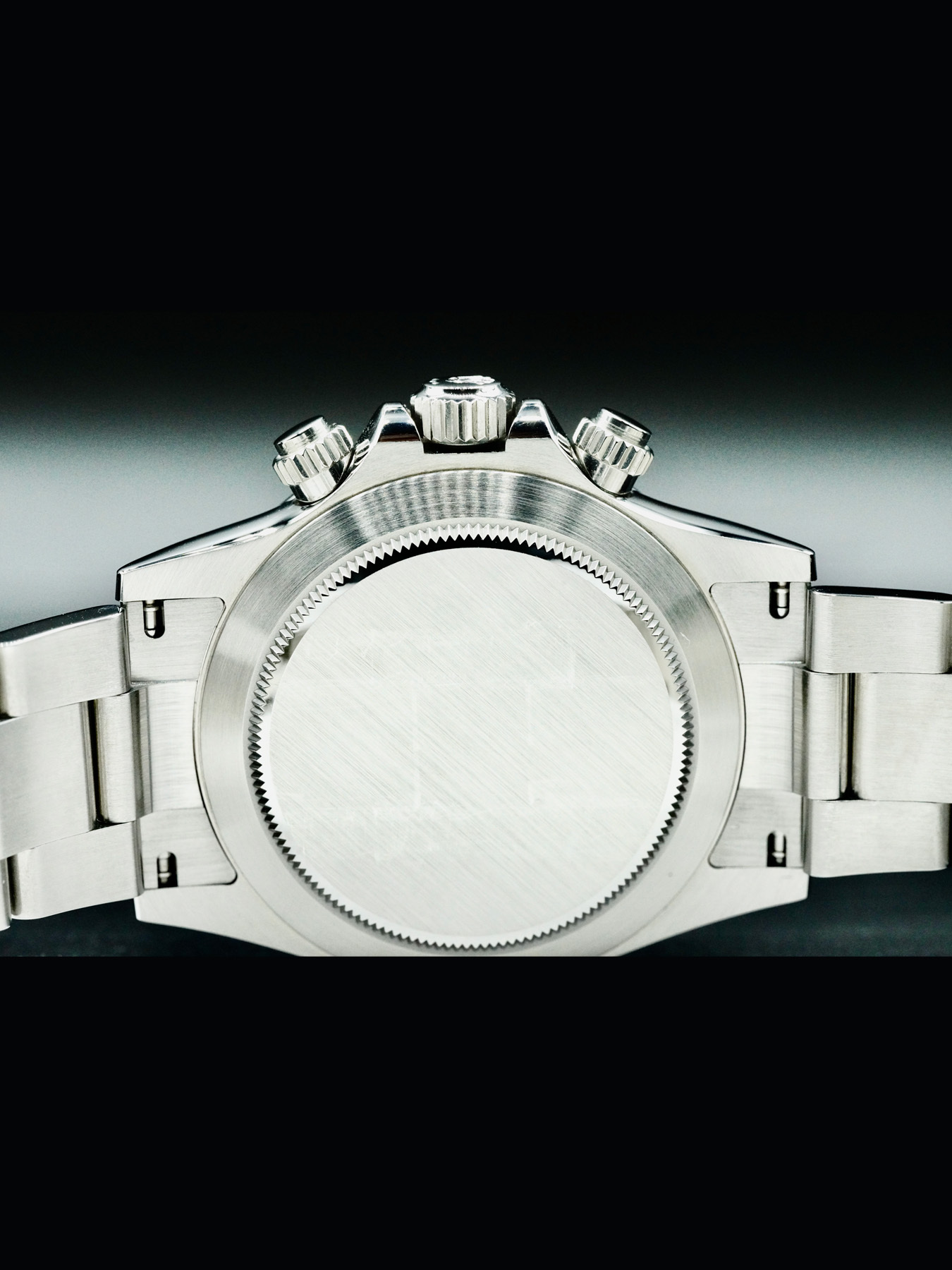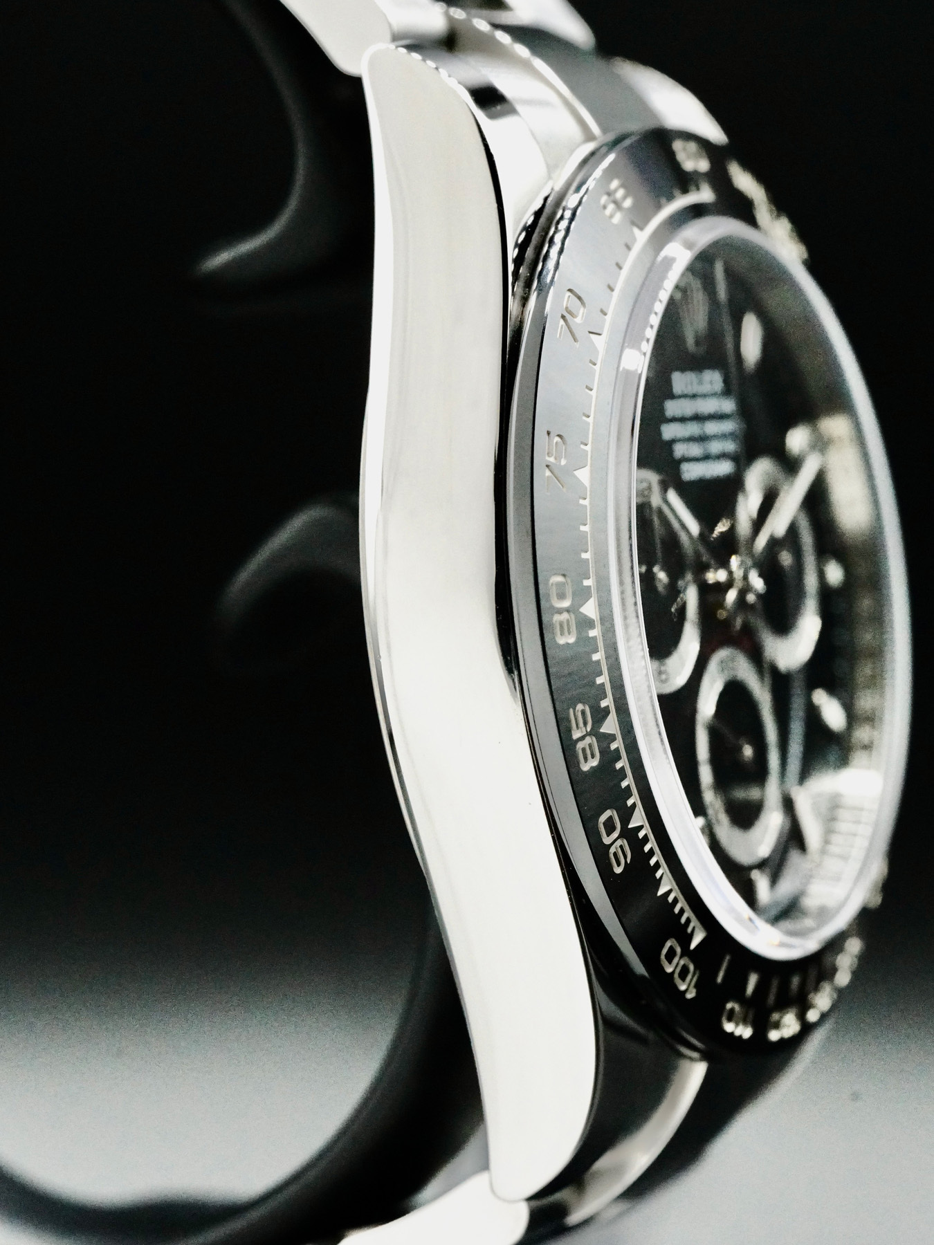 This Rolex Daytona features a 40mm stainless steel case & black ceramic bezel with a solid case back on a stainless steel bracelet. This watch also sports a black dial with luminous hands, index dial markers, and 3 sub-dials covered by scratch resistant sapphire crystal.