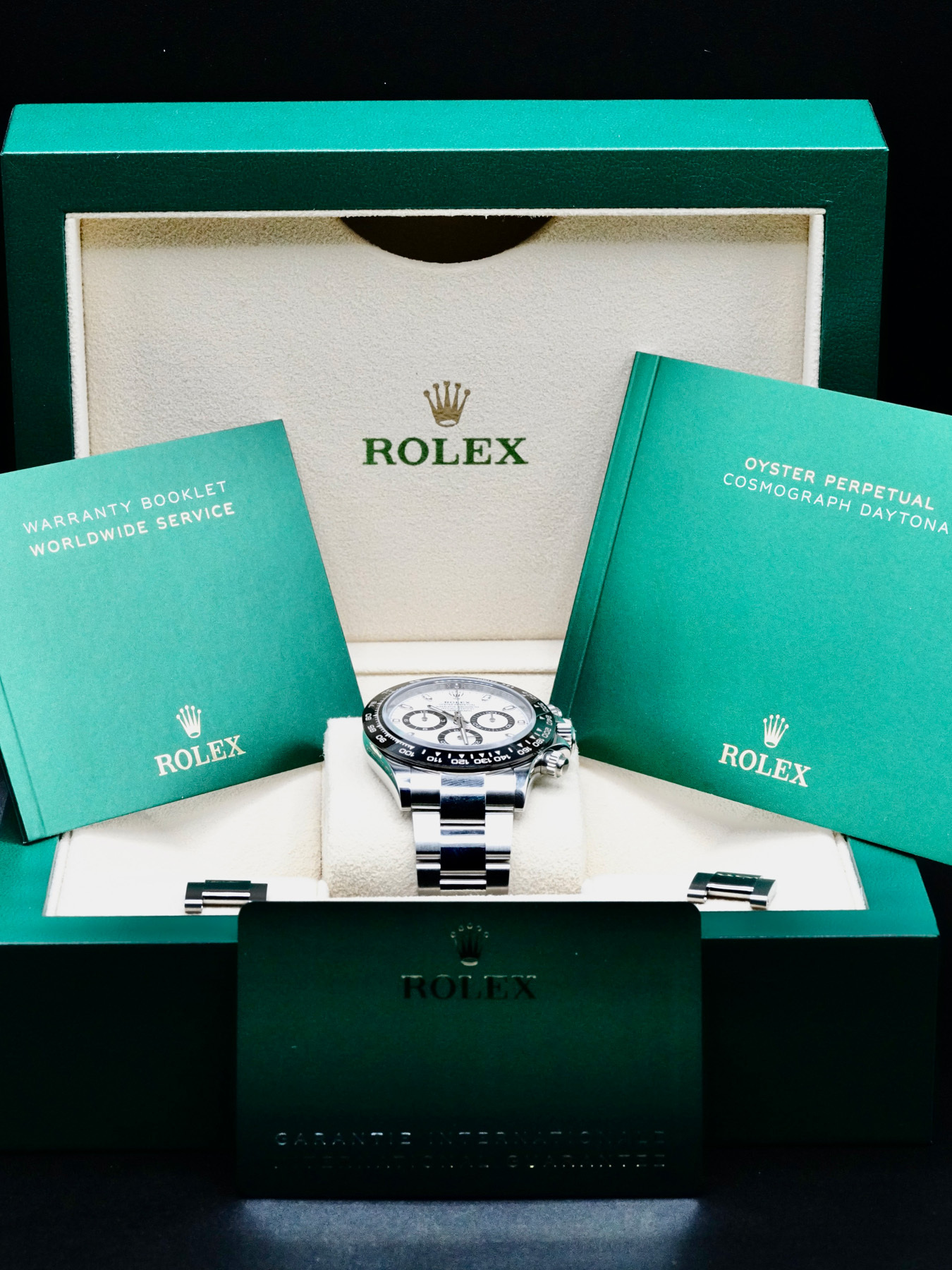 This Rolex Cosmograph Daytona White Dial 116500LN is in EXCELLENT condition. This watch includes its original box, instruction manual, and guarantee card dated for June 2023. Extra stainless steel bracelet link. This watch has been fully authenticated and certified by Exquisite Timepieces.