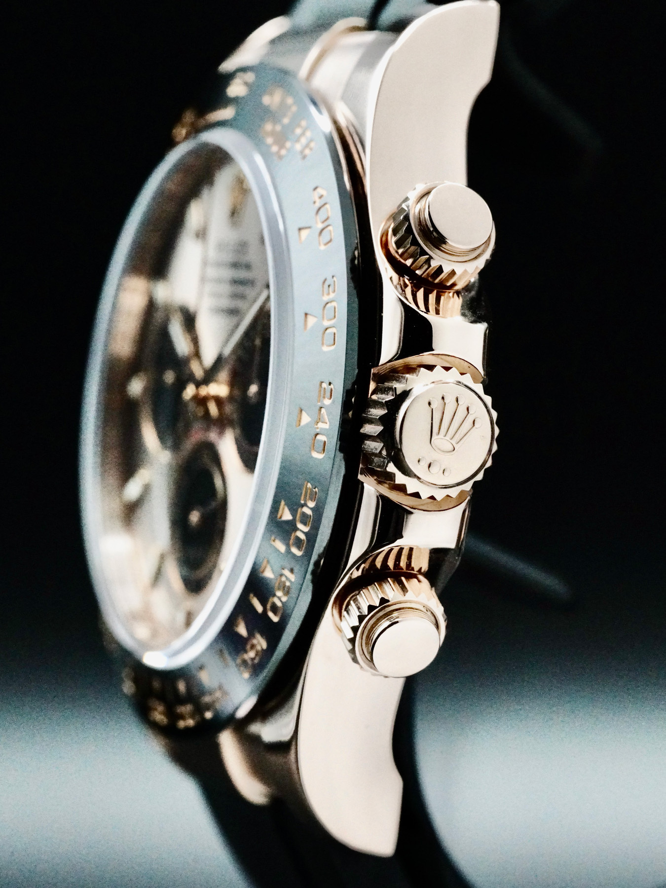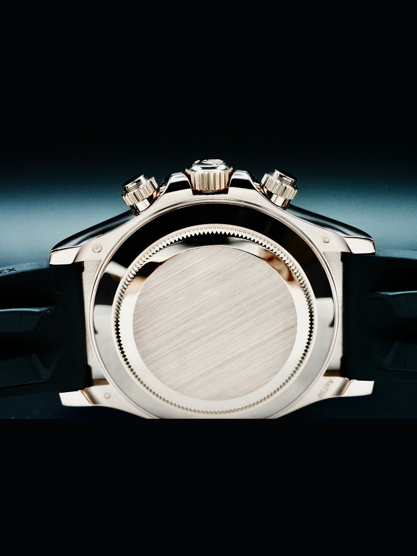 This Rolex Daytona Cosmograph features a 40mm 18k rose gold case with a solid case back on a black rubber strap. This watch also sports a pink dial with luminous rose gold-tone hands and index dial markers covered by scratch resistant sapphire crystal.