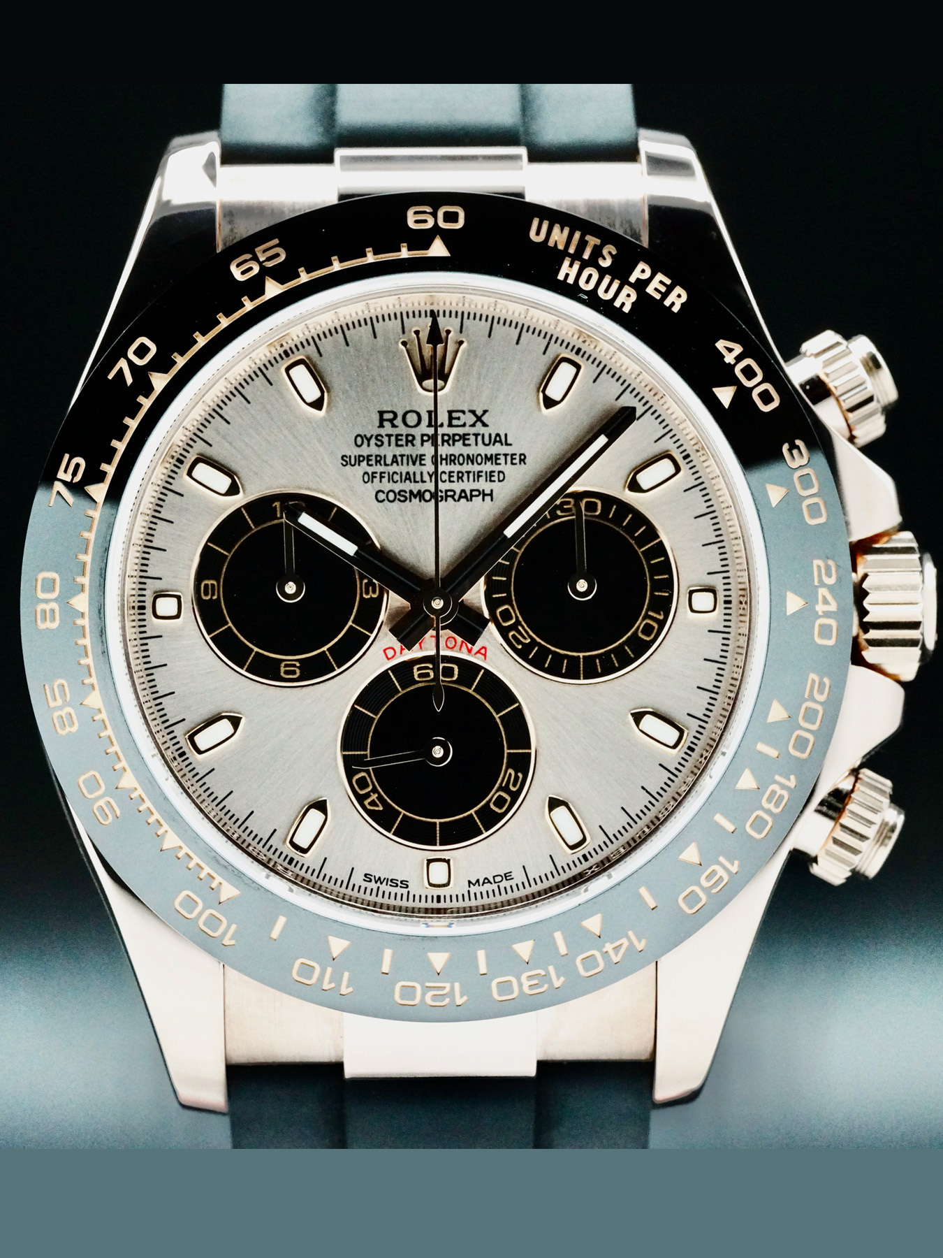Automatic movement powered by Rolex Calibre 4130 with a power reserve of approximately 72 hours. Water resistance up to 100 meters.