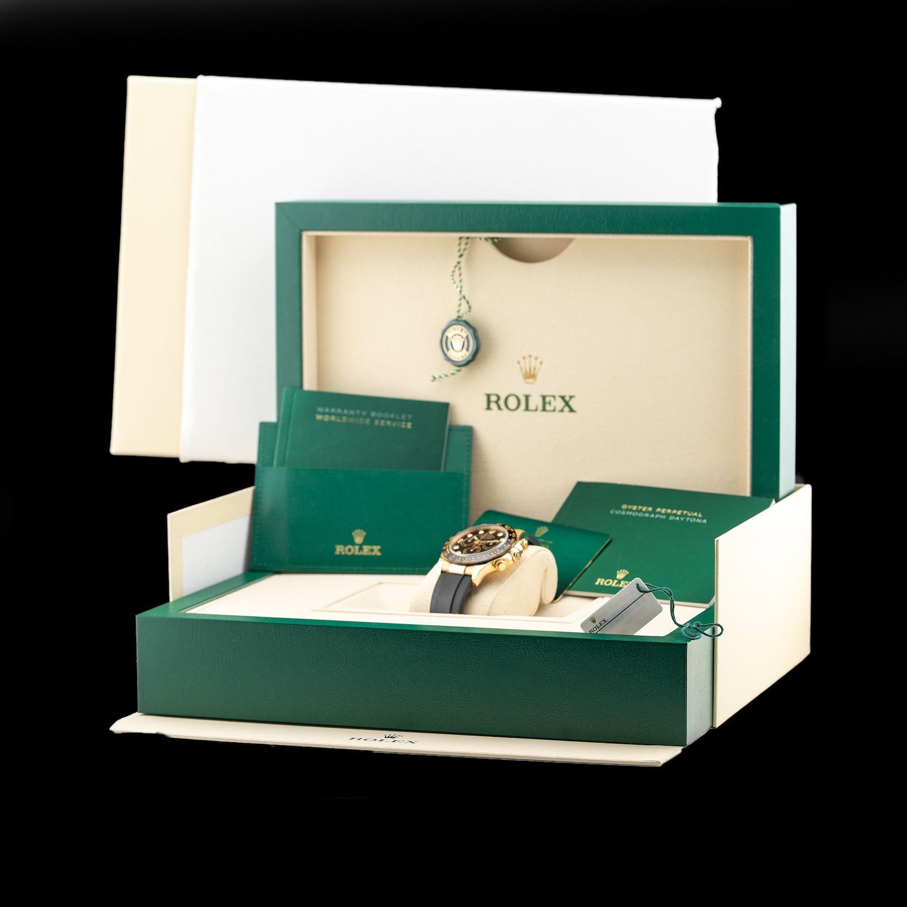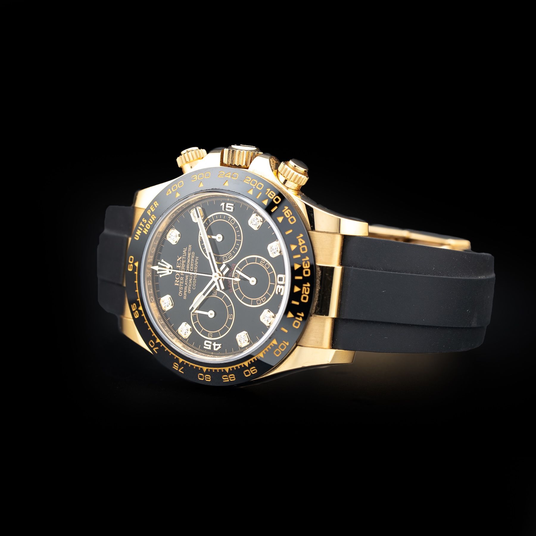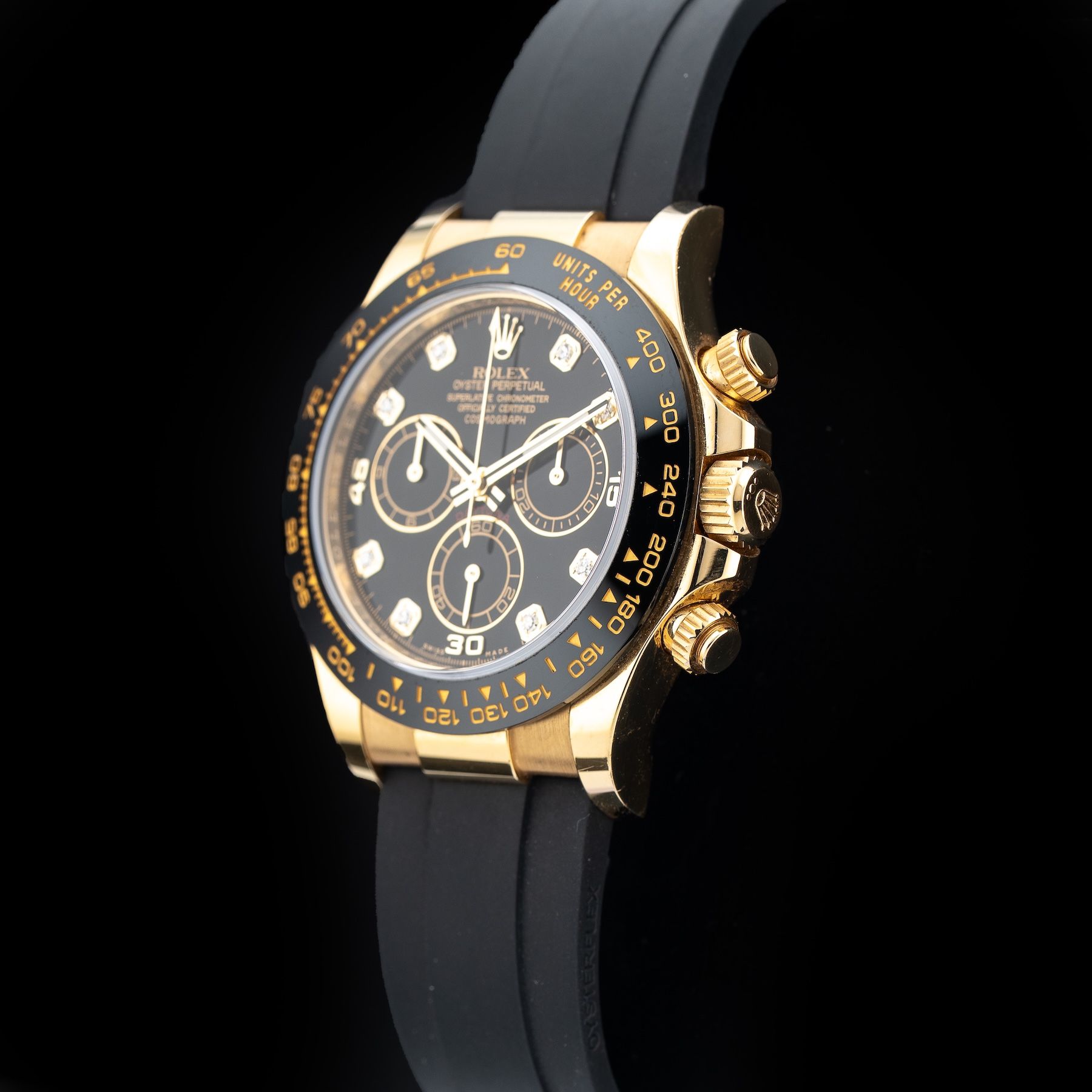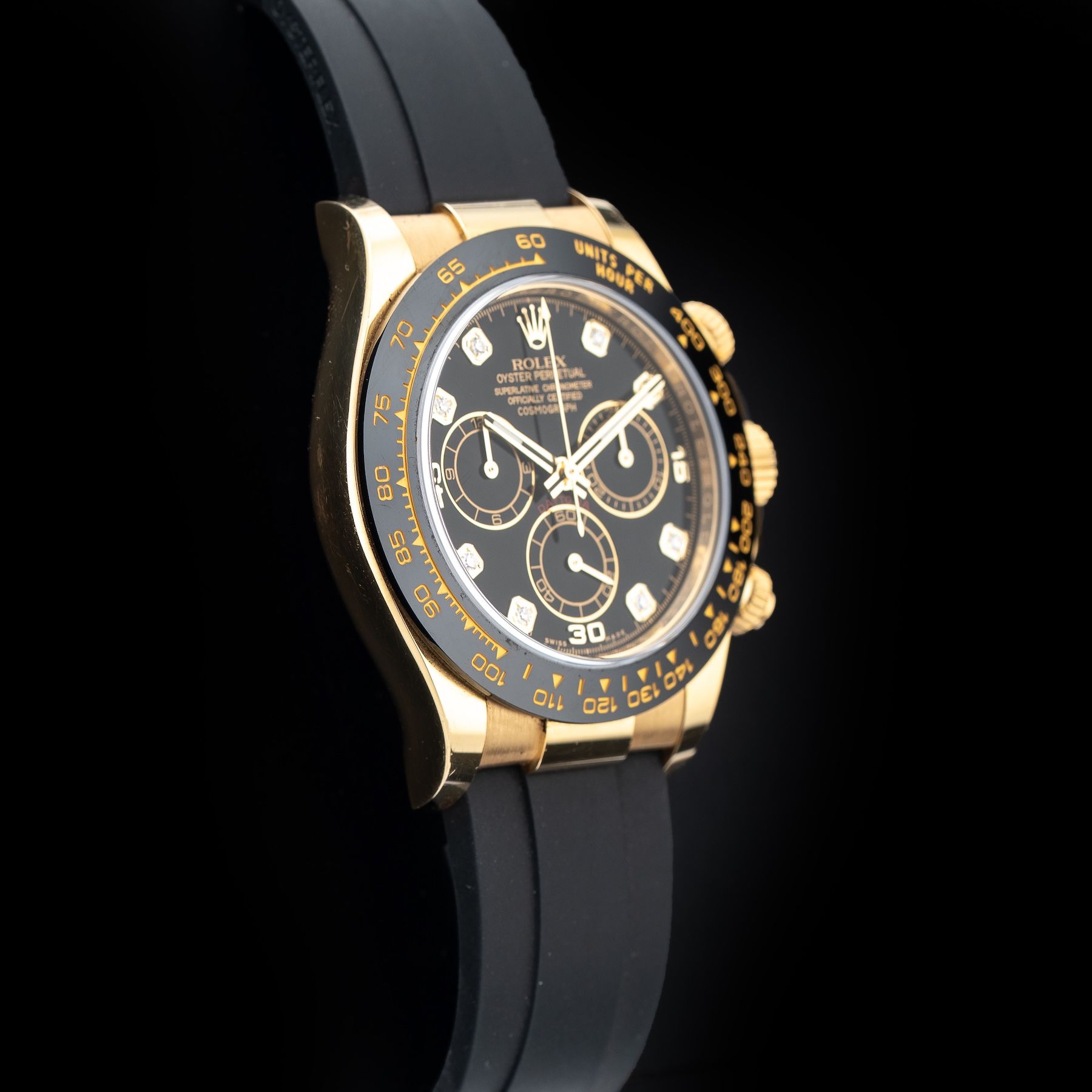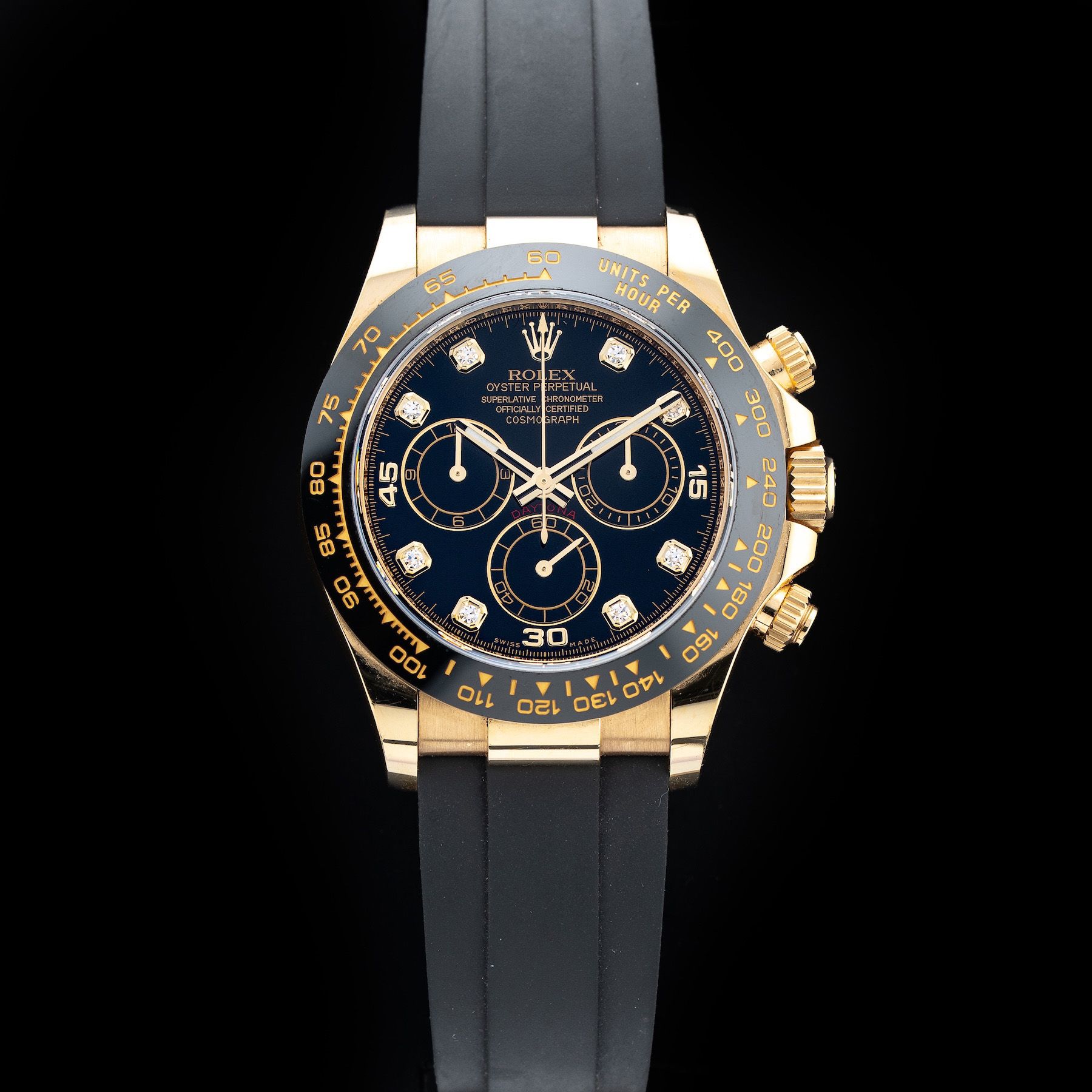This watch features a 40mm 18k yellow gold case on rubber strap. This watch also sports a black dial. Powered by a mechanical automatic movement. Water resistance up to 100 meters.