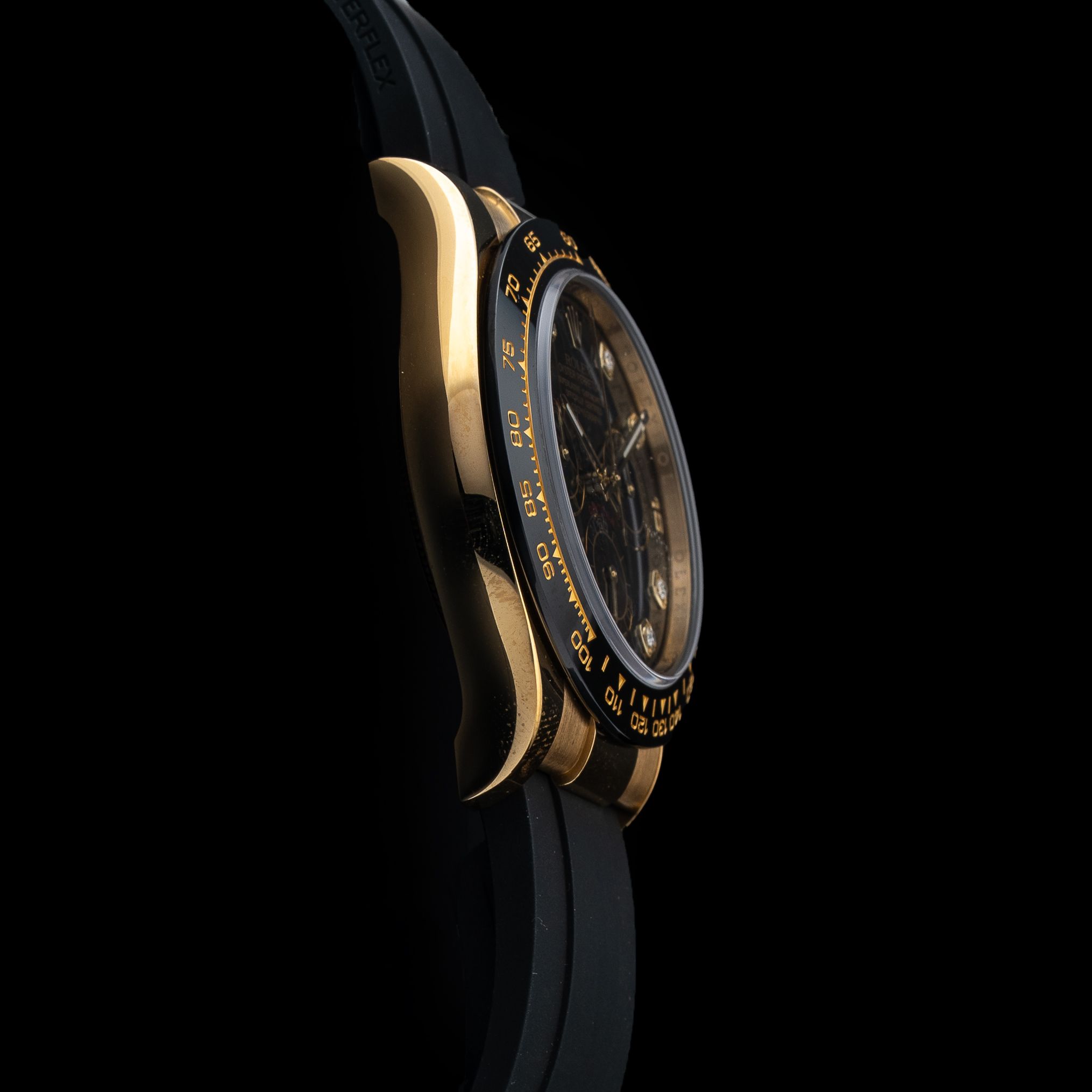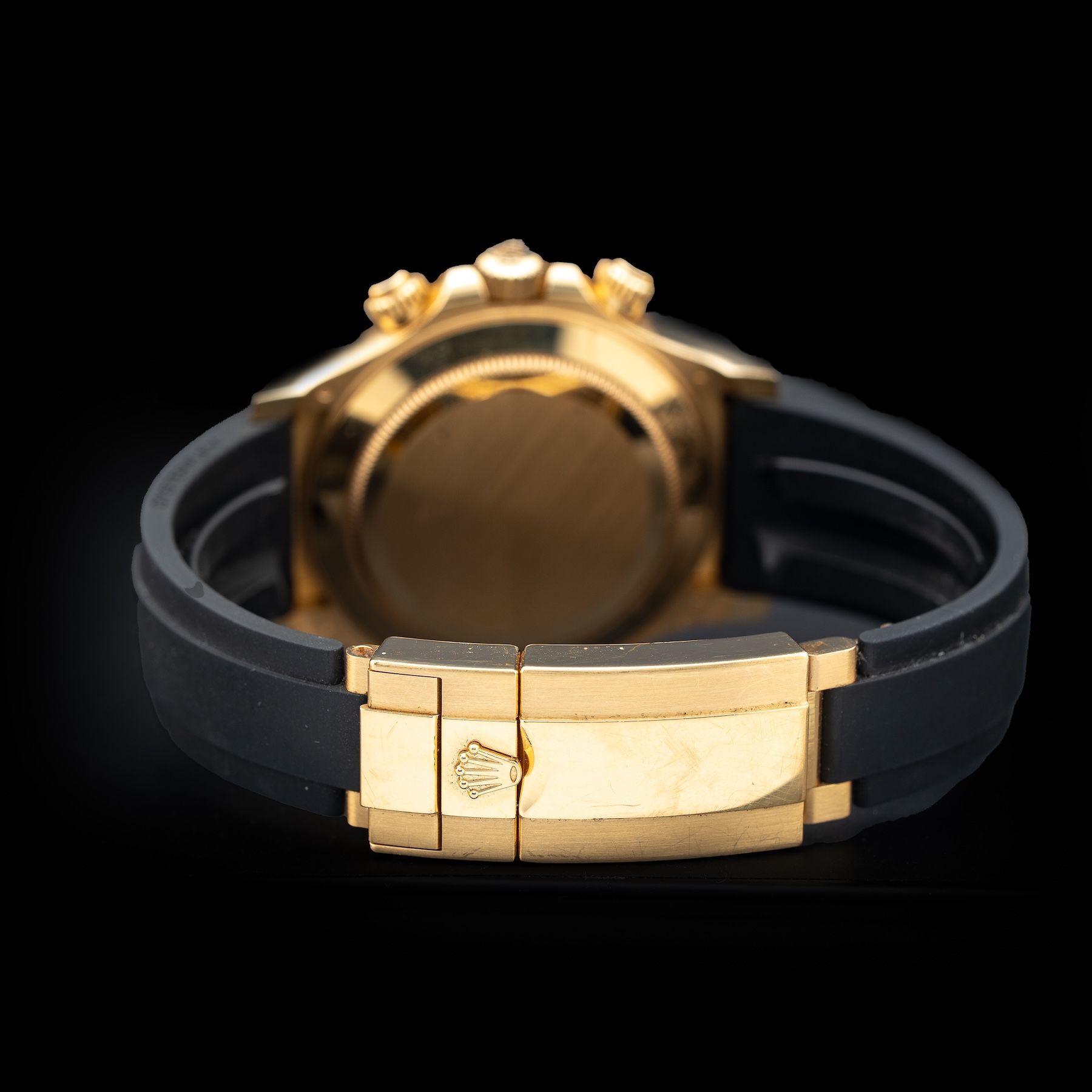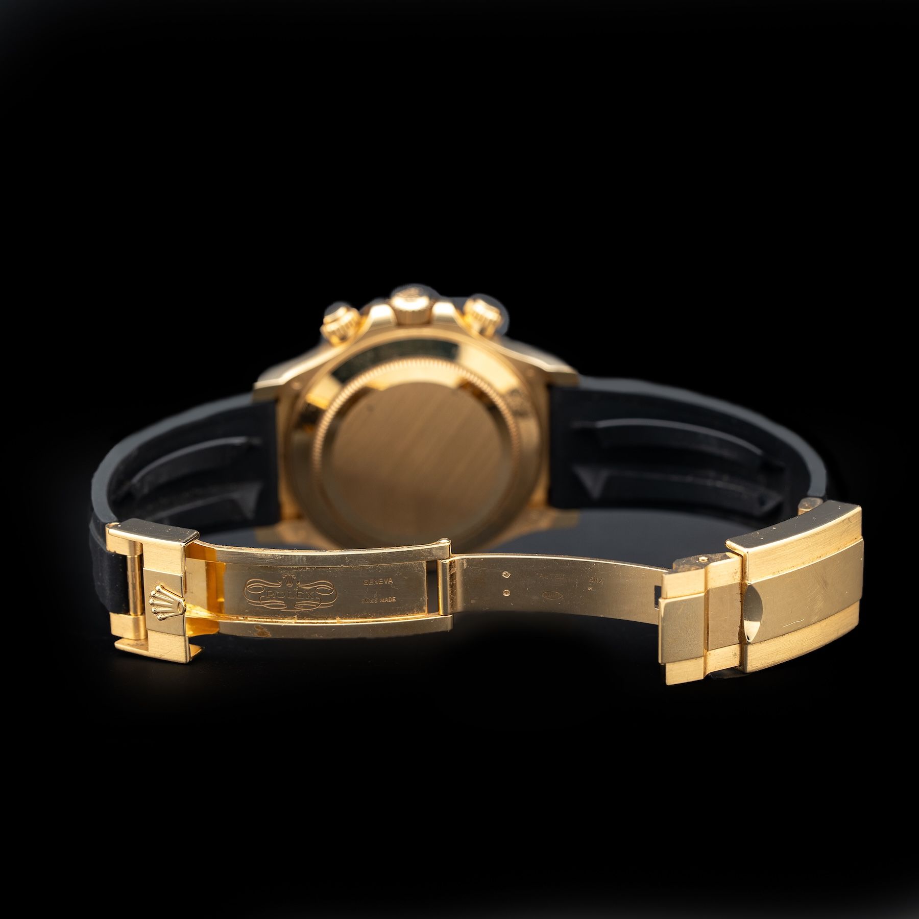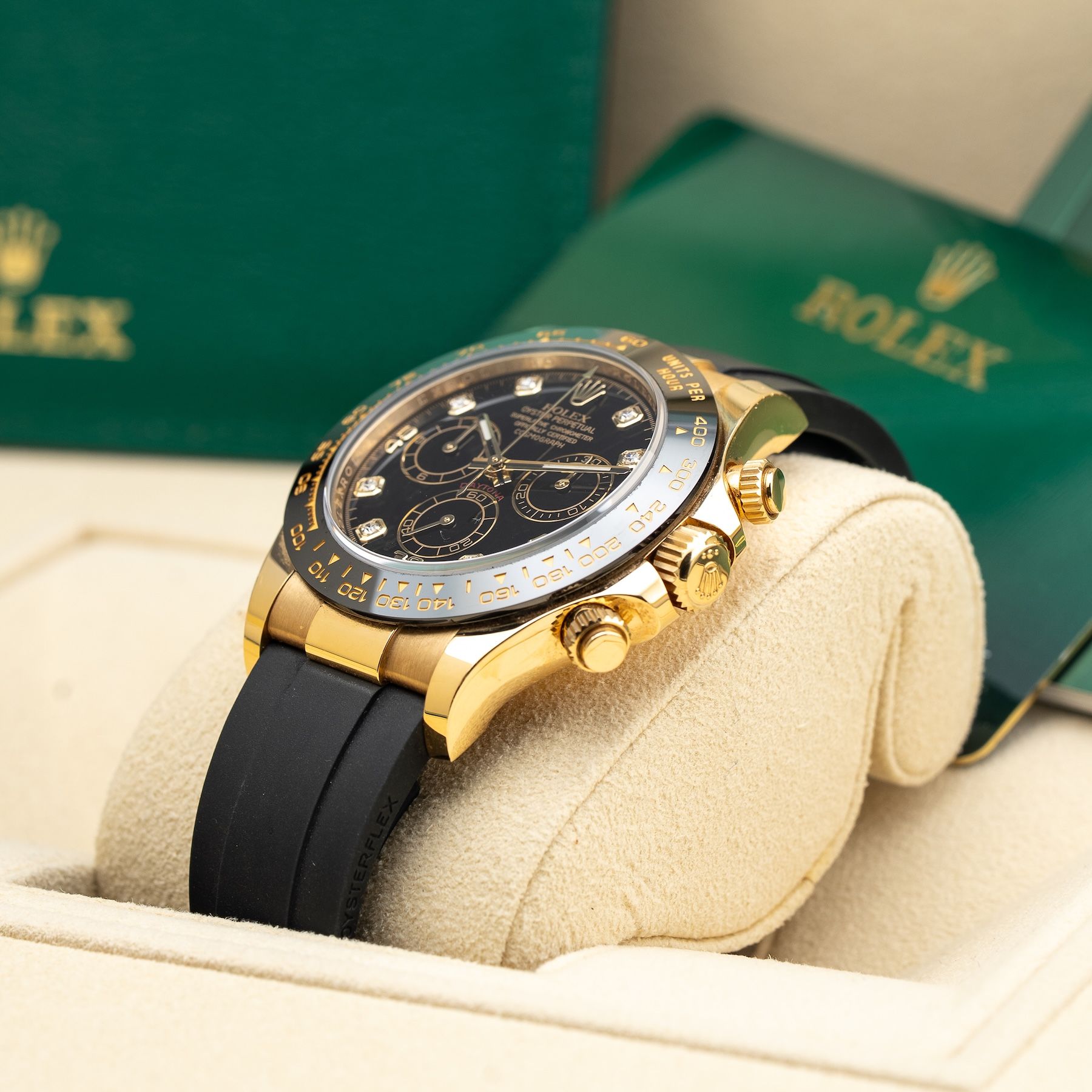 This watch features a 40mm 18k yellow gold case on rubber strap. This watch also sports a black dial. Powered by a mechanical automatic movement. Water resistance up to 100 meters.