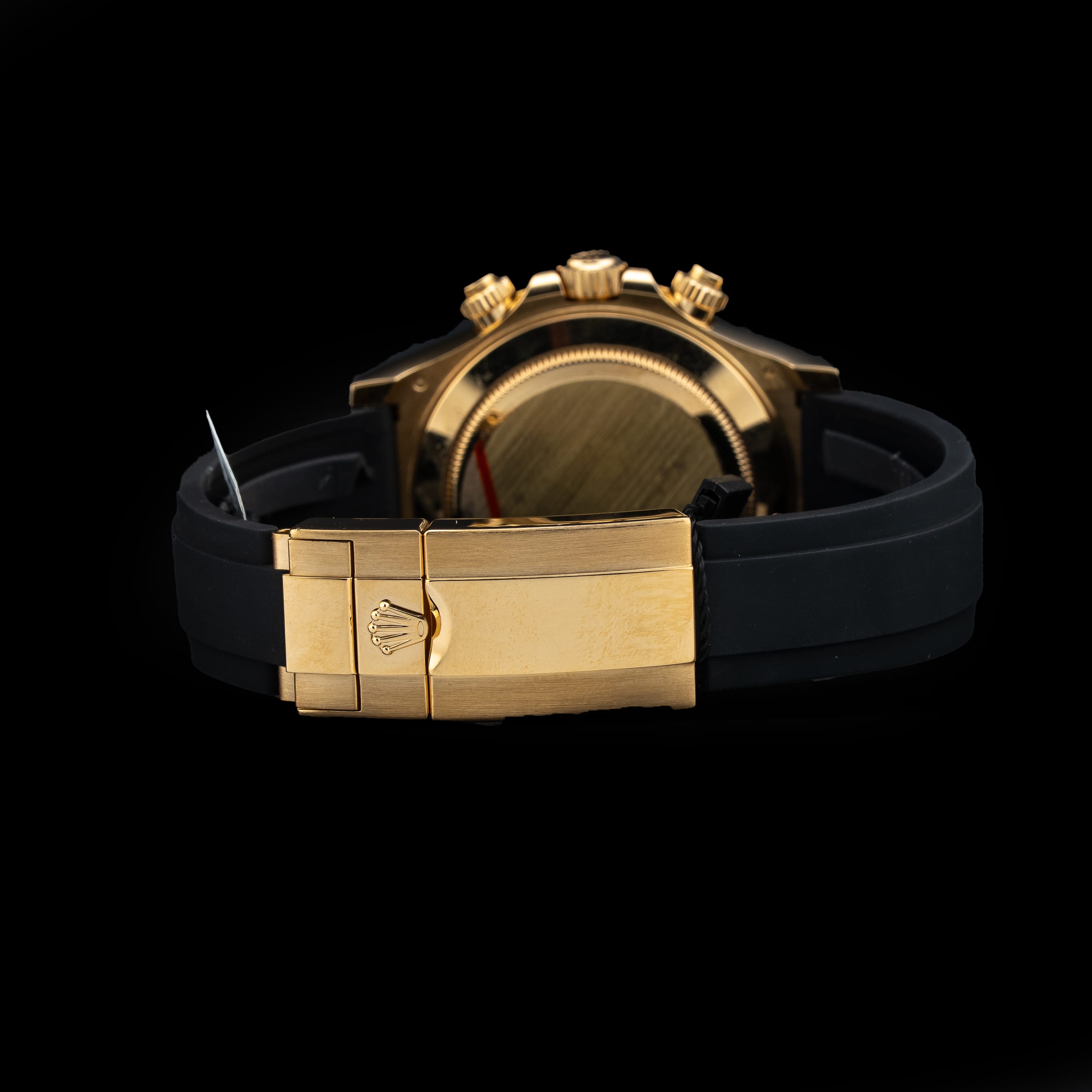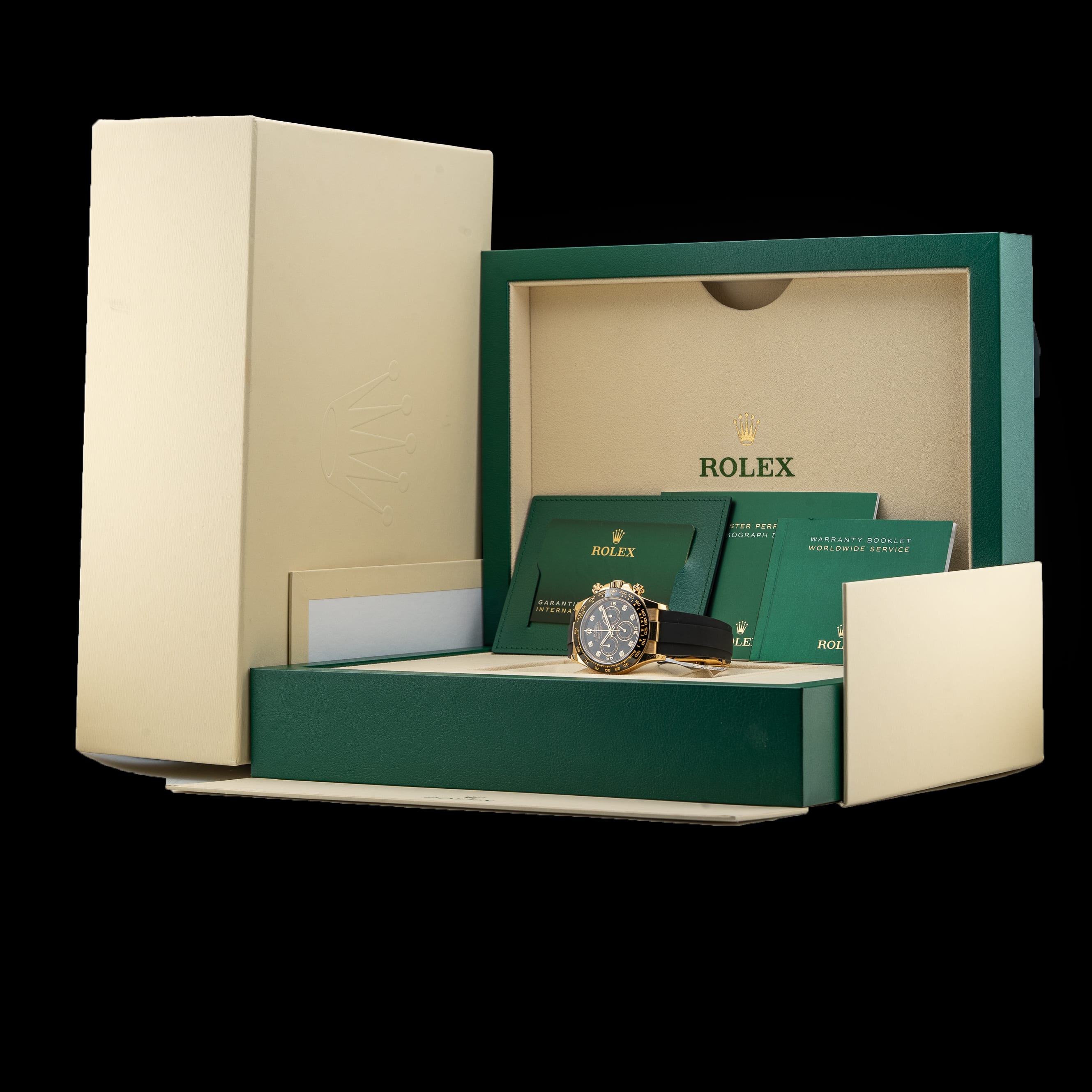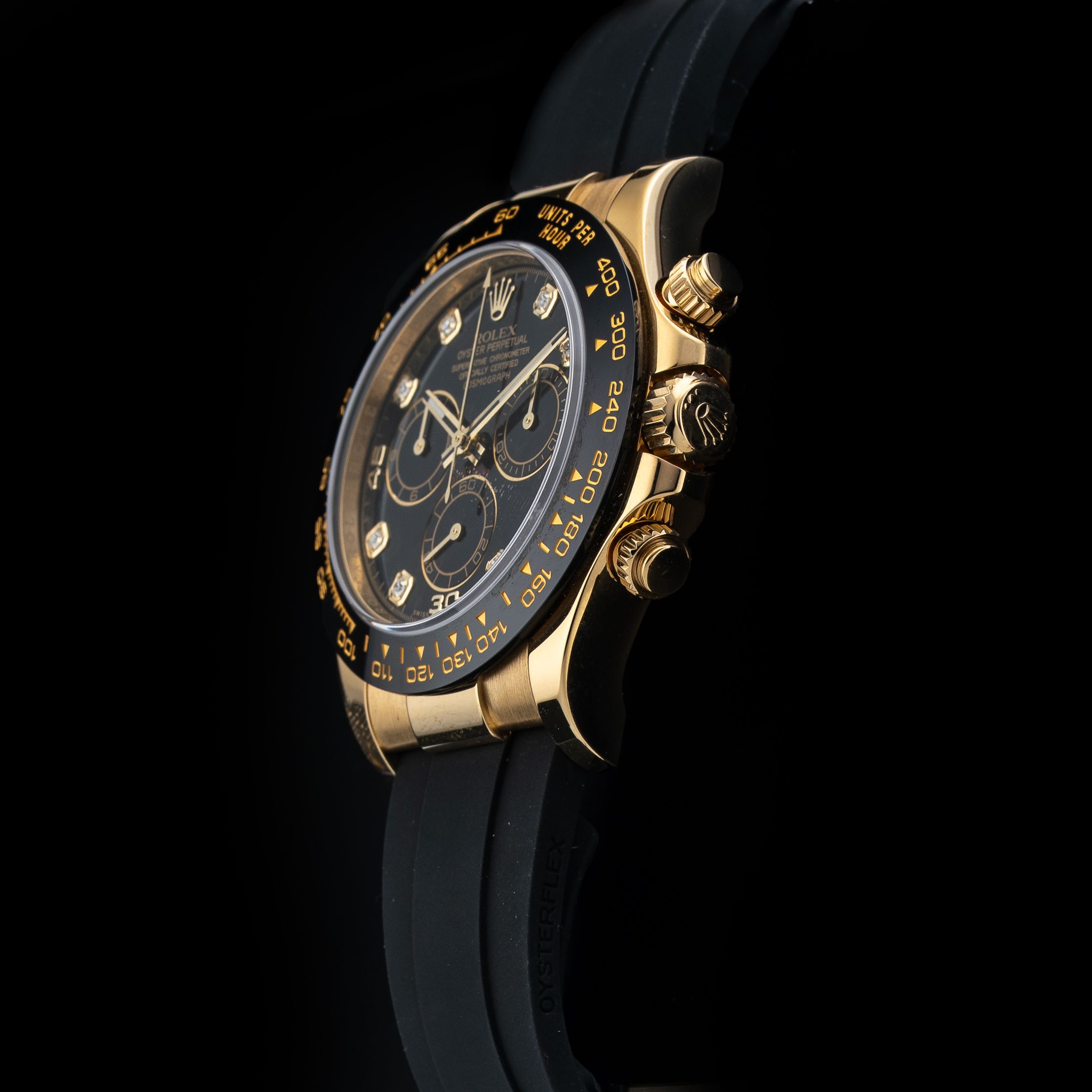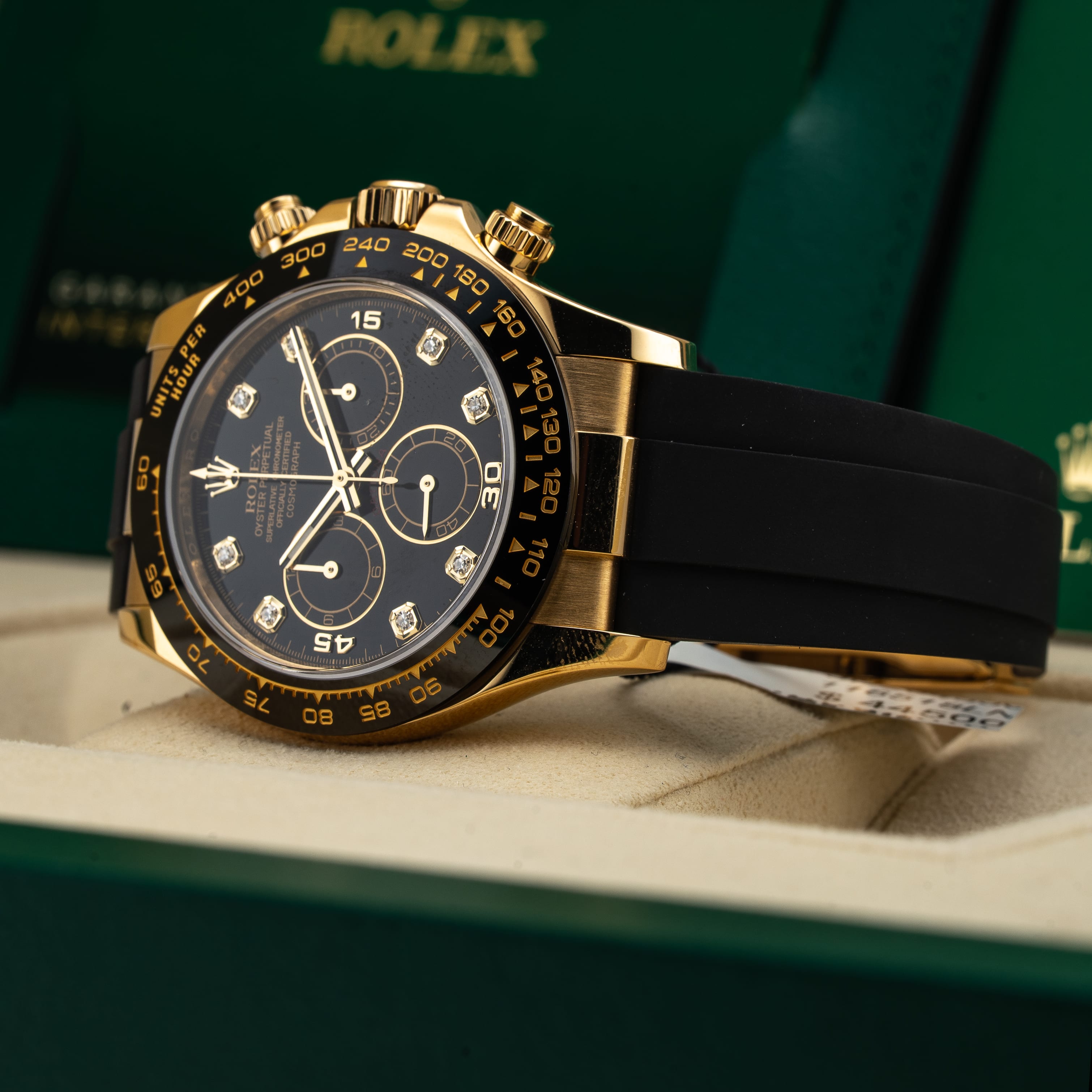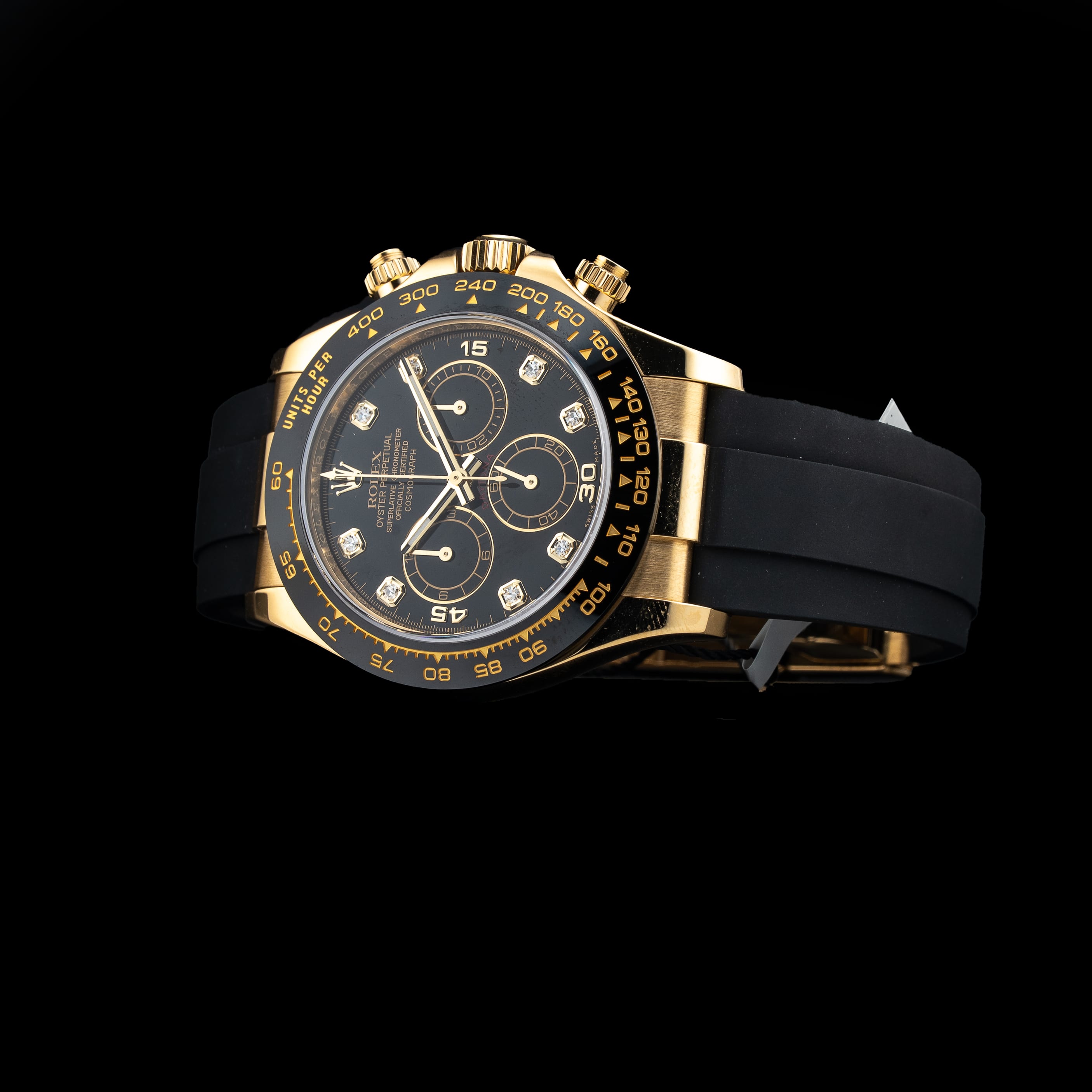 This watch features a 40mm 18k yellow gold case on rubber strap. This watch also sports a black dial. Powered by a mechanical automatic movement. Water resistance up to 100 meters.