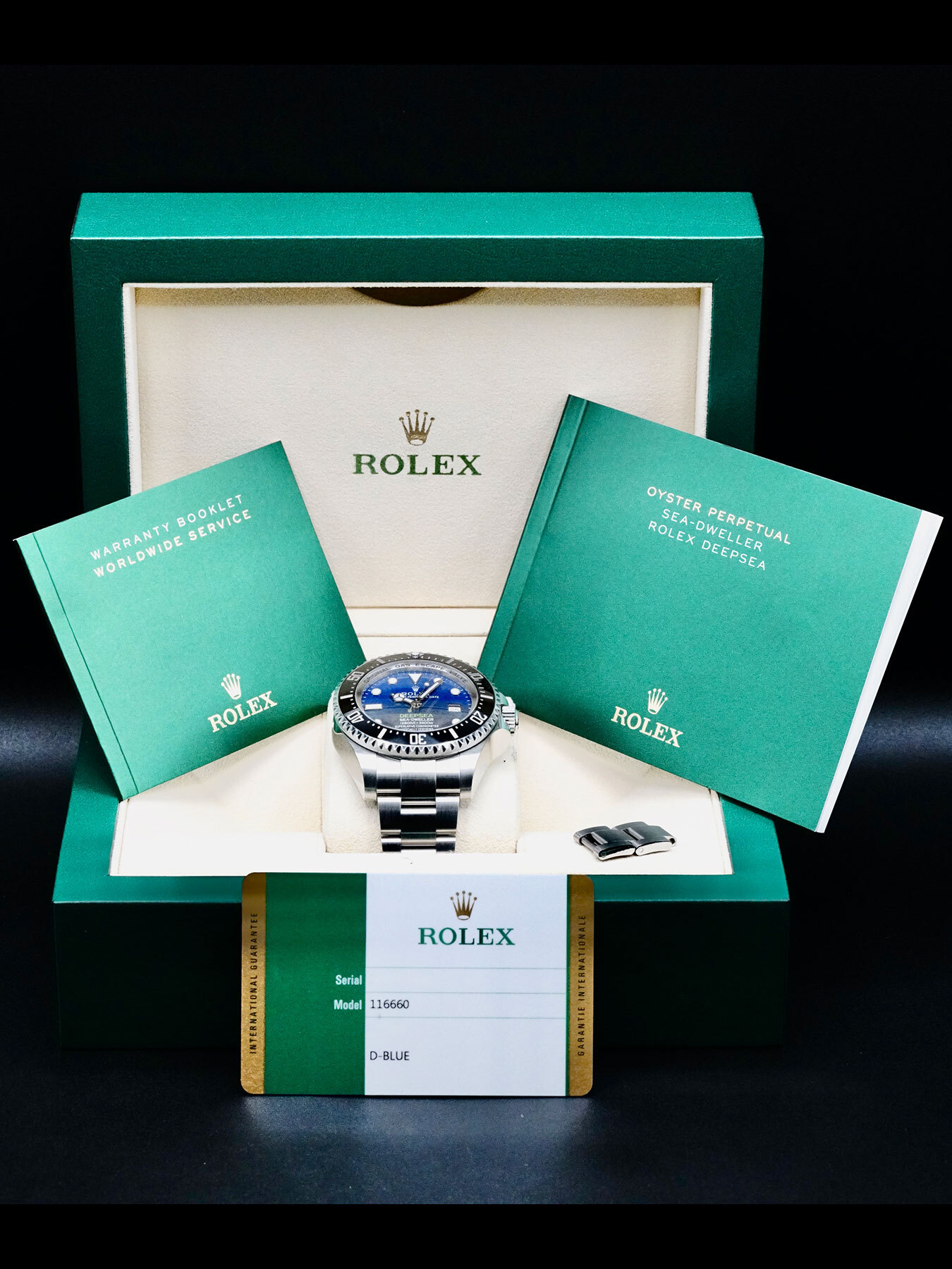 This Rolex 116660 Deepsea James Cameron is in EXCELLENT condition. This watch includes its Original Box, Warranty Card Dated 2017 and Extra Links. This Rolex watch has been fully authenticated and certified by a 3rd party organization. You’ll receive the certificate of authenticity with your purchase.