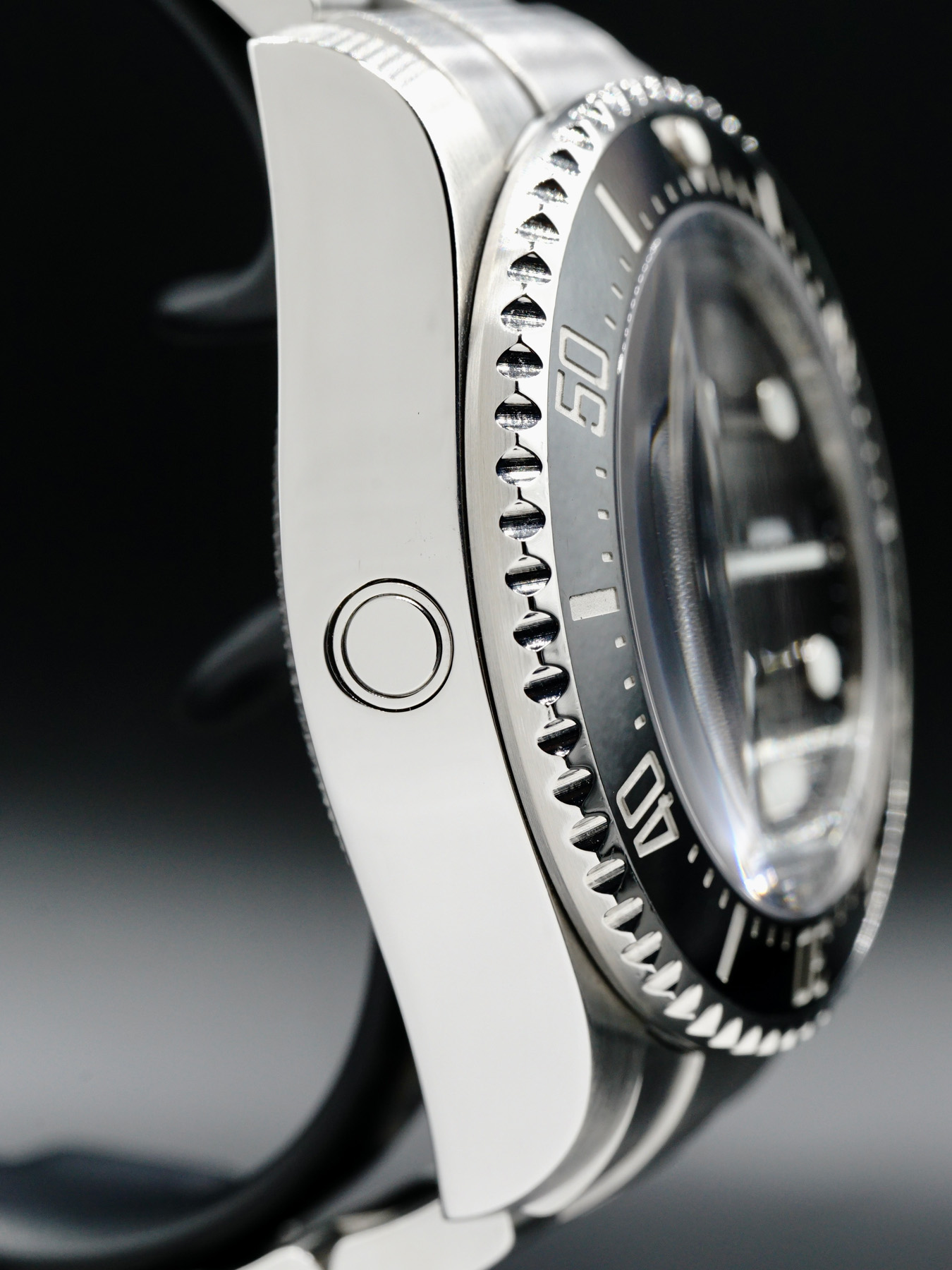 This watch features a 44mm stainless steel case on stainless steel bracelet. This watch also sports a black dial. Powered by a mechanical automatic movement. Water resistance up to 3900 meters.