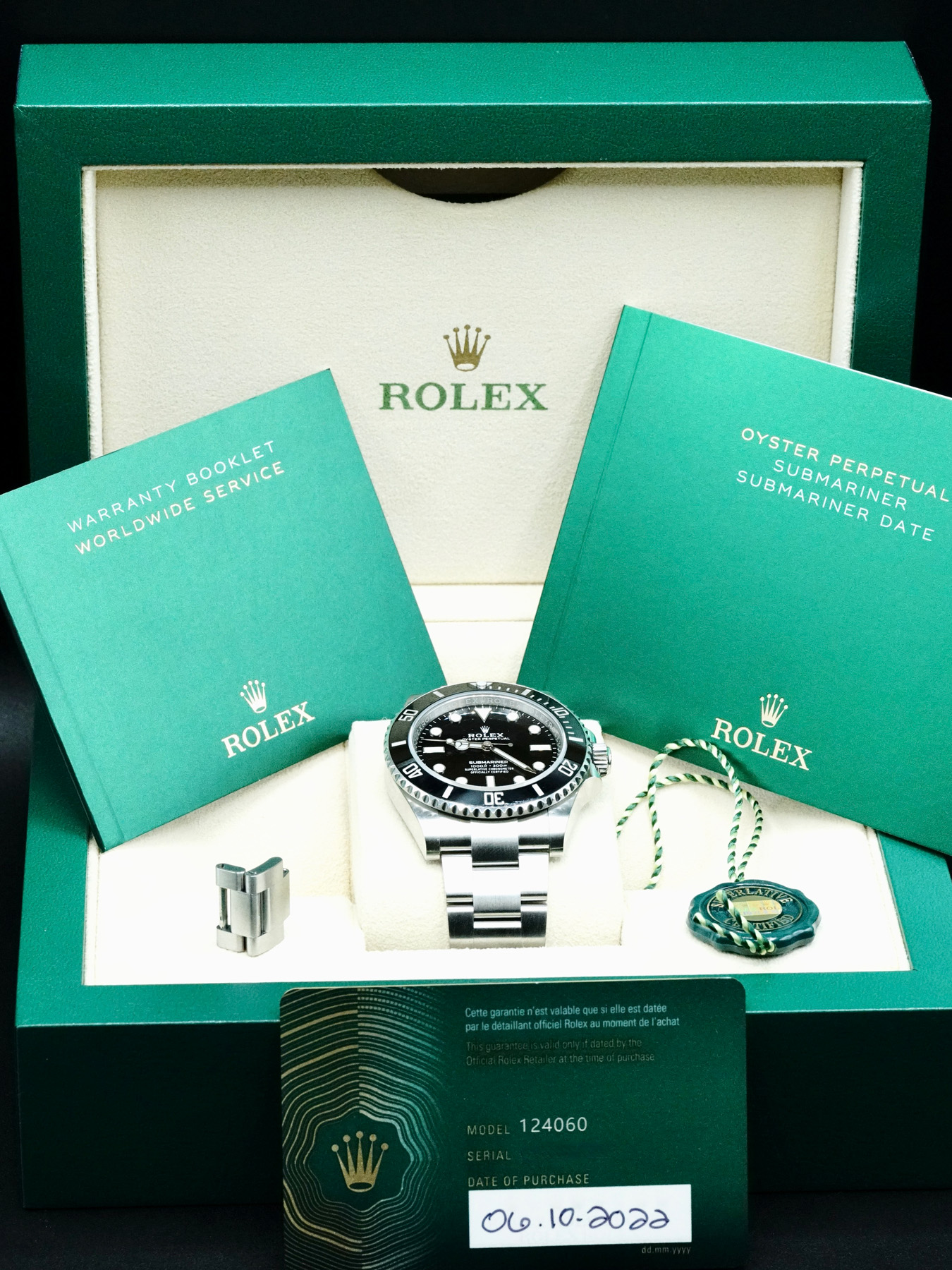 This Rolex Submariner 124060 is in EXCELLENT condition. This watch includes its original box, original papers, and warranty card dated for 06.10.2022. Extra bracelet links. This Rolex watch has been fully authenticated and certified by a 3rd party organization. You’ll receive the certificate of authenticity with your purchase.