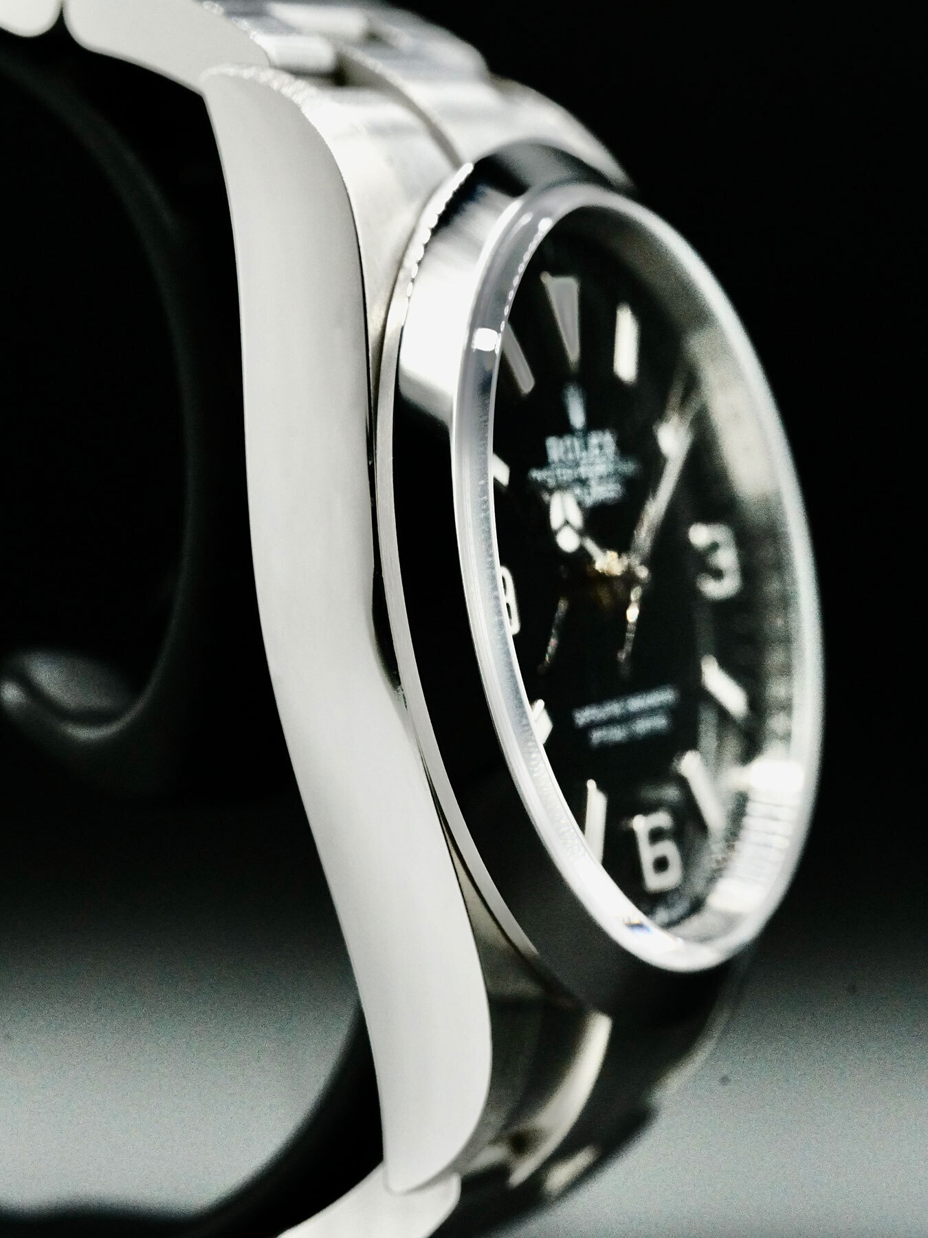 This Rolex Explorer features a 36mm oystersteel case with a solid case back on an oystersteel bracelet. This watch also sports a black dial and a highly legible Chromalight display with long-lasting blue luminescence that is covered by scratch-resistant sapphire crystal.