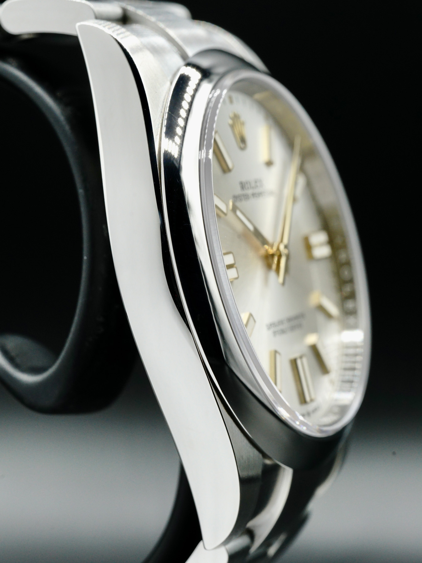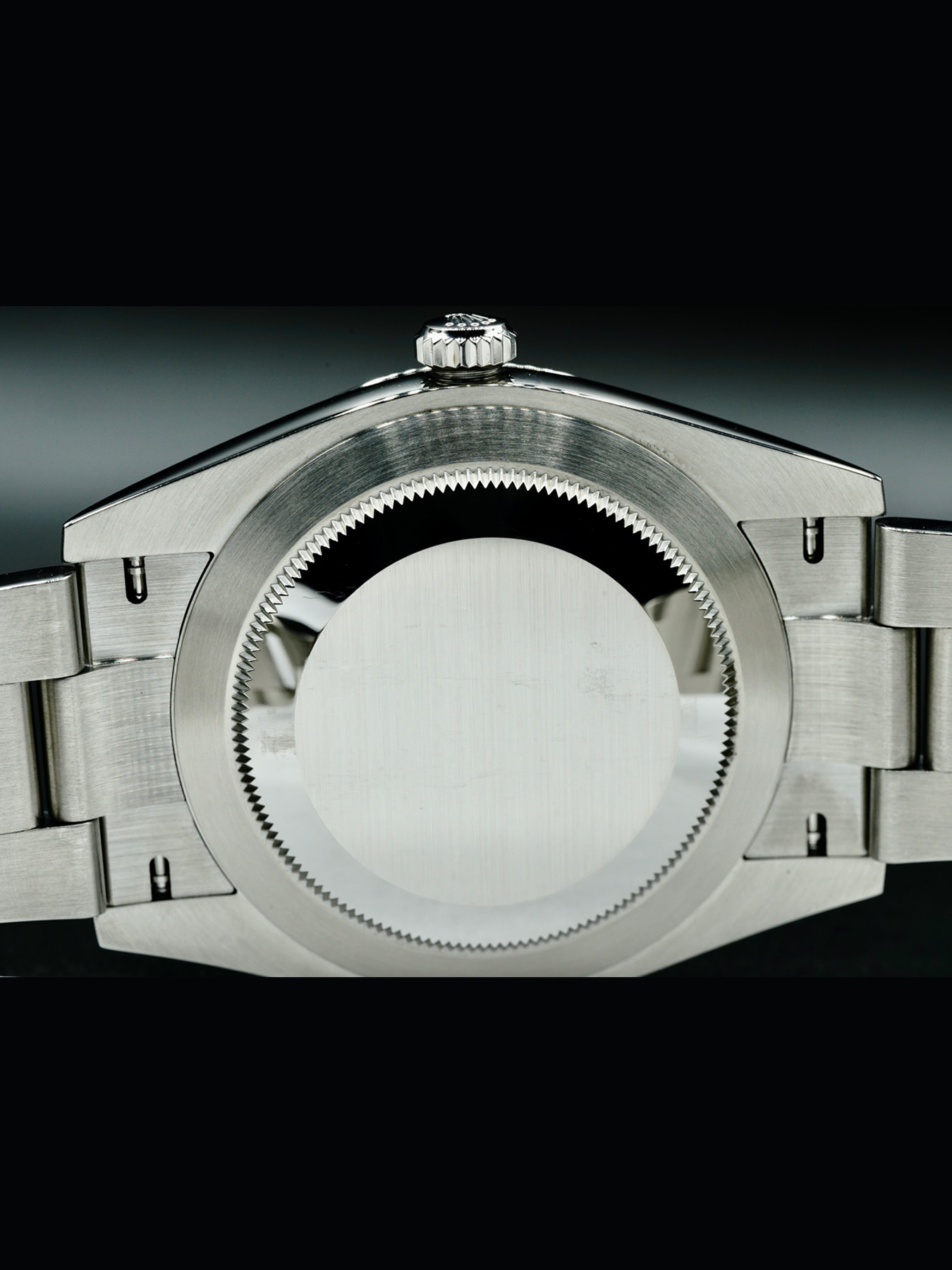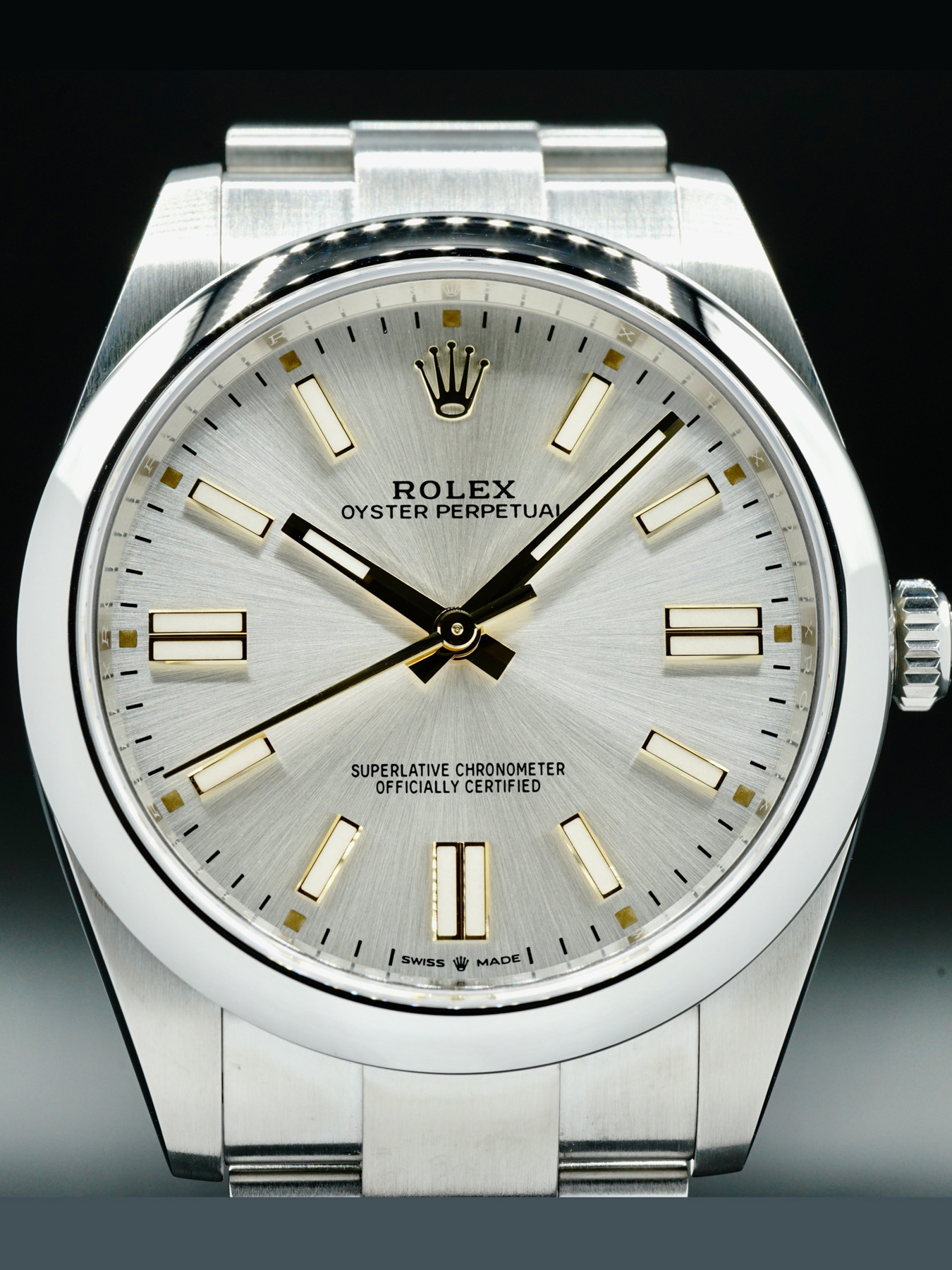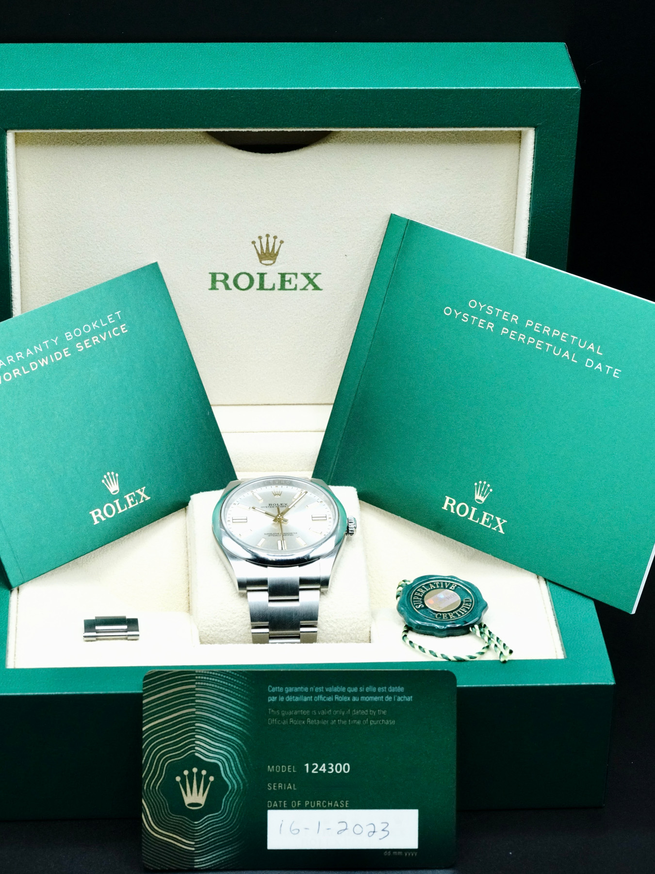 This Rolex Oyster Perpetual 124300 features a 41mm Stainless Steel case with solid caseback, steel bracelet. This watch also sports a silver dial with luminous hands and indexes.