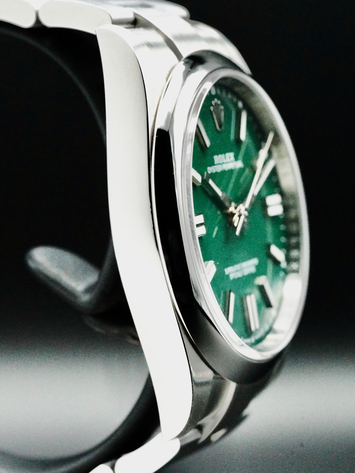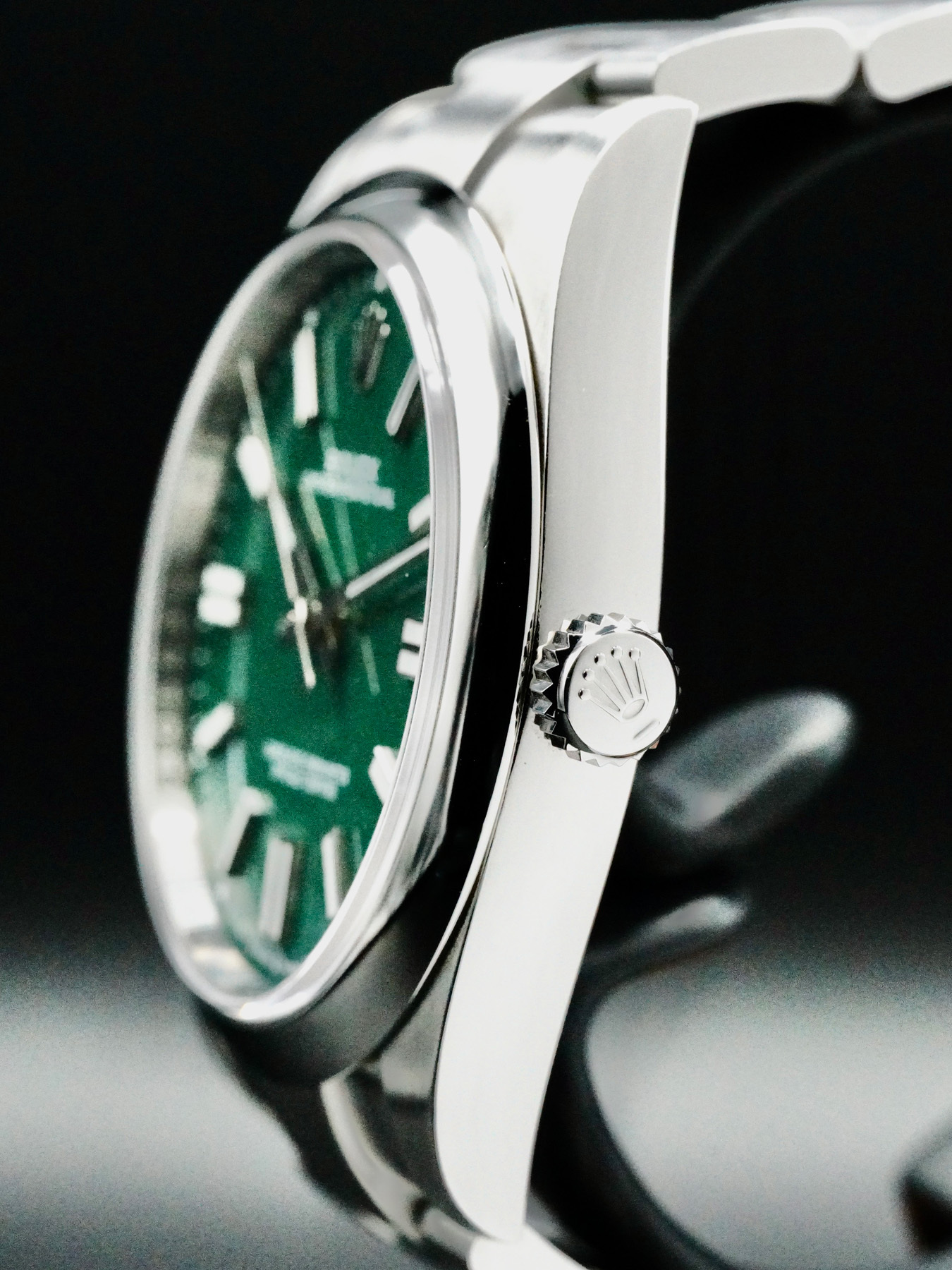 This Rolex Oyster Perpetual features a 41mm stainless steel case with a solid case back on a stainless steel bracelet. This watch also sports a green dial with luminous hands and index dial markers covered by scratch resistant sapphire crystal.