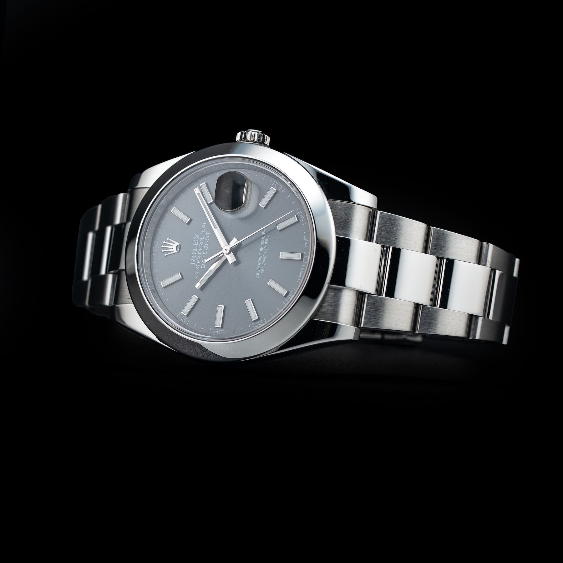 This watch features a 41mm stainless steel case on stainless steel bracelet. This watch also sports a grey dial. Powered by a mechanical automatic movement. Water resistance up to 100 meters.