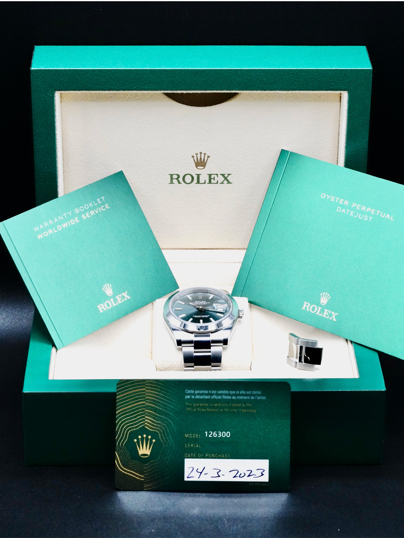 This Rolex 126300 Datejust is in EXCELLENT condition. This watch includes its Original Box, Original Papers and Warranty Card dated 2023. Extra stainless steel bracelet links. This Rolex watch has been fully authenticated and certified by a 3rd party organization. You’ll receive the certificate of authenticity with your purchase.
