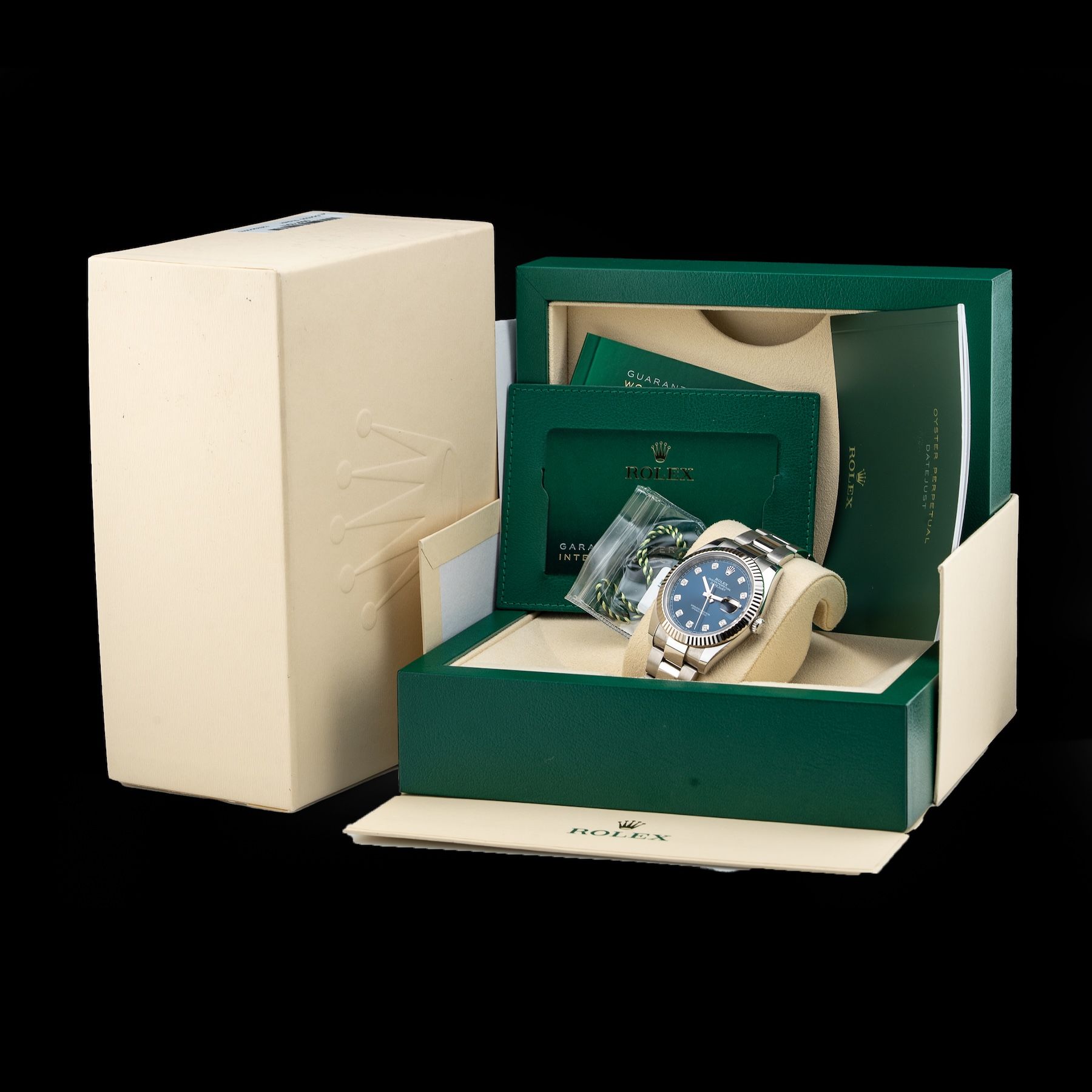 This watch features a 41mm oystersteel case on oystersteel bracelet. This watch also sports a blue dial. Powered by a perpetual, mechanical, self-winding movement. Water resistance up to 100 meters.