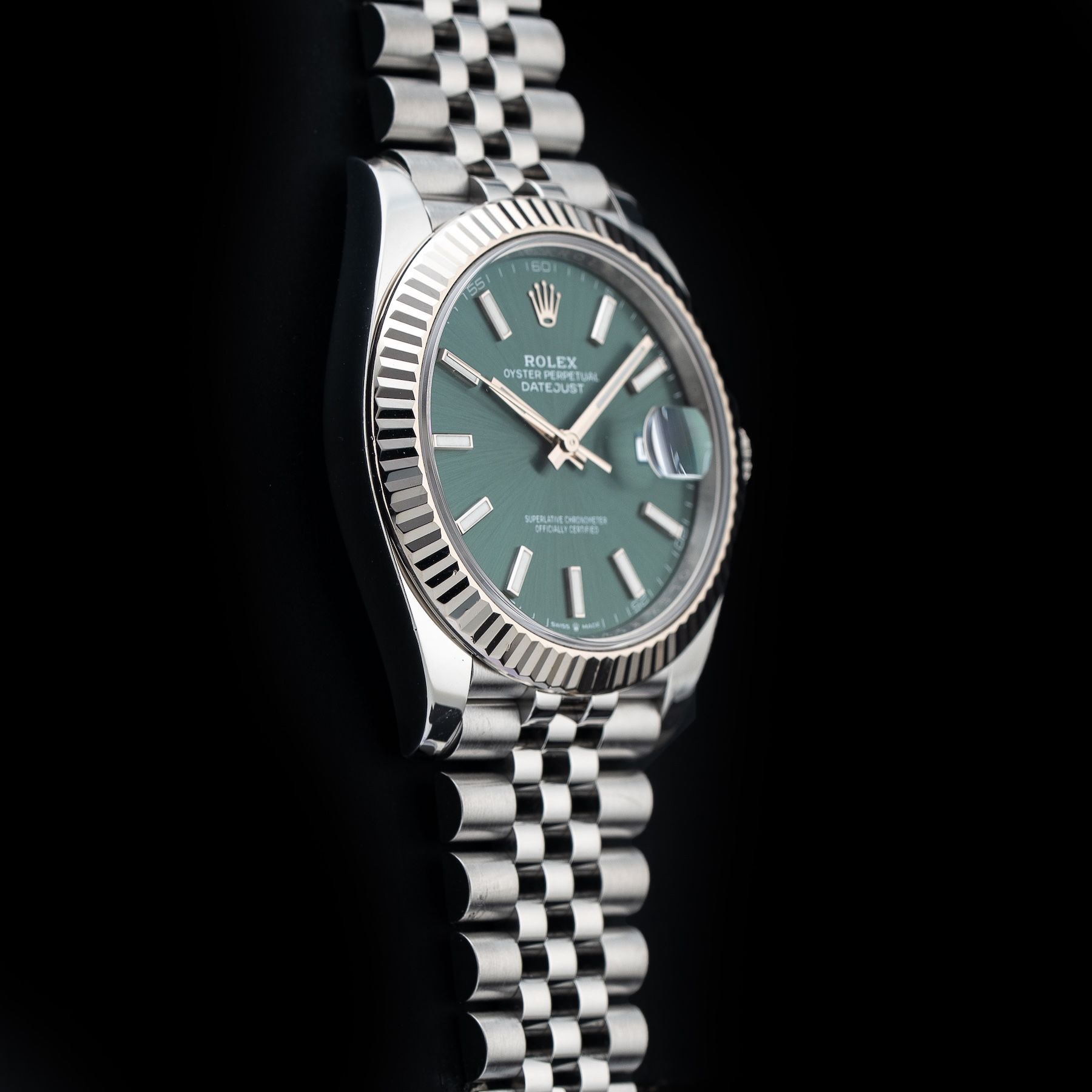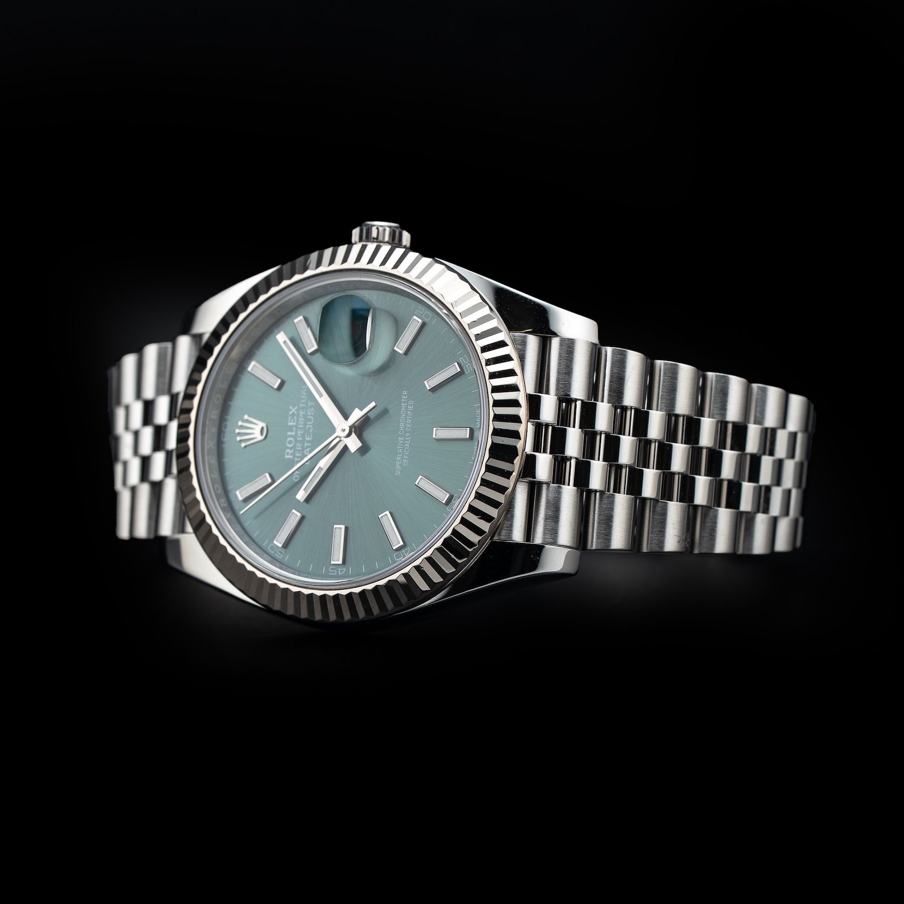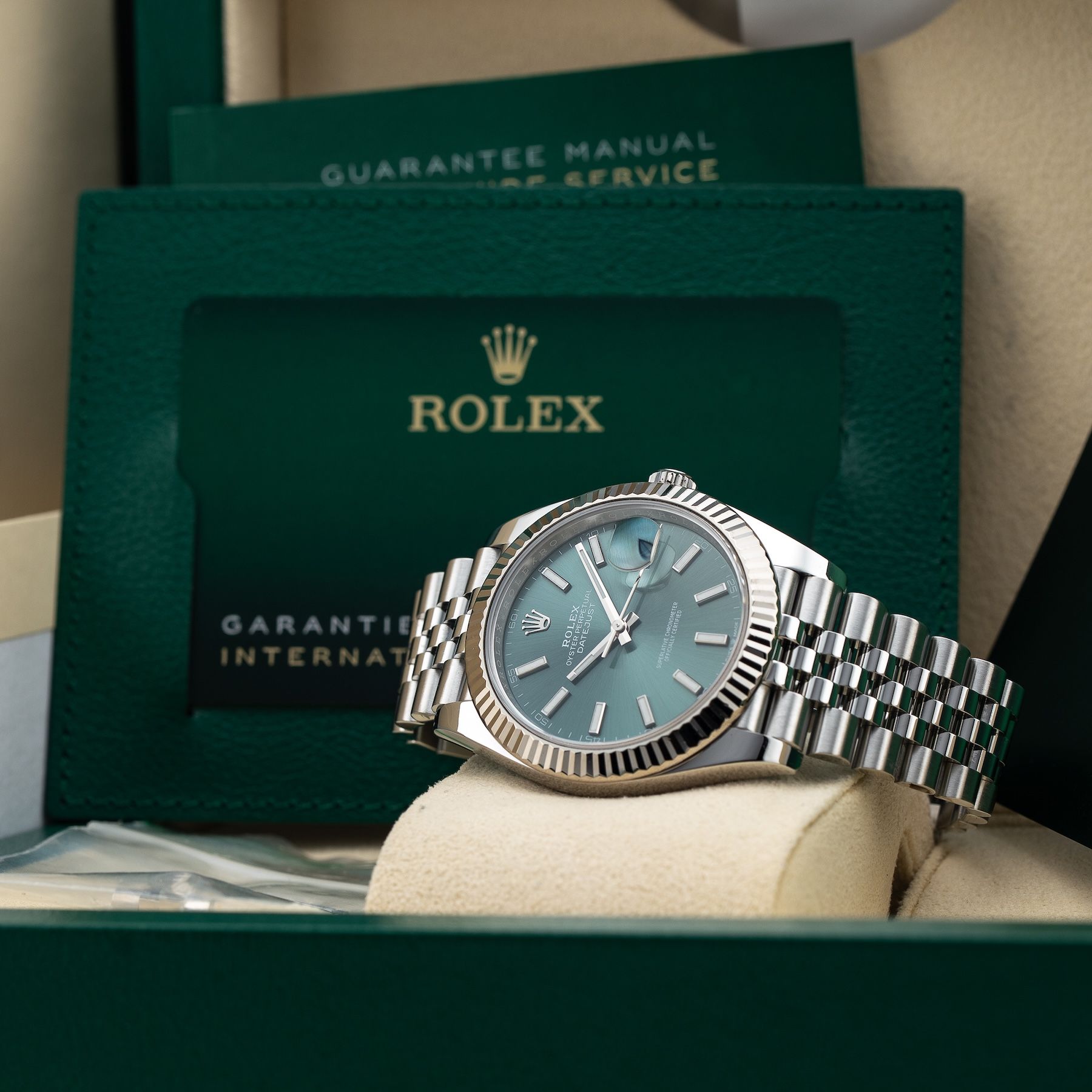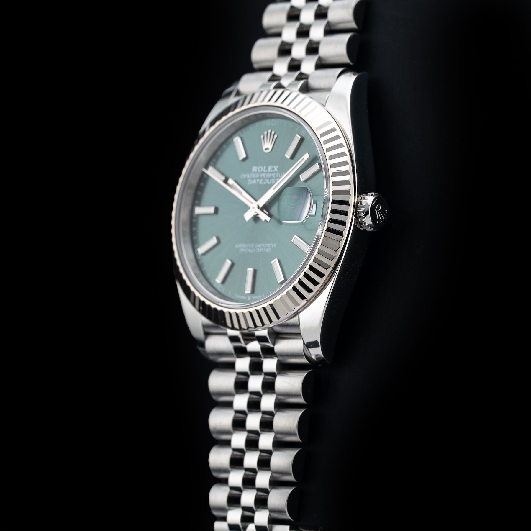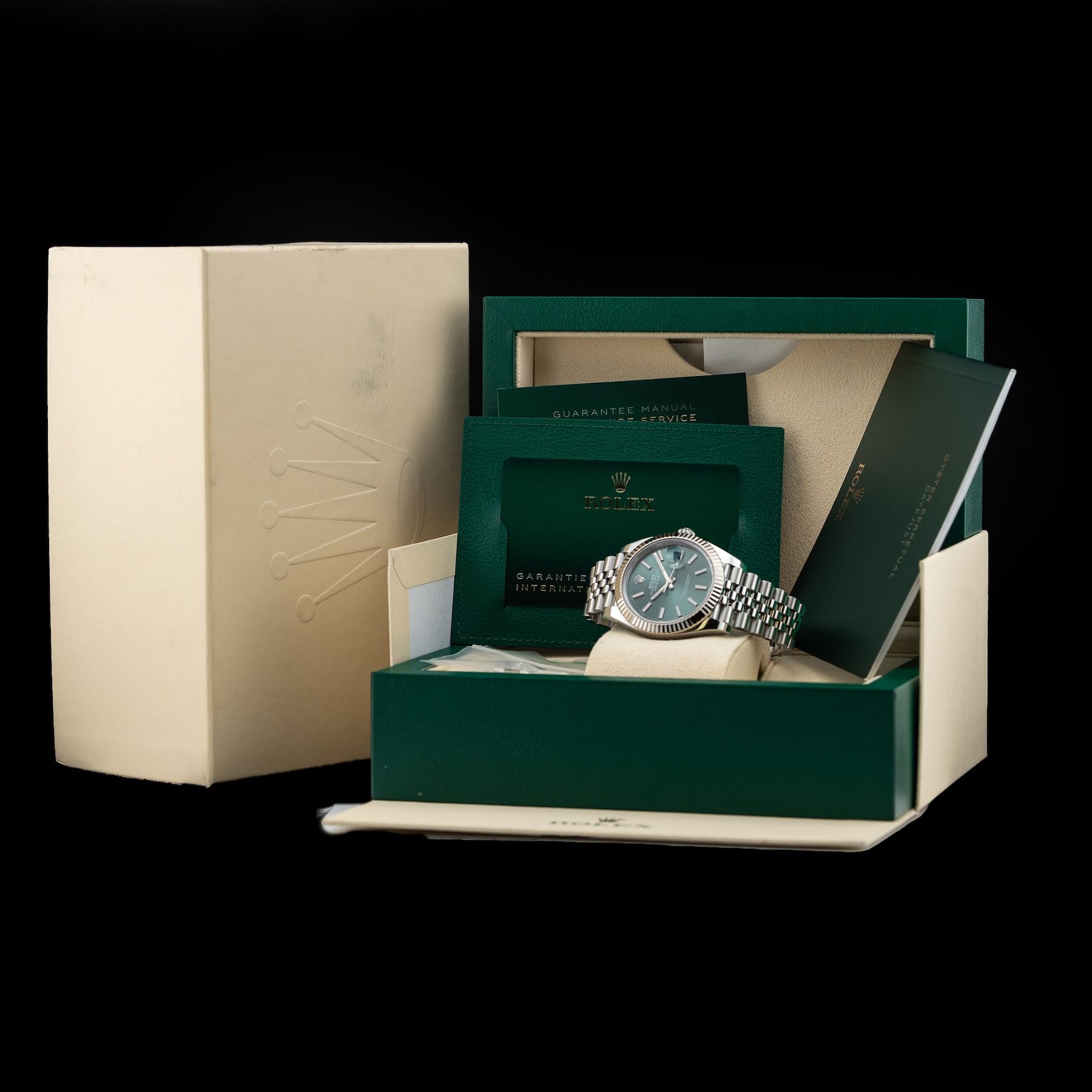 This Rolex 126334-0028 Date Just 41 Mint Green is in GREAT condition. This watch includes its Original Box, Original Papers and Warranty Card Dated 05/14/2023. This Rolex watch has been fully authenticated and certified by a 3rd party organization. You’ll receive the certificate of authenticity with your purchase. Please note, the photos shown are of the actual watch you will receive.