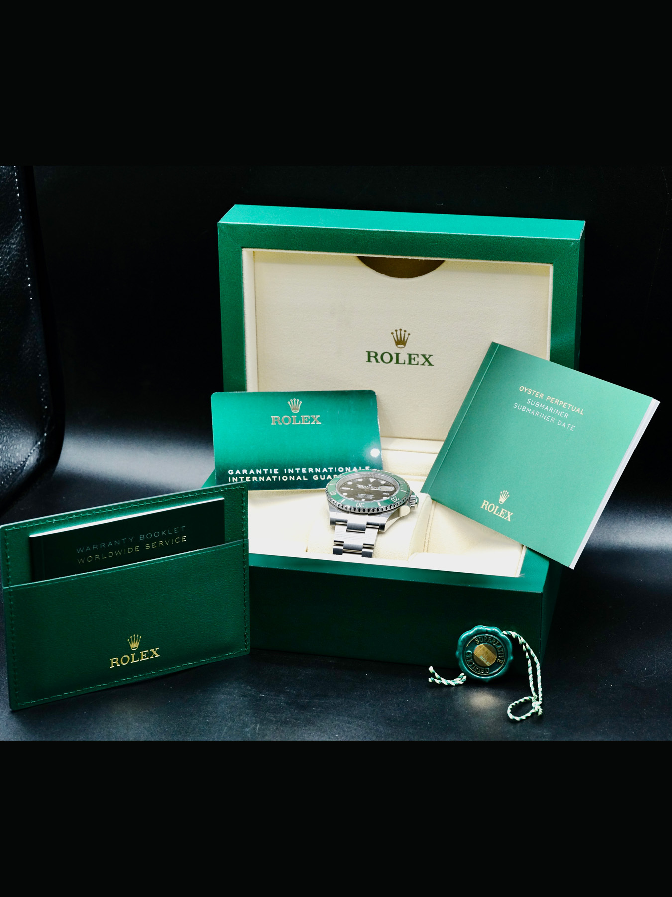This Rolex Submariner Date Kermit 126610LV is in EXCELLENT condition. This watch includes its original box, instruction manual, worldwide service booklet, and international guarantee card dated for April 2021.