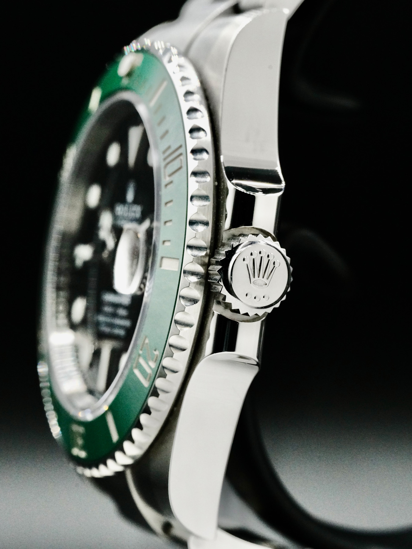 This Rolex Submariner Date "Kermit" features a 41mm stainless steel case with a solid case back on a stainless steel bracelet. The bezel consists of stainless steel with a green ceramic ring and unidirectional rotation. This watch also showcases a black dial with luminous silver-tone hands covered by scratch-resistant sapphire crystal.